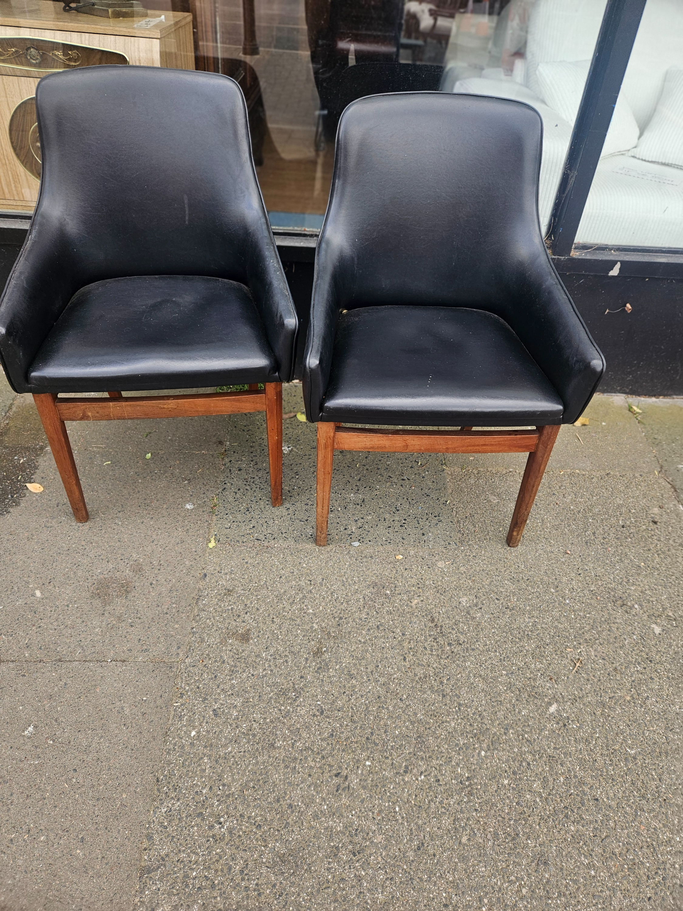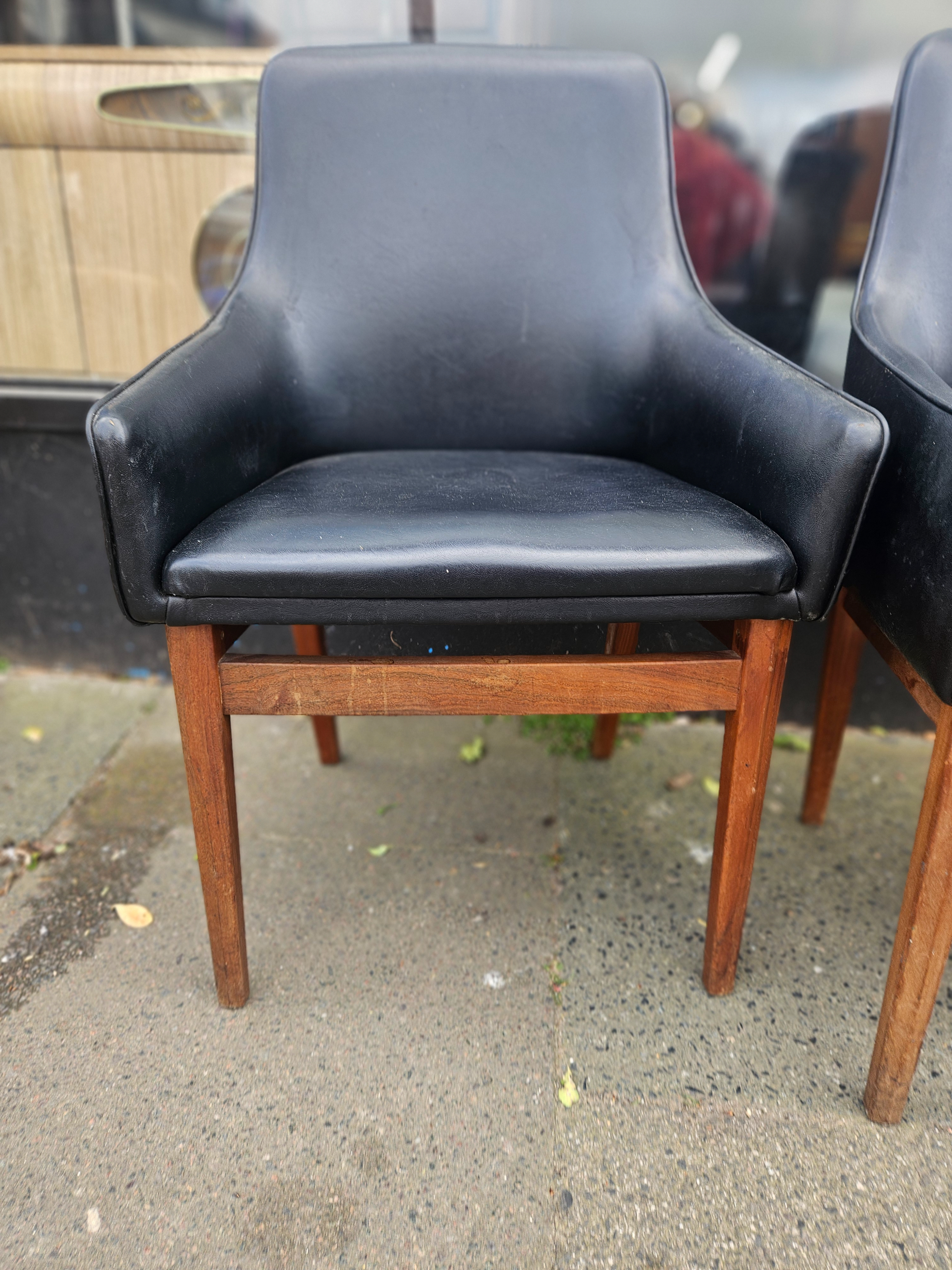 A pair of armchairs designed in the Mid-Century Modern style, dating from the mid-20th century. Each chair features a continuous moulded shell forming the backrest and integral armrests, upholstered in black vinyl. The seats consist of separate, fitted padded cushions in matching material. The upholstered shells are mounted onto hardwood frames, likely teak, characterised by square-section tapered legs and straight side stretchers. The construction displays visible straight-grain joinery. No maker marks, labels, or stamps are visible on the exterior surfaces or the wooden frames. The design reflects the Danish modern aesthetic common in British furniture production during the 1960s and 1970s.