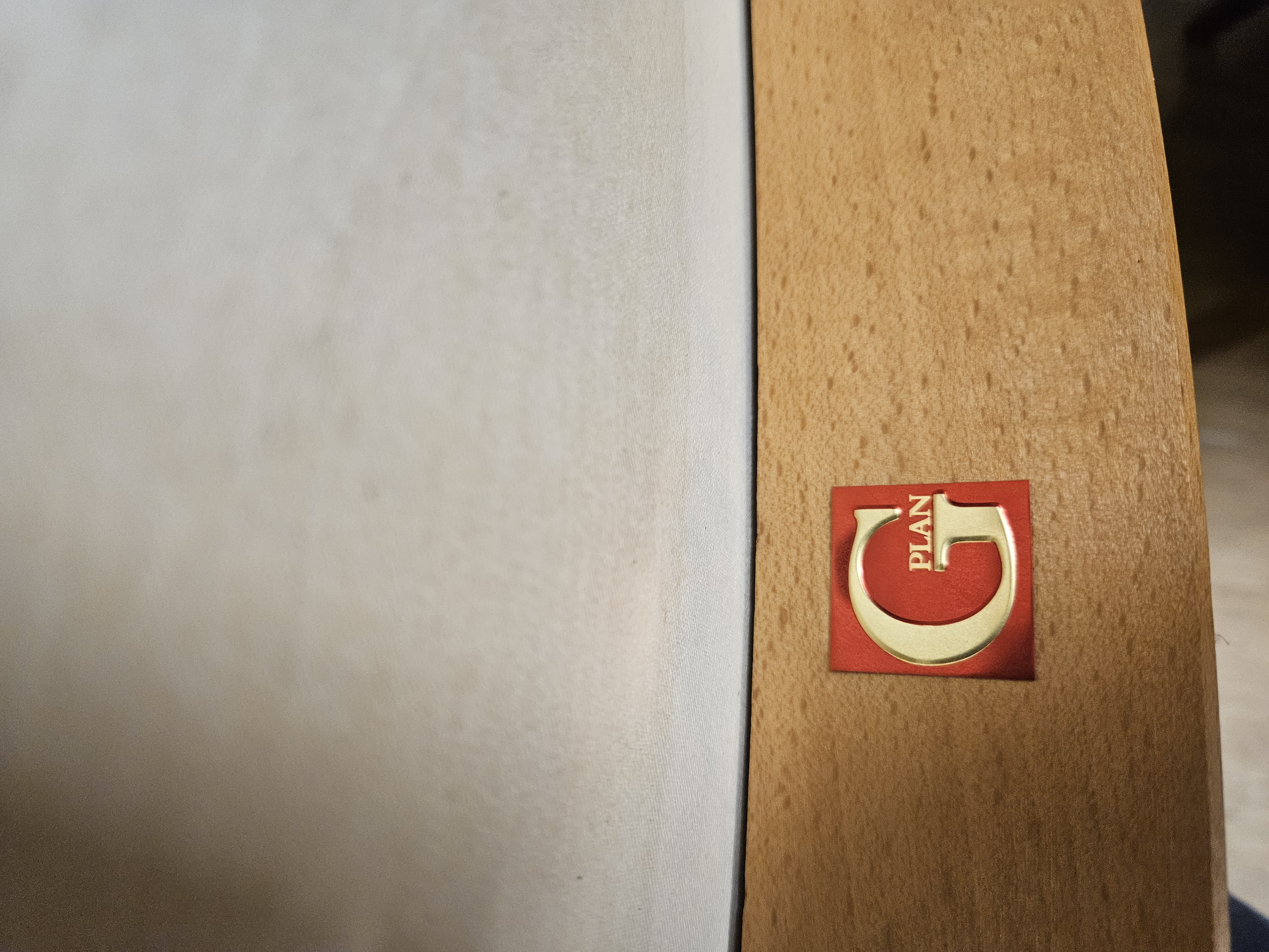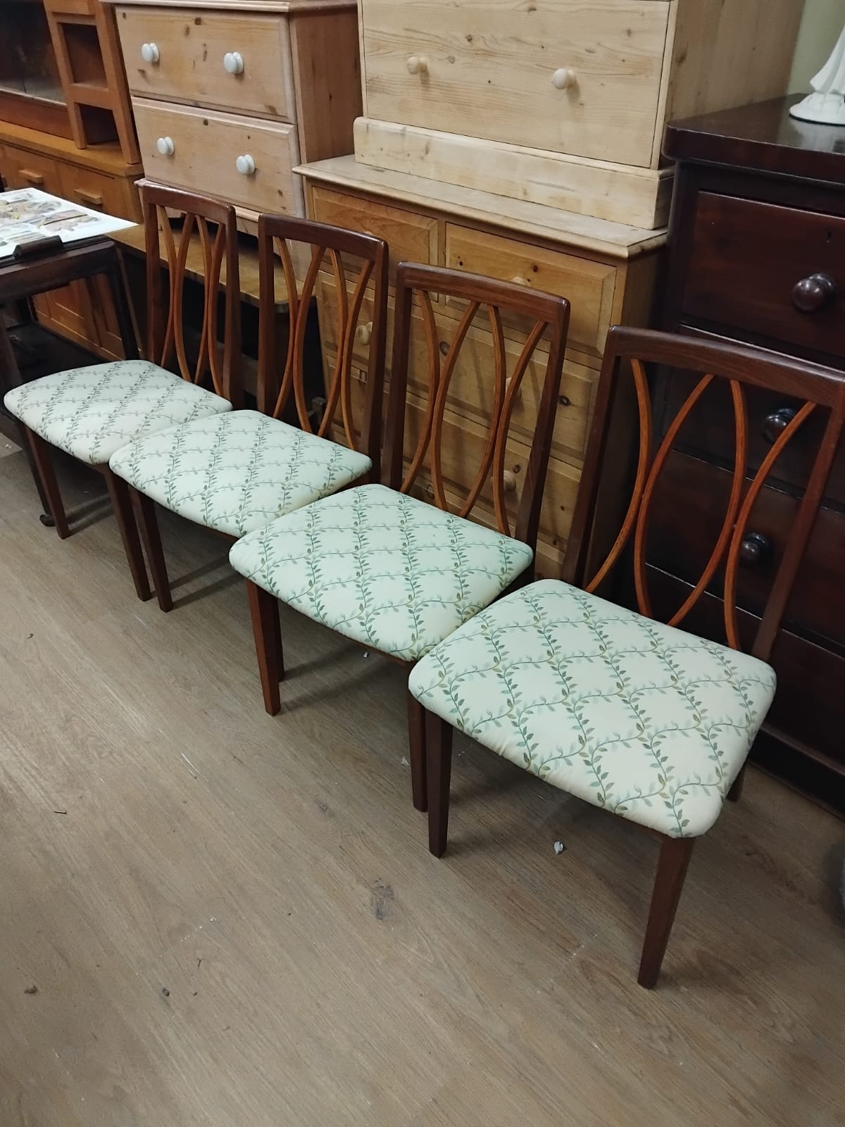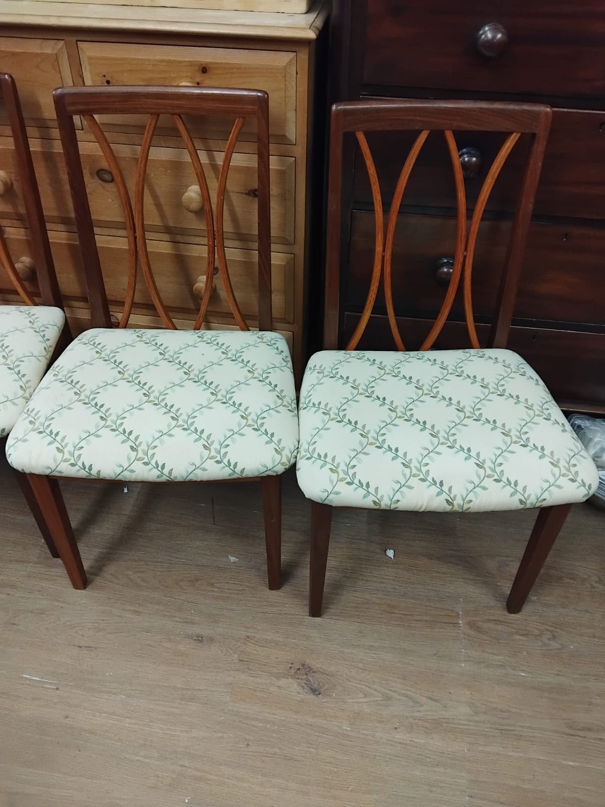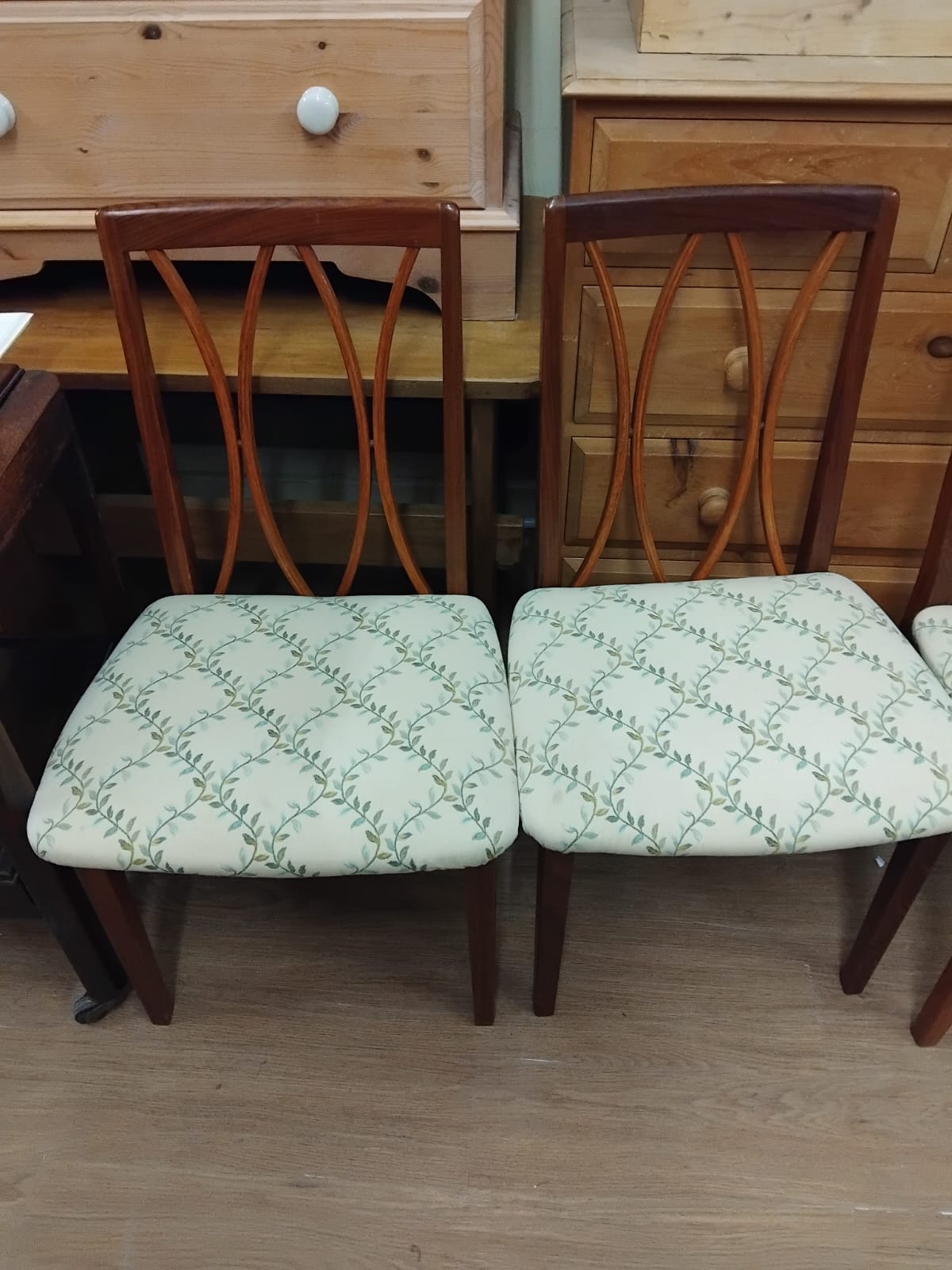 A set of four mid-century modern teak dining side chairs manufactured by G-Plan (E. Gomme Ltd). The chairs are from the Fresco range, designed by Victor Wilkins circa the late 1960s. Each chair features a rectangular back frame containing three interlacing arched back splats. The frames are constructed from teak with a medium-brown finish and are raised on four tapered legs. The drop-in padded seats have been reupholstered in a contemporary cream-coloured fabric decorated with a green trailing leaf and vine trellis pattern. A square red and gold label with the letter G and the word PLAN is present on the underside of the seat frame.