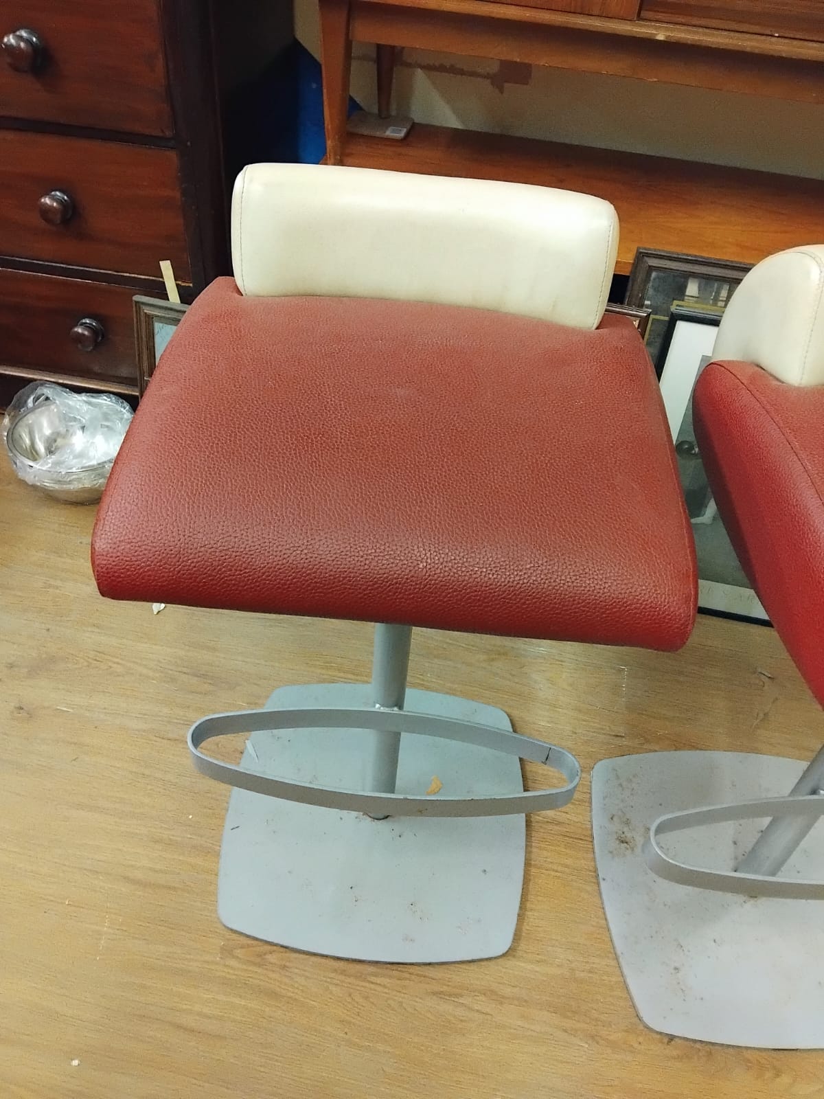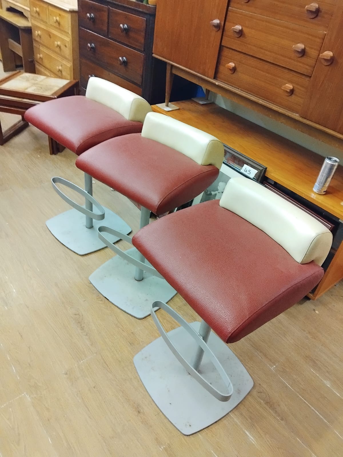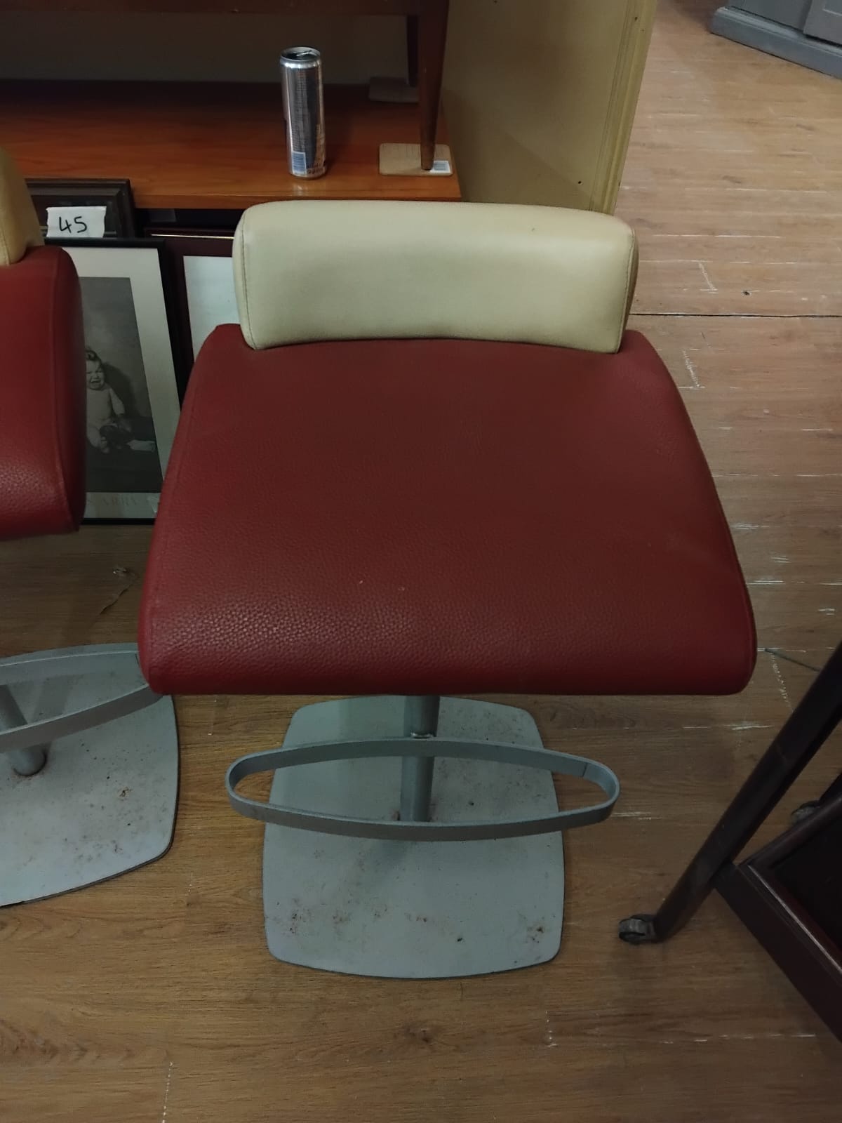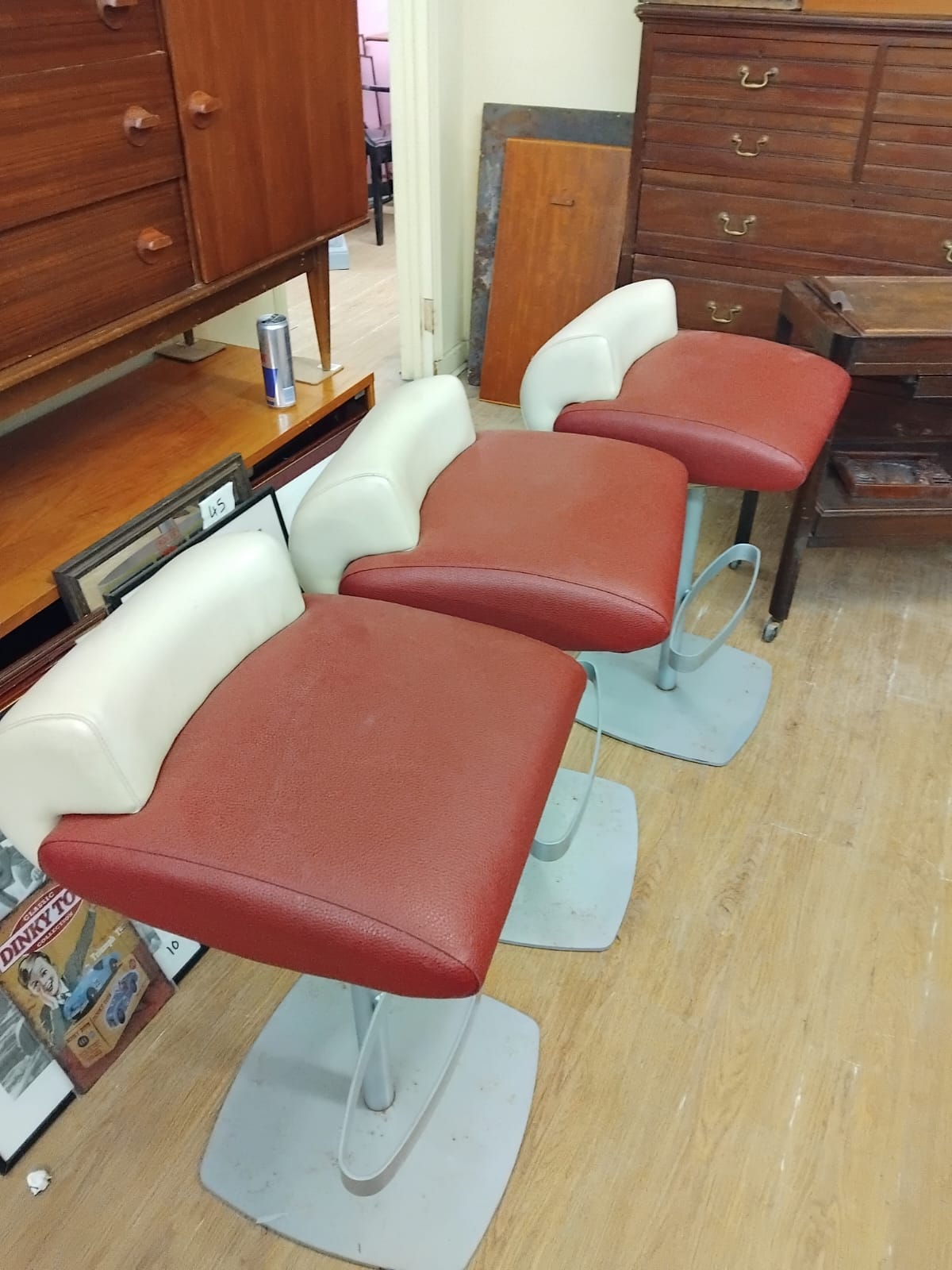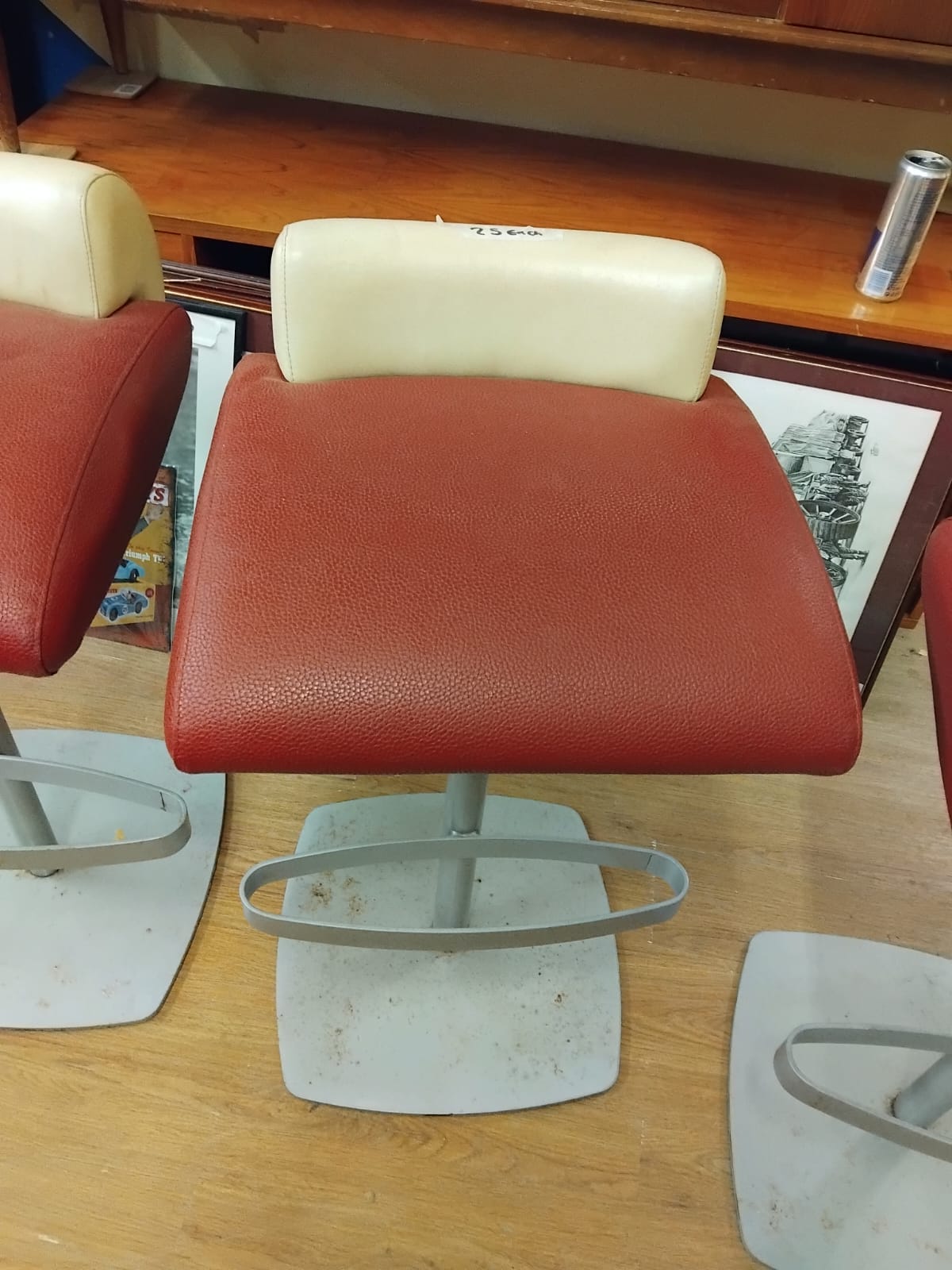 Three contemporary pedestal bar stools. Each stool features a broad, padded seat upholstered in a red textured faux leather, complemented by a contrasting cream-coloured low-profile backrest. The seats are supported by grey-finished metal pedestals, each fitted with an integral oval-shaped footrest. Each stool rests on a square-form metal base plate with rounded corners. No manufacturer’s marks or brand names are visible on the base or body of the items. One stool retains a temporary white adhesive price label on the backrest.