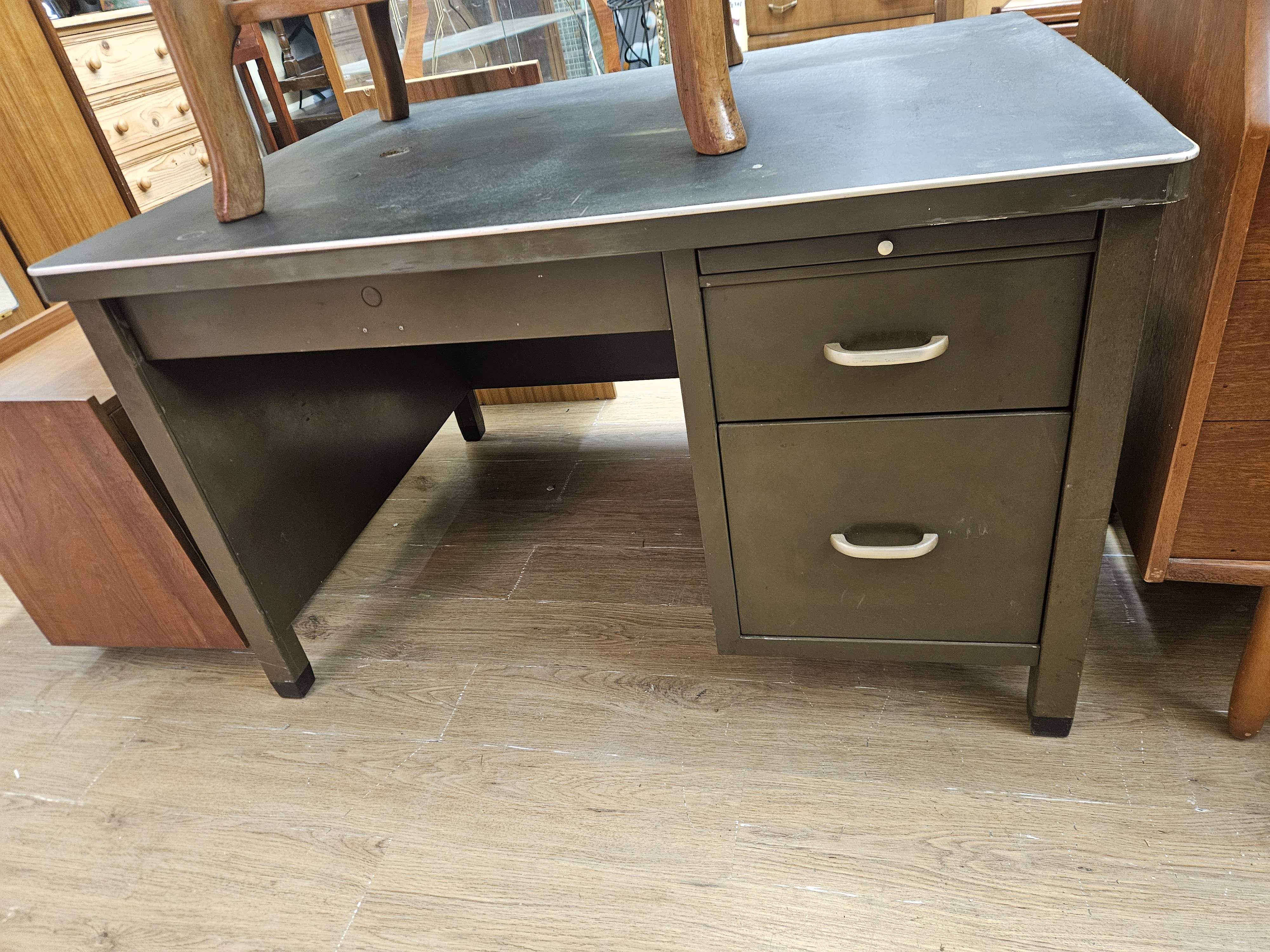 A mid-20th century industrial single-pedestal desk in the tanker style, likely of British manufacture. The carcass is constructed from pressed steel with a dark olive-drab or charcoal grey enamelled finish. The rectangular top features a dark grey linoleum or laminate writing surface finished with a contrasting light-coloured protective metal edge trim. The desk is configured with a single pedestal to the right-hand side containing two drawers, comprising a shallow upper stationery drawer and a deep lower filing drawer. A further shallow frieze drawer is located centrally beneath the writing surface. The drawers are fitted with brushed metal bow-shaped handles. A circular aperture, likely for a lock or a punch-out, is located above the top pedestal drawer; no key is present. The unit stands on square-section legs terminating in black plastic or rubber floor protectors. This style of furniture is frequently associated with manufacturers such as Steelcase, Art Metal, or General Fireproofing.