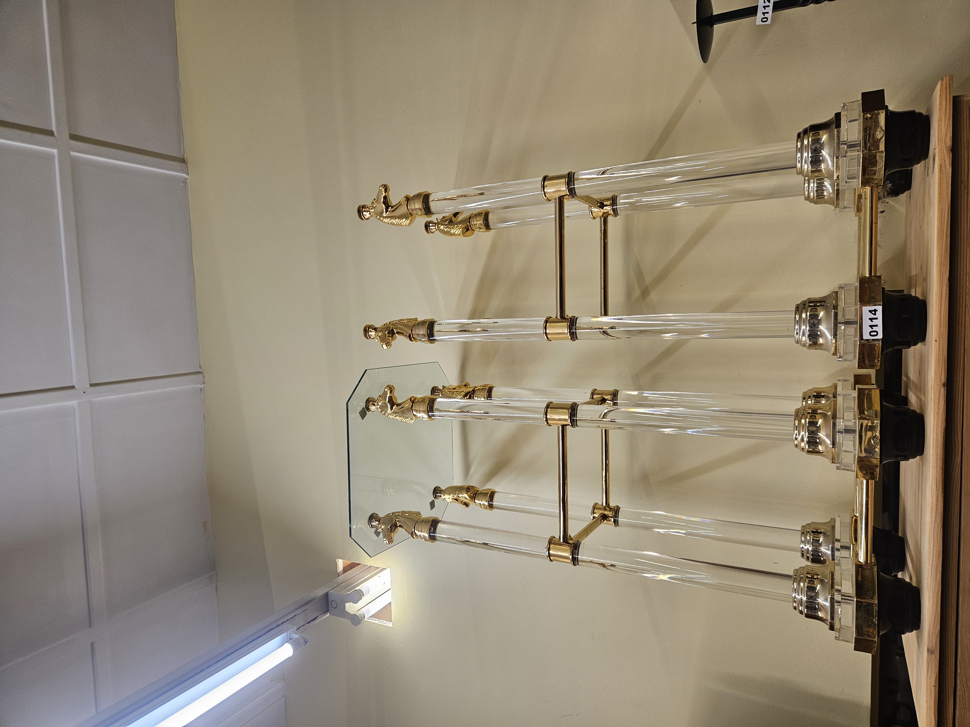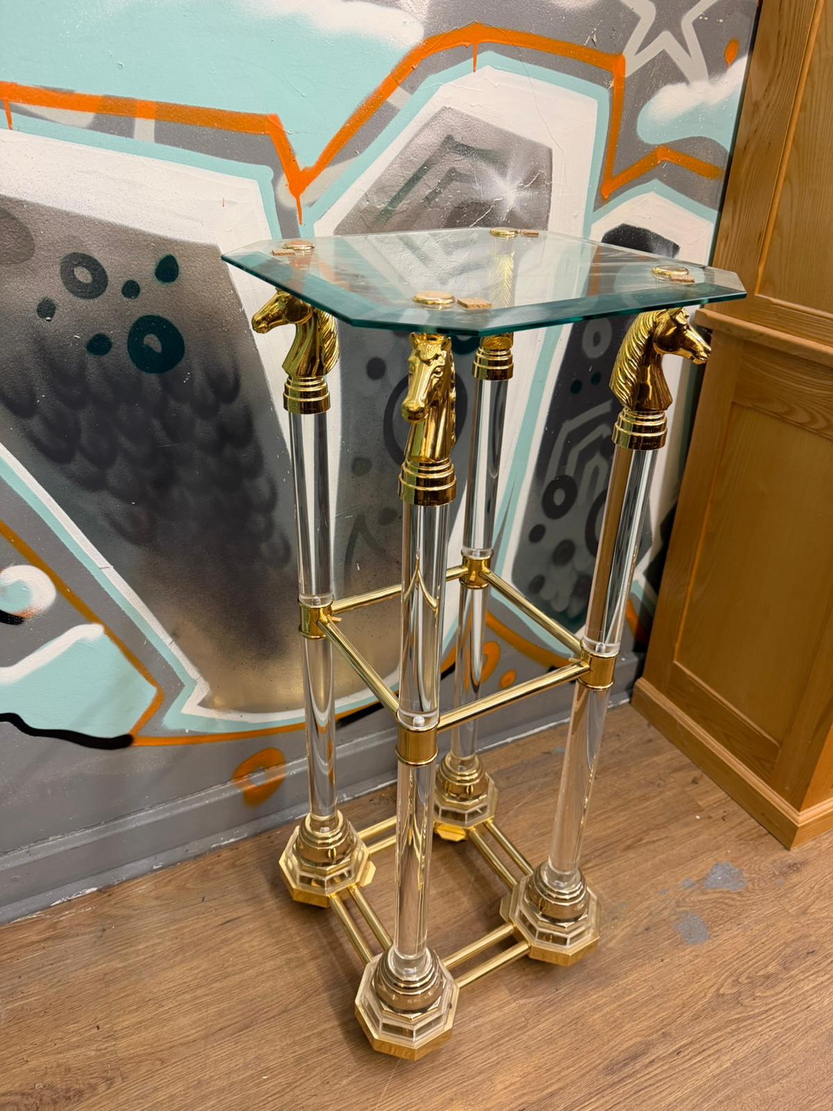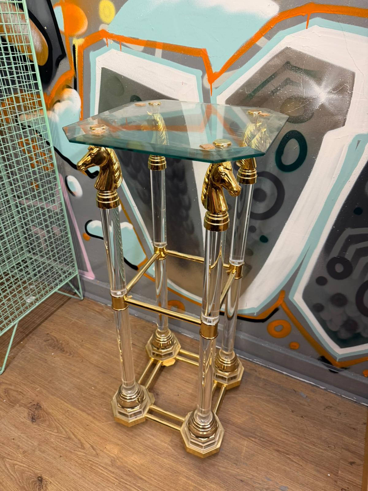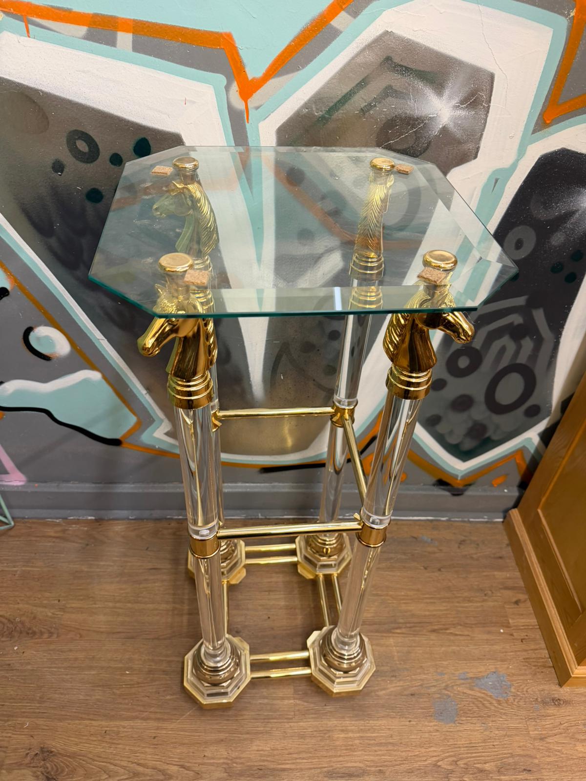 A pair of Hollywood Regency style pedestals, constructed with clear acrylic cylindrical columns and gold-toned metal fittings. Each pedestal features four legs terminating in cast metal horse head finials, which support a beveled octagonal glass top. The legs are stabilised by gold-toned metal cross-bracing and rest on tiered octagonal bases made of acrylic and gold-toned metal. This pair reflects late 20th-century design influences. No maker’s marks, hallmarks, or signatures are visible.