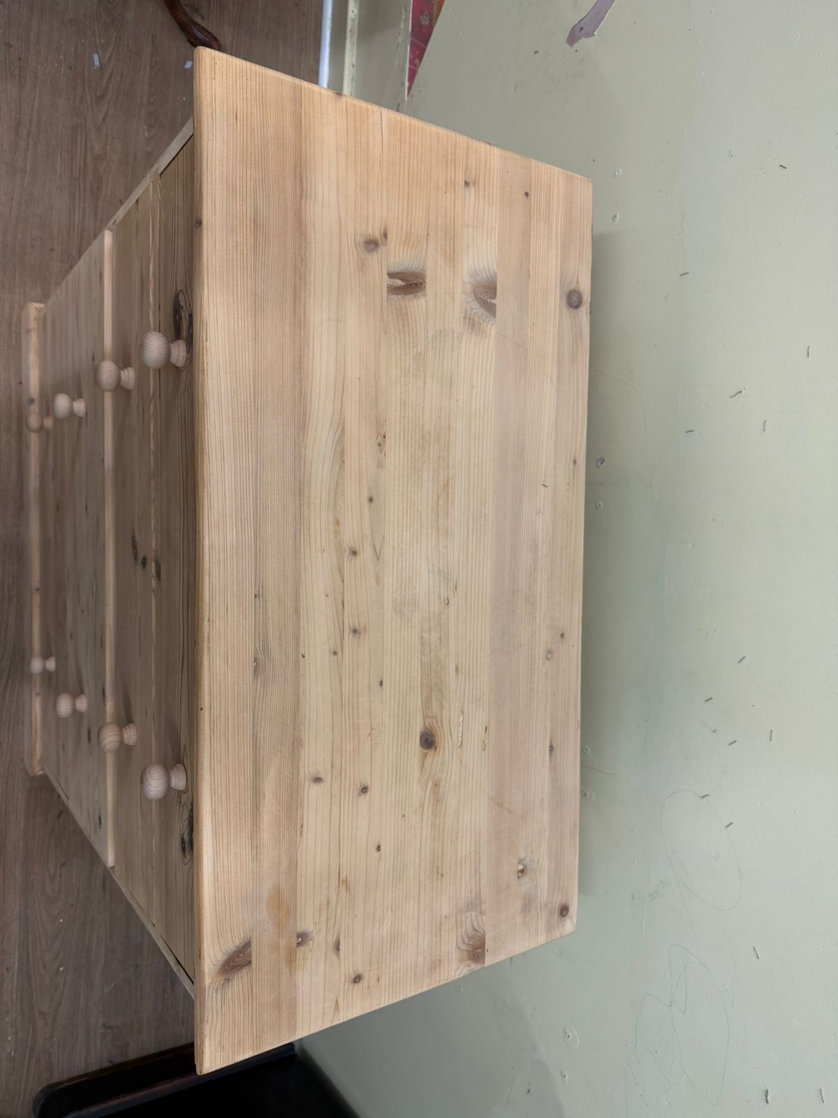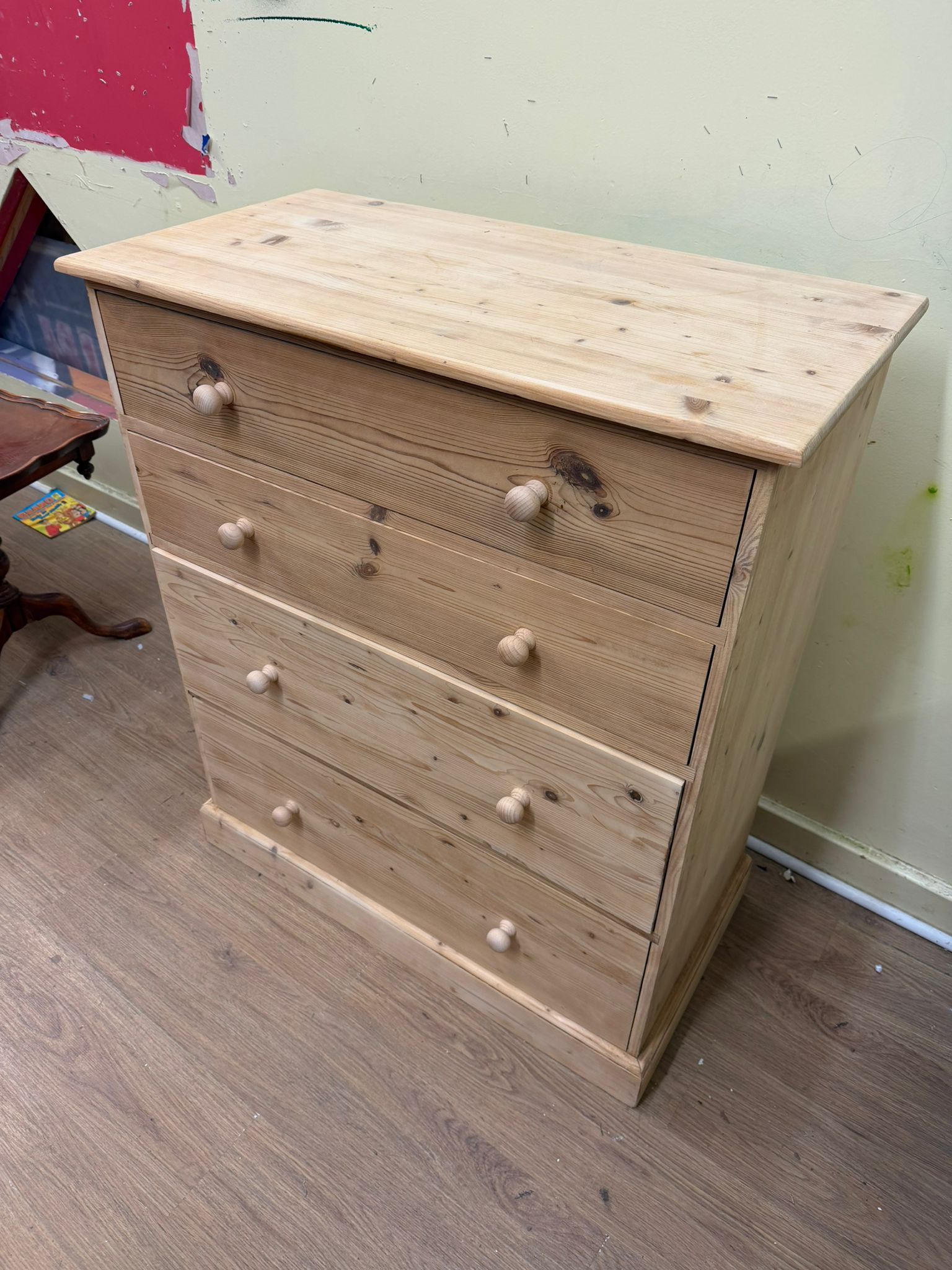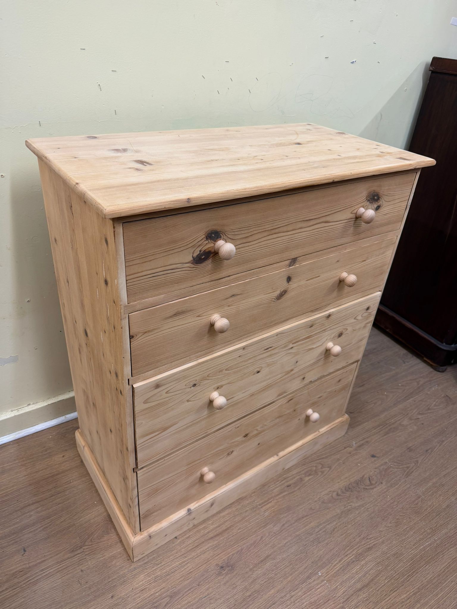 A contemporary chest of drawers constructed from knotty pine in a traditional Victorian style. The piece features a rectangular top with a square edge over a bank of four full-width drawers. Each drawer is fitted with a pair of turned wooden ball-shaped pull knobs. The unit is supported by a continuous plinth base. The timber is finished in a pale, matte state, highlighting the natural grain and knots of the wood. Internal drawer joinery is not visible. No maker marks or labels are present.