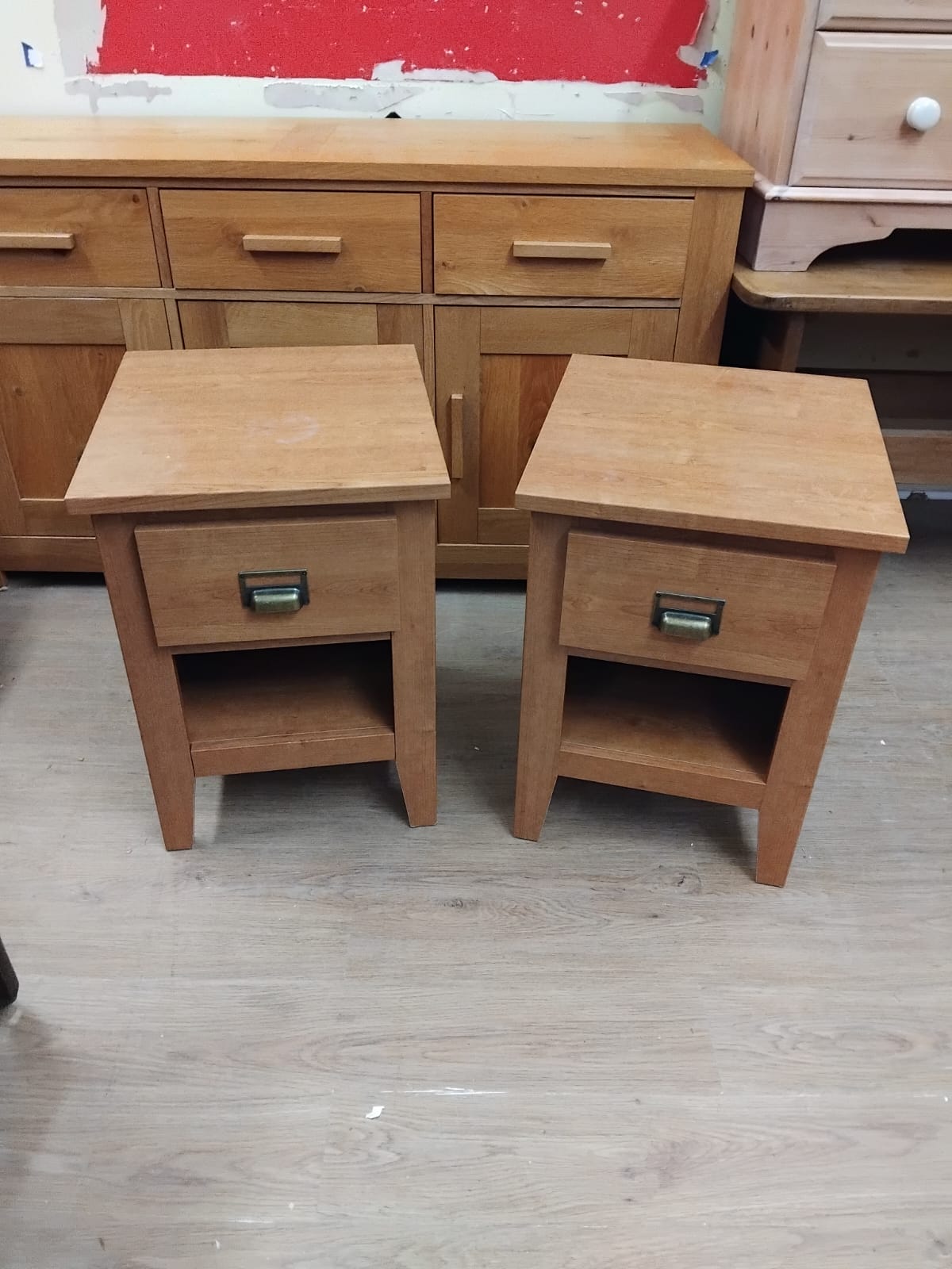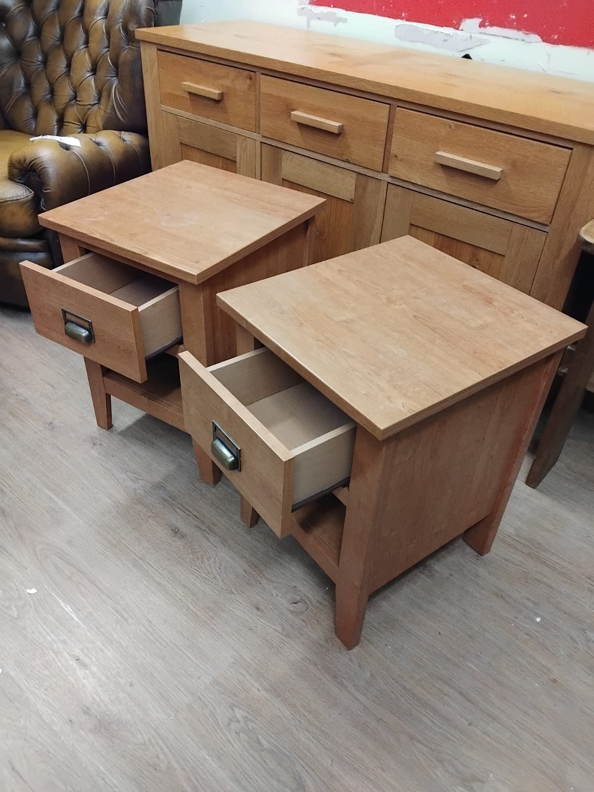 A pair of contemporary oak bedside or side tables of rectangular form with a light-to-medium finish. Each table features a rectangular top over a single frieze drawer, which is fitted with an antiqued-metal cup-style pull handle. Below the drawer is an open storage shelf. The units are supported by four square-section legs that taper slightly towards the feet. The design and finish are characteristic of the Surrey Oak range. No maker marks or labels are visible.
