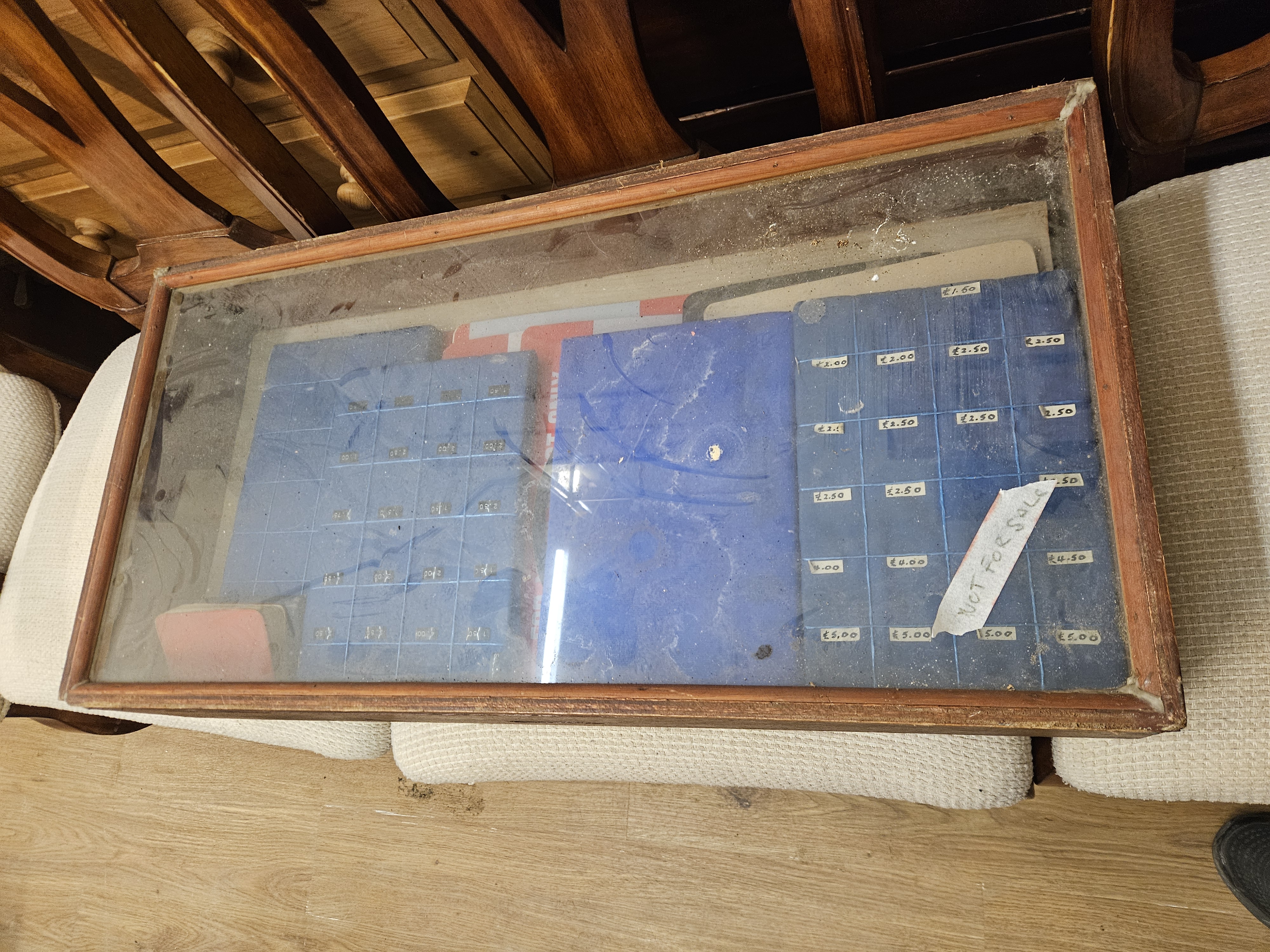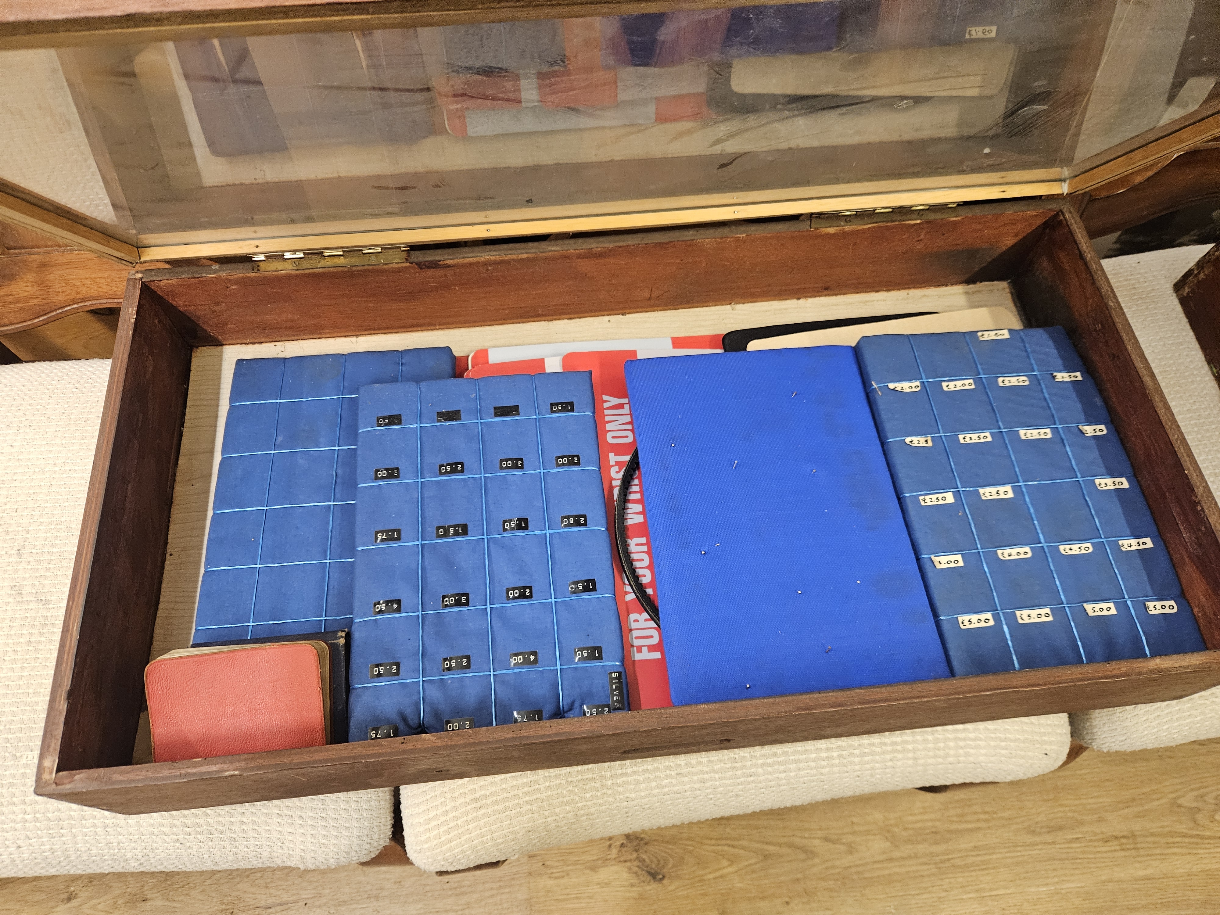 A vintage wooden tabletop display case of rectangular form, constructed from stained hardwood with a glazed hinged lid. The interior is fitted with several blue fabric-covered display pads, segmented for the presentation of small retail items such as jewellery or wristwatches.