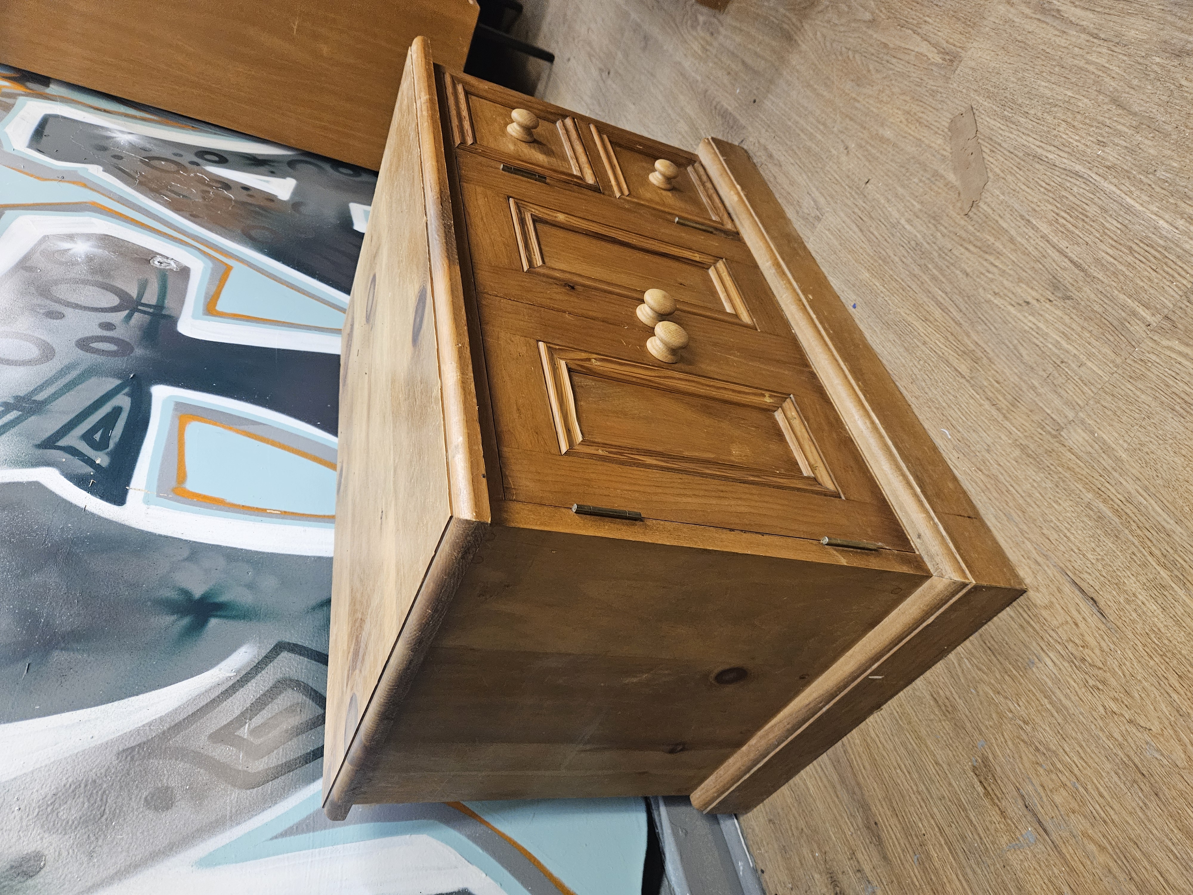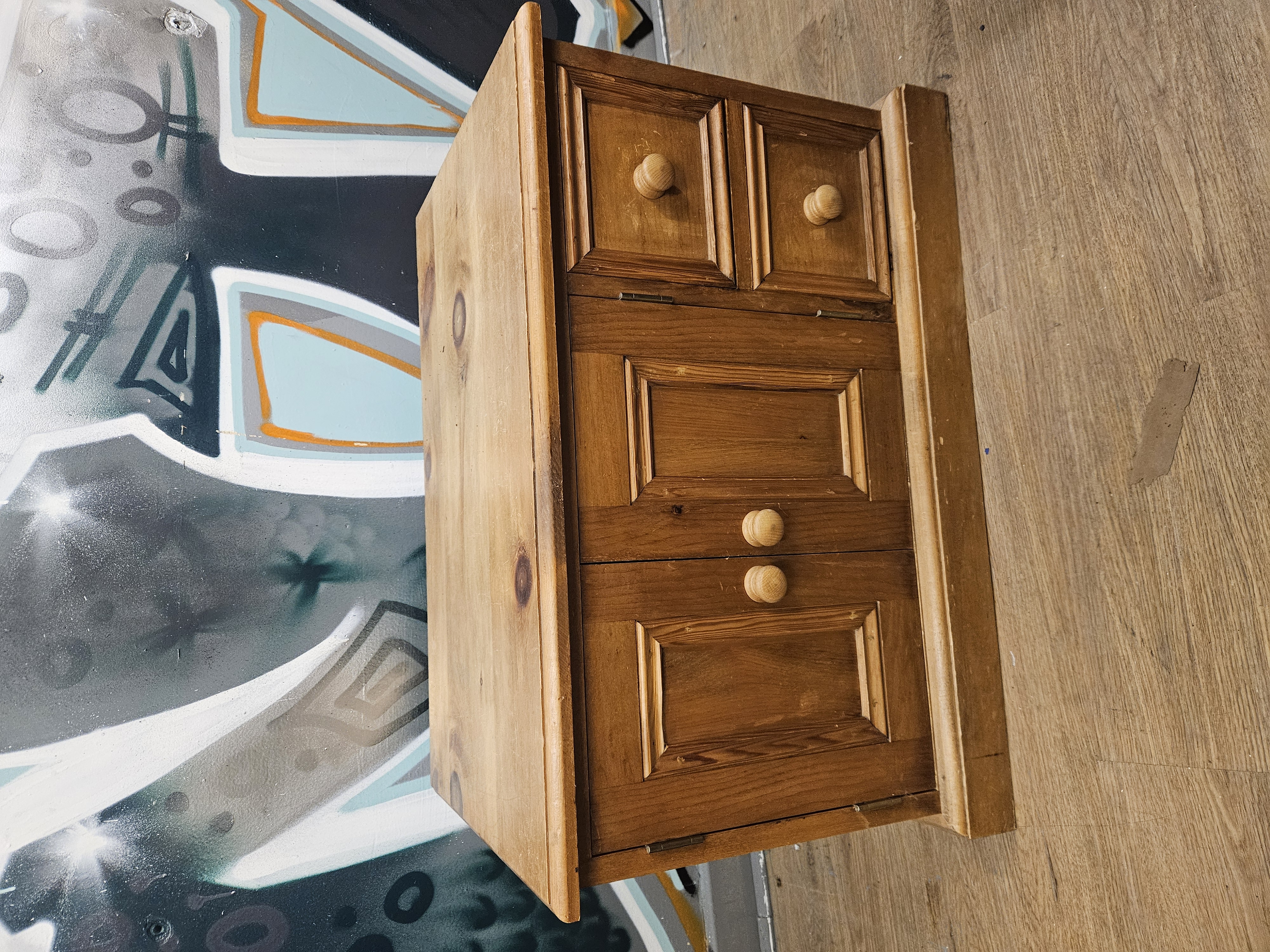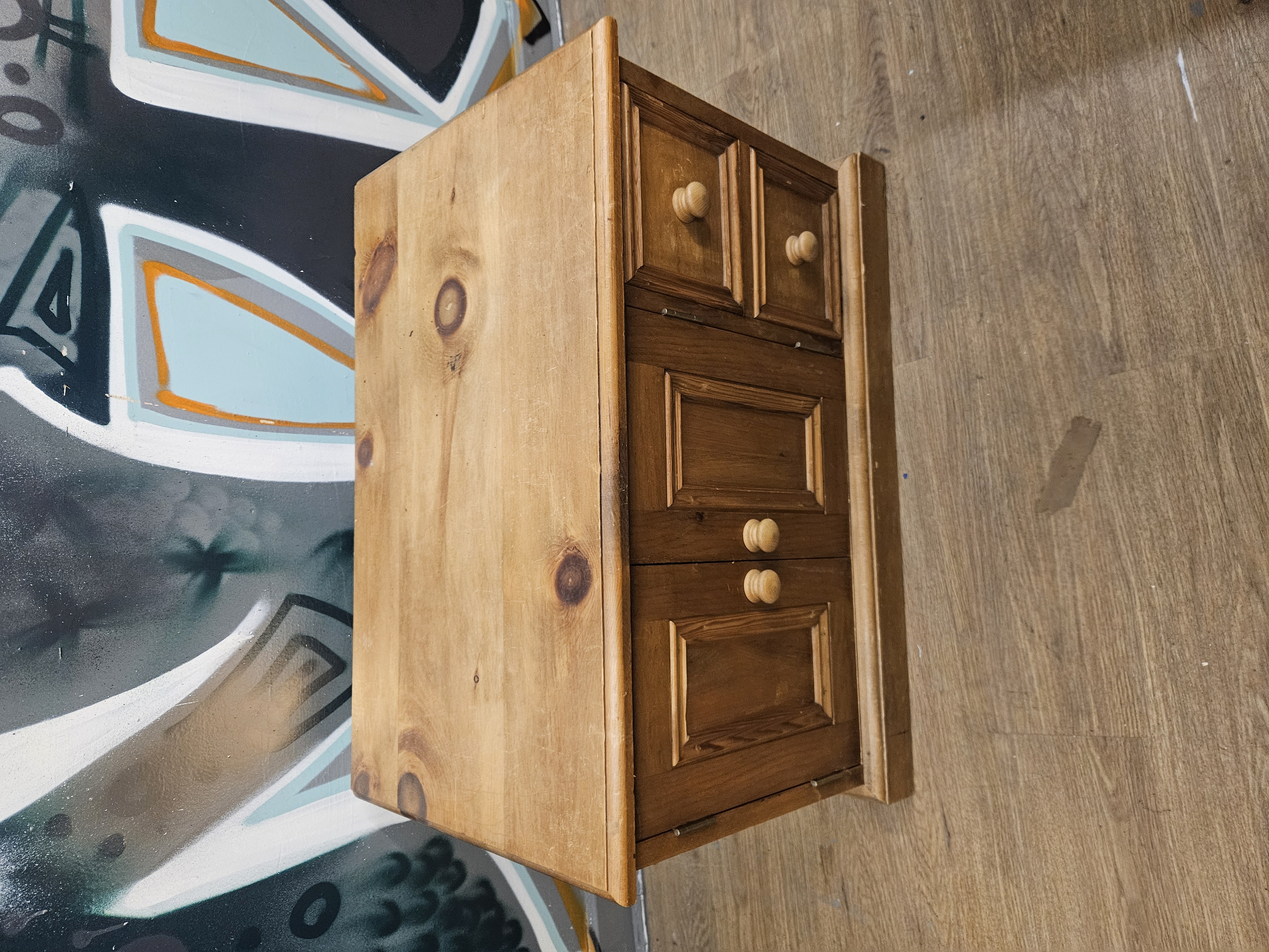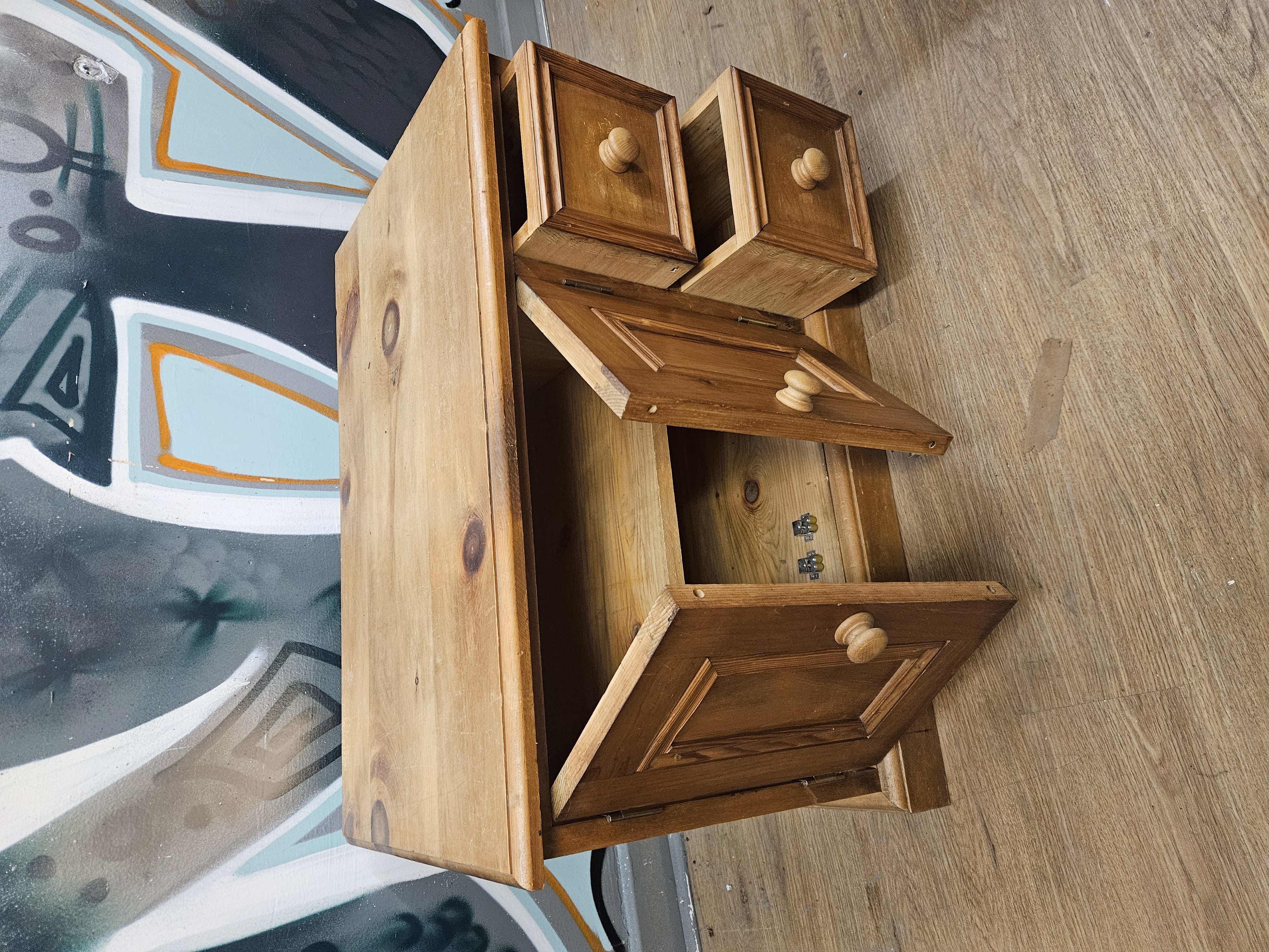 A contemporary pine cupboard of single-unit construction, designed in a traditional country style. The piece is constructed from pine with a honey-coloured stained and waxed finish. The upper section contains two small drawers arranged side-by-side, positioned above a two-door cupboard base. Both the drawer and door fronts feature raised-and-fielded panels. The cupboard doors open to reveal a single open-plan storage compartment and are secured by magnetic catches. Hardware consists of turned wooden pull knobs to all fronts, with the doors mounted on metal butt hinges. This style of furniture is characteristic of late 20th-century British domestic interiors.