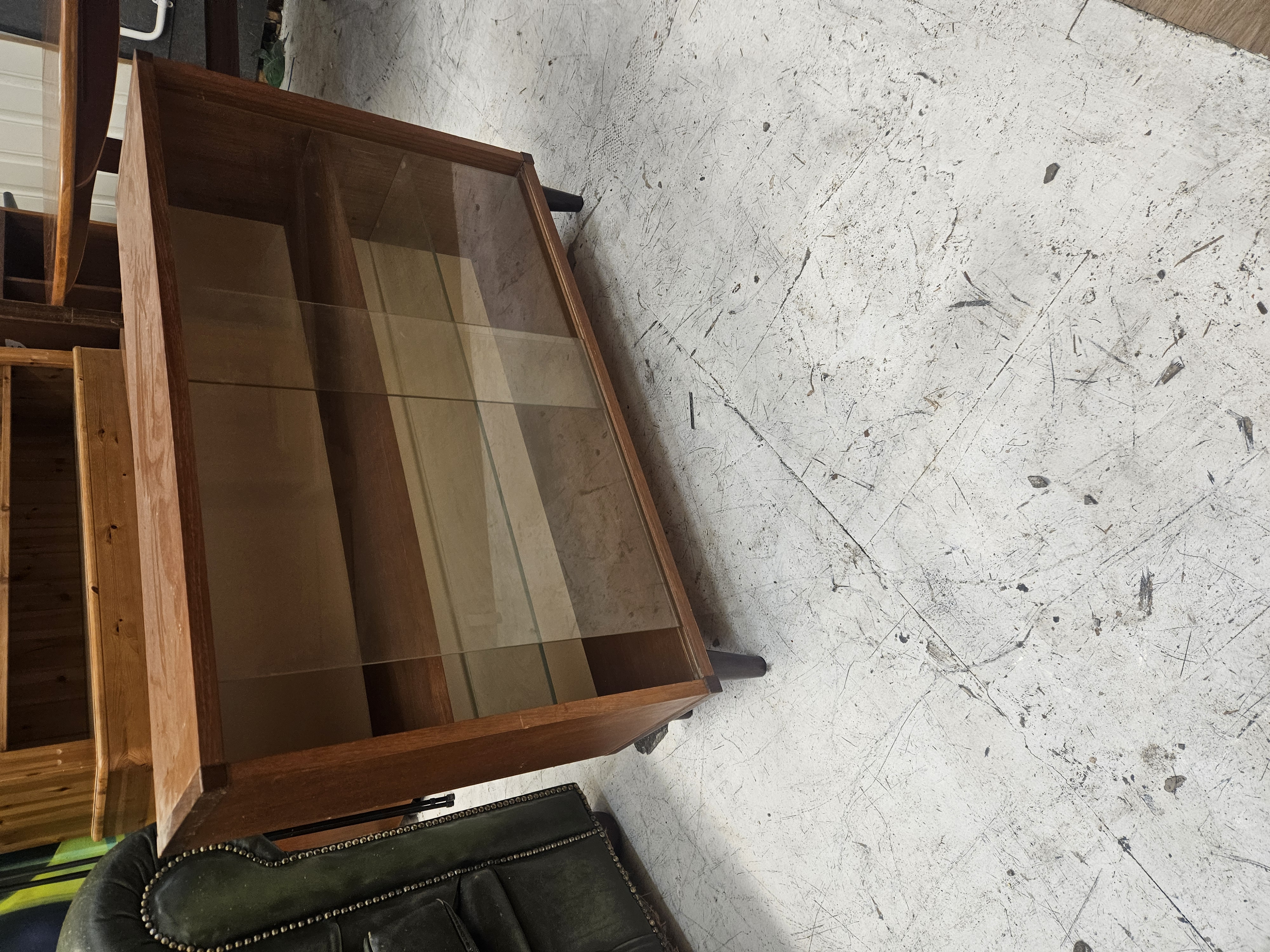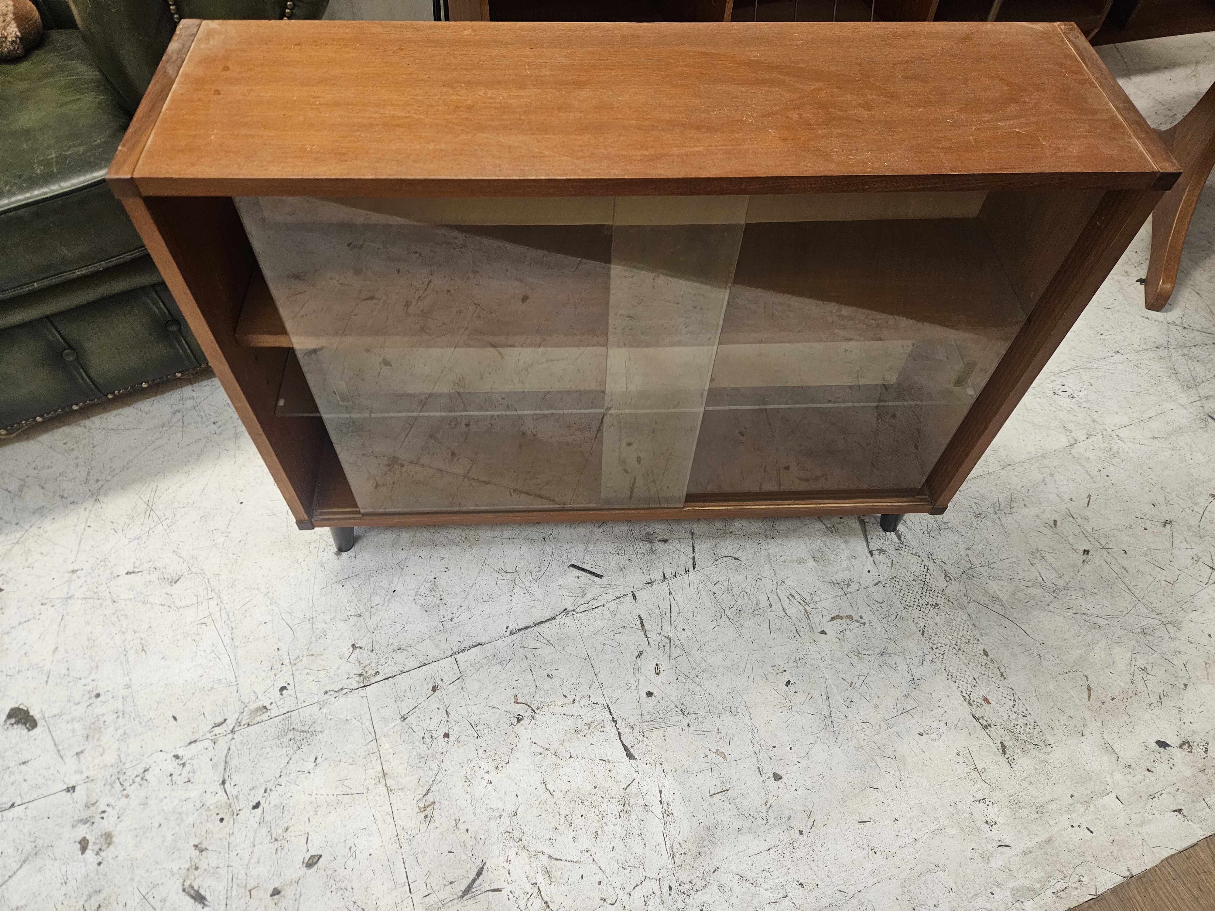 A mid-20th-century display cabinet or bookcase, circa 1960s. The unit is constructed with teak veneers and solid wood components, featuring a clean, minimalist rectangular profile. It is equipped with two bypass sliding glass doors that enclose a single interior shelf with adjustable height. The cabinet is raised on four short, dark-finish tapered legs. This is a single standalone unit. No maker marks, labels, or stamps are present on the visible surfaces. The design and construction are consistent with British mid-century furniture manufacturers such as Herbert E. Gibbs or Nathan.