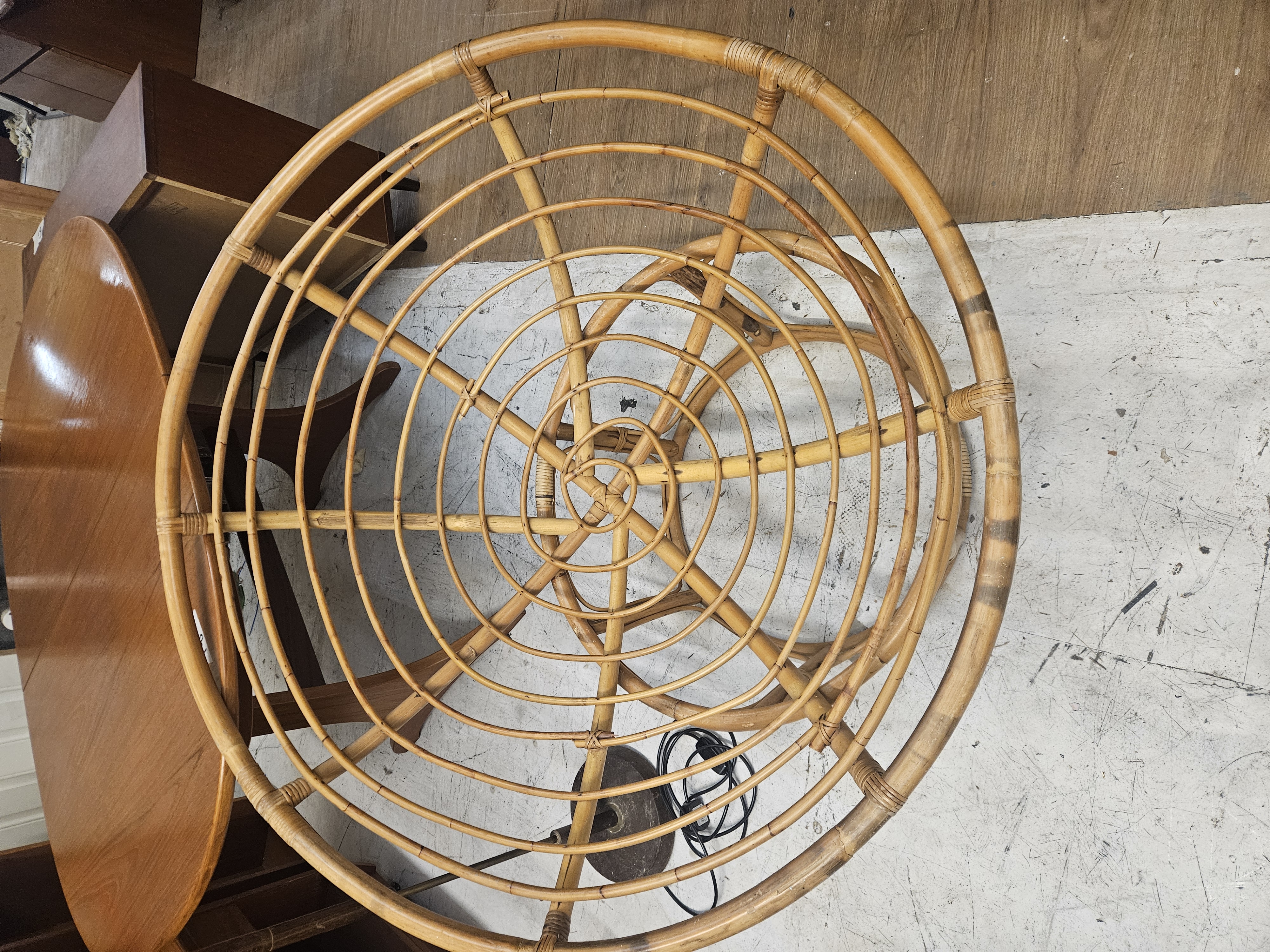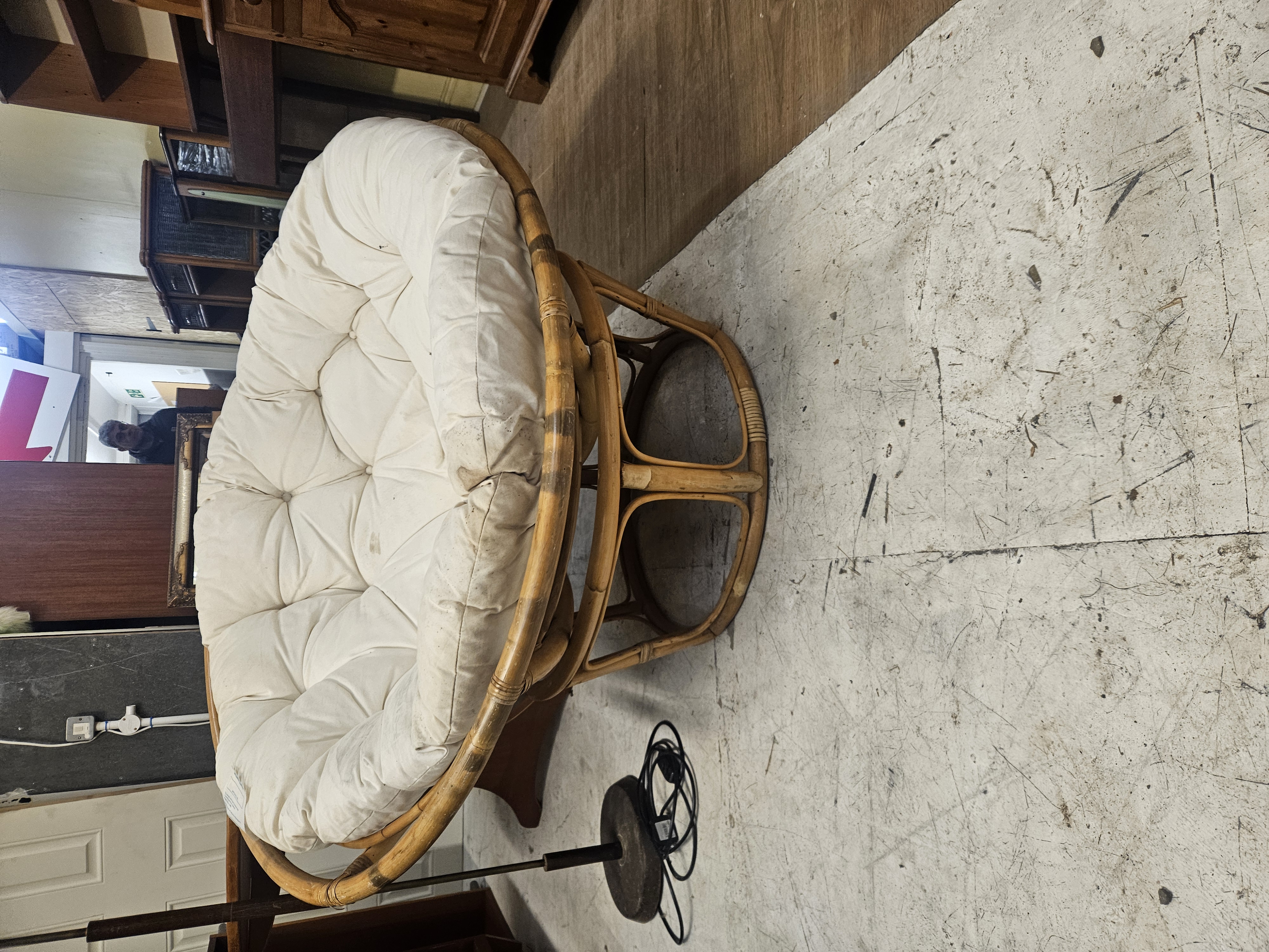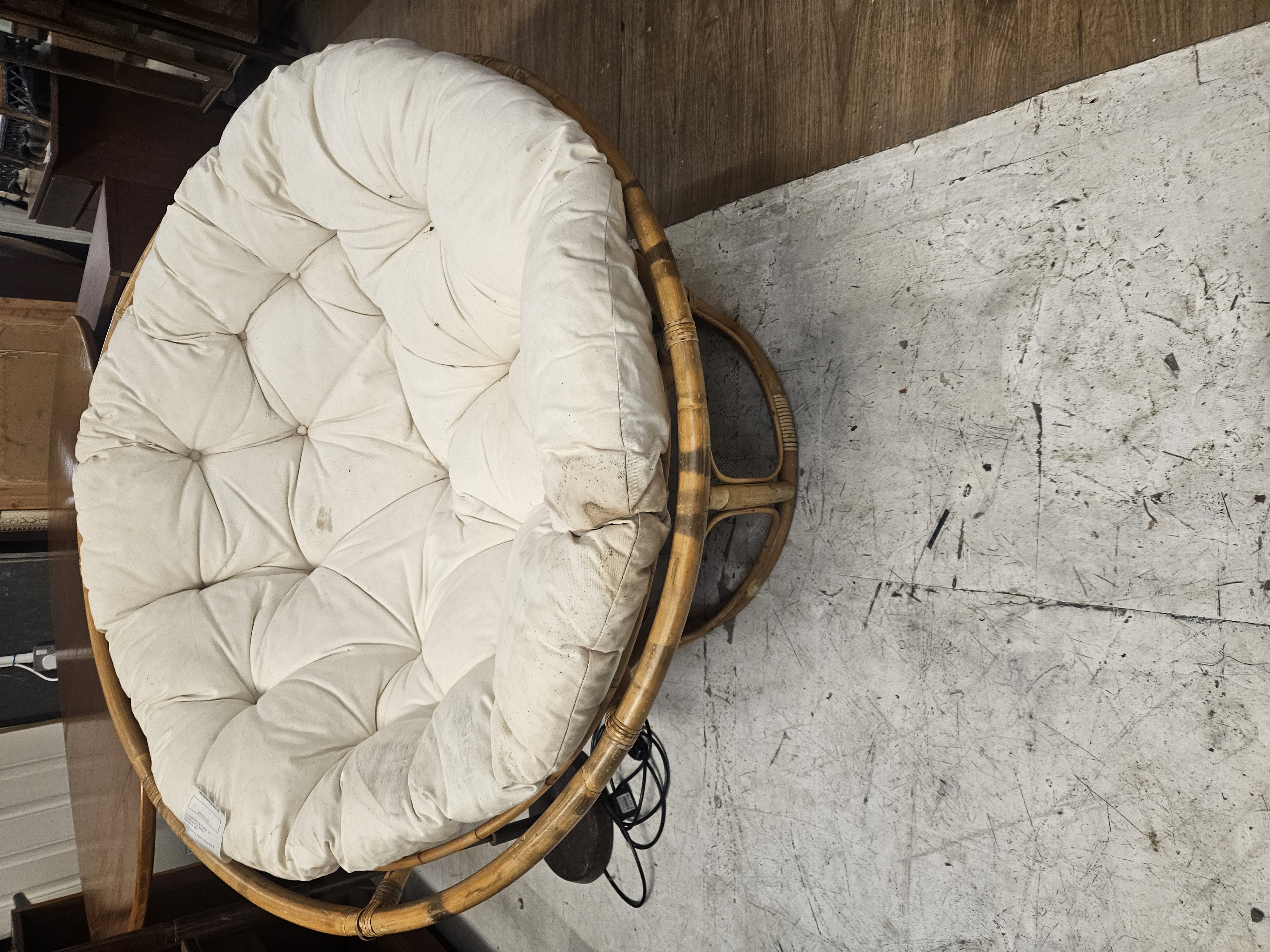 A Rattan and Bamboo Papasan Chair with Cream Tufted Cushion
