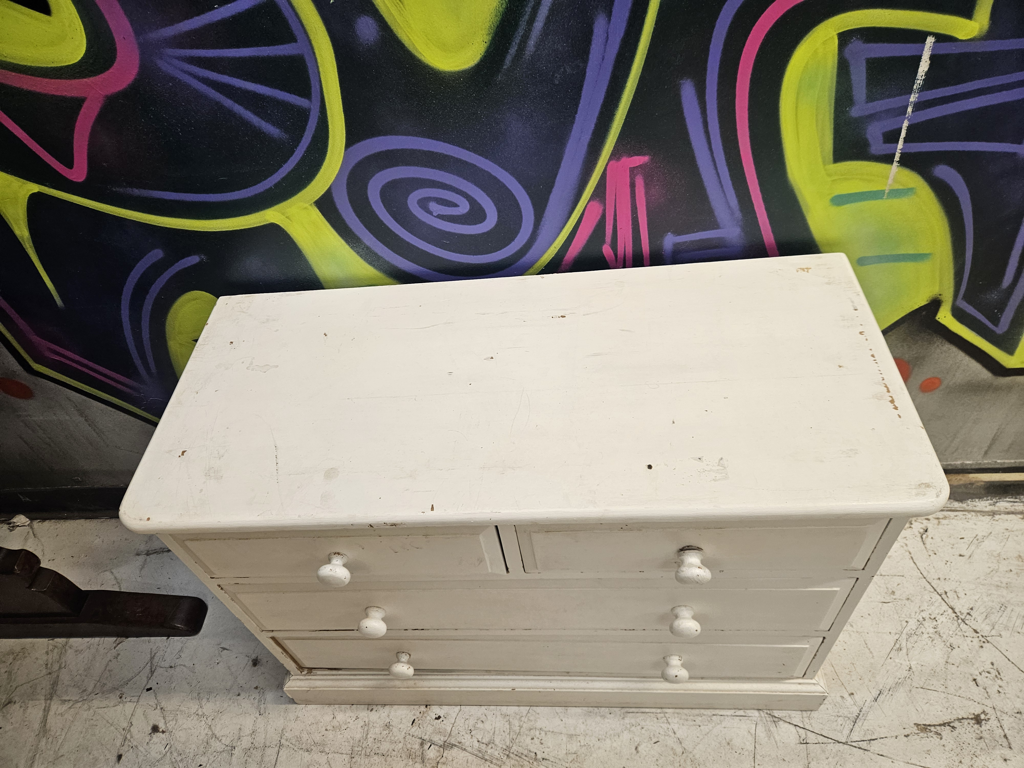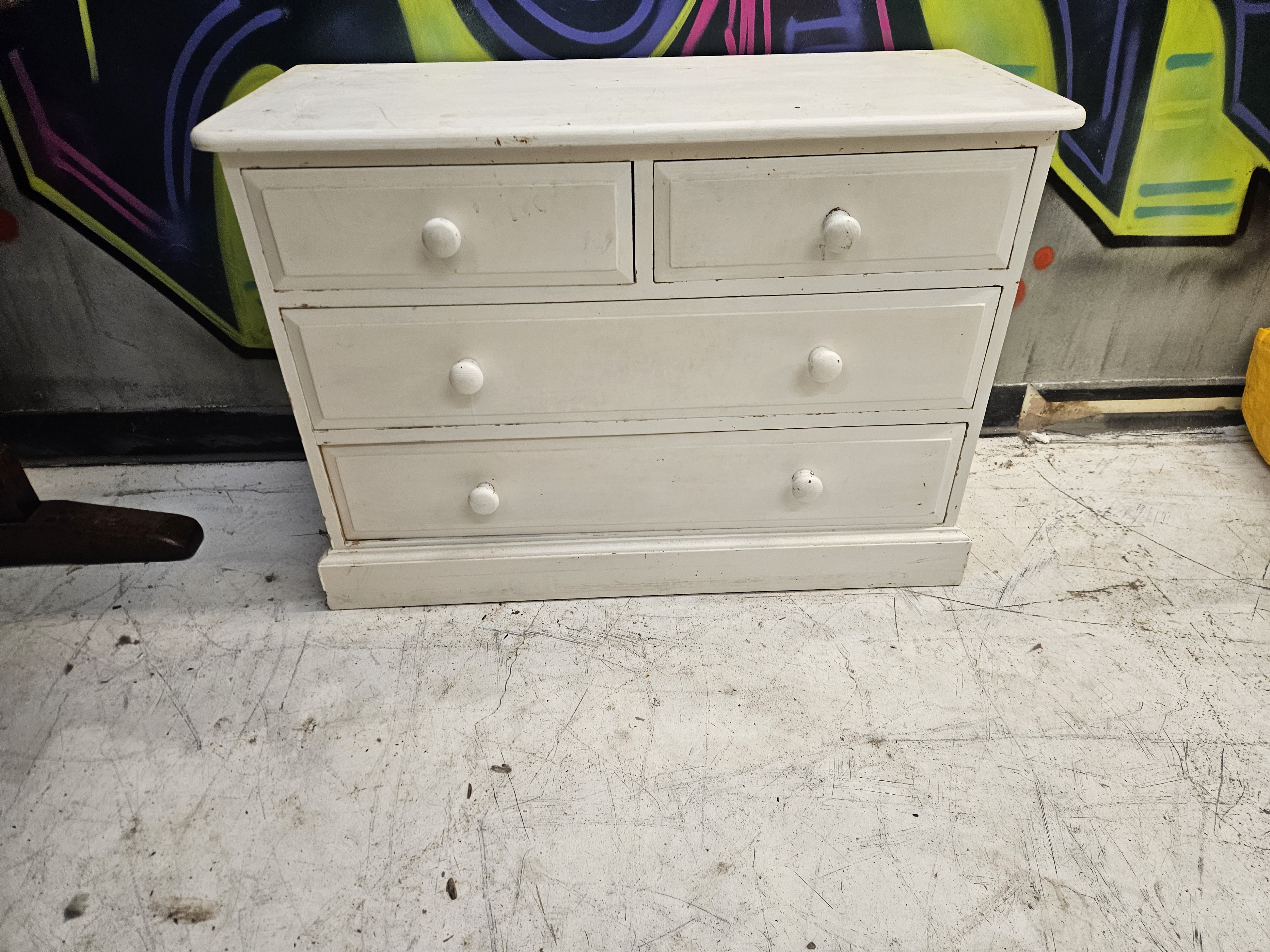 A contemporary chest of drawers of rectangular form, featuring a two over two configuration with two short drawers positioned above two full-width drawers. The unit is constructed from wood and finished in a white paint. Each drawer is equipped with circular wooden pull knobs painted to match the body. The drawer fronts are designed with recessed panels, and the piece is supported by a simple plinth base. Internal joinery and secondary woods are not visible. No maker marks, labels, or inscriptions are present on the exterior surfaces.