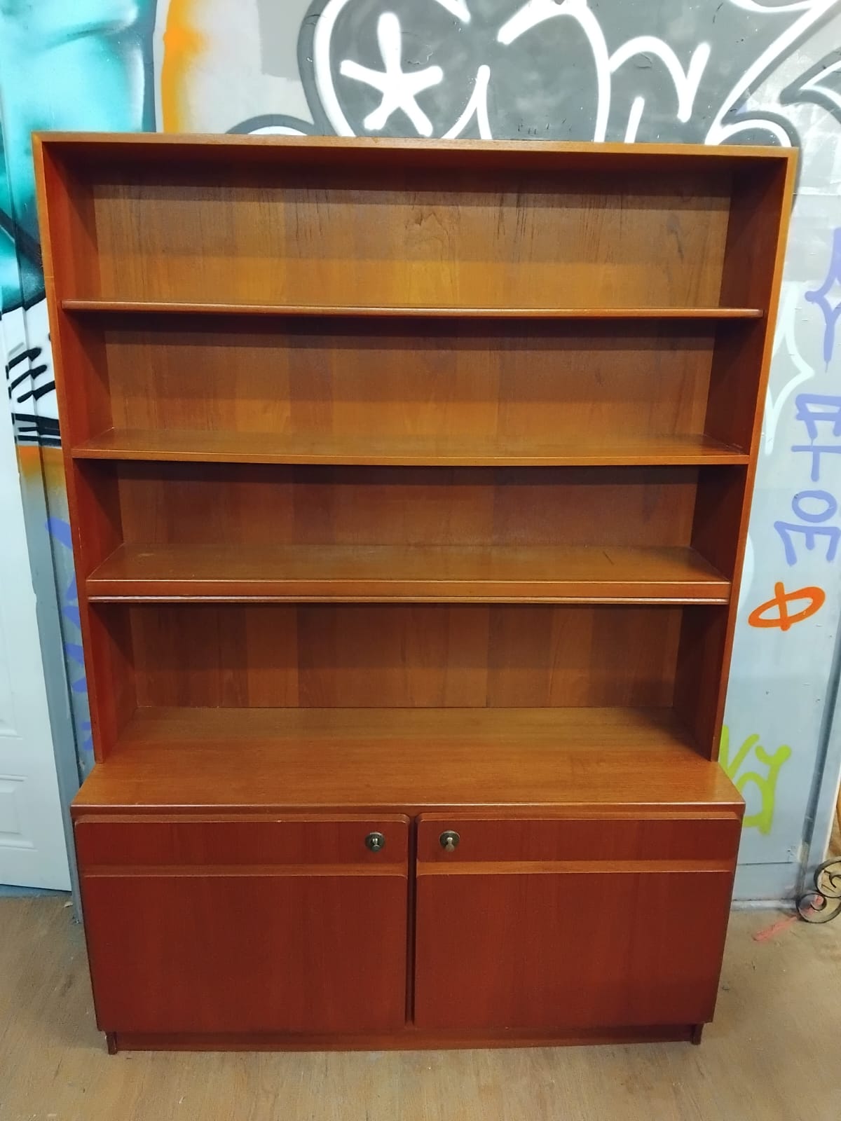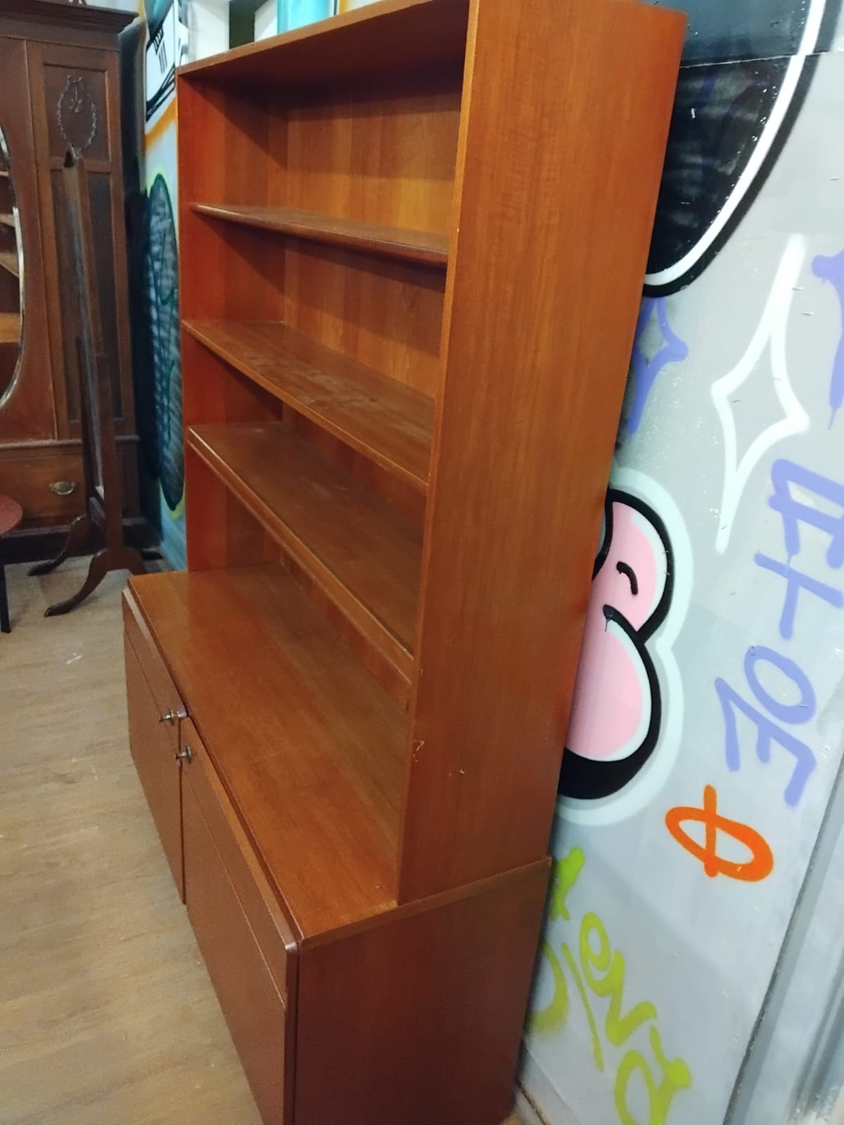 A mid-century modern teak sectional bookcase on cupboard, dating to the 1960s or 1970s. Made by mcintosh The piece is of two-part construction, featuring an upper shelving unit that sits upon a wider base. The upper section comprises an open-fronted bookcase with three fixed-height shelves. The base section consists of a two-door cupboard, with each door featuring a recessed handle design along the top edge and a small circular metal escutcheon.
