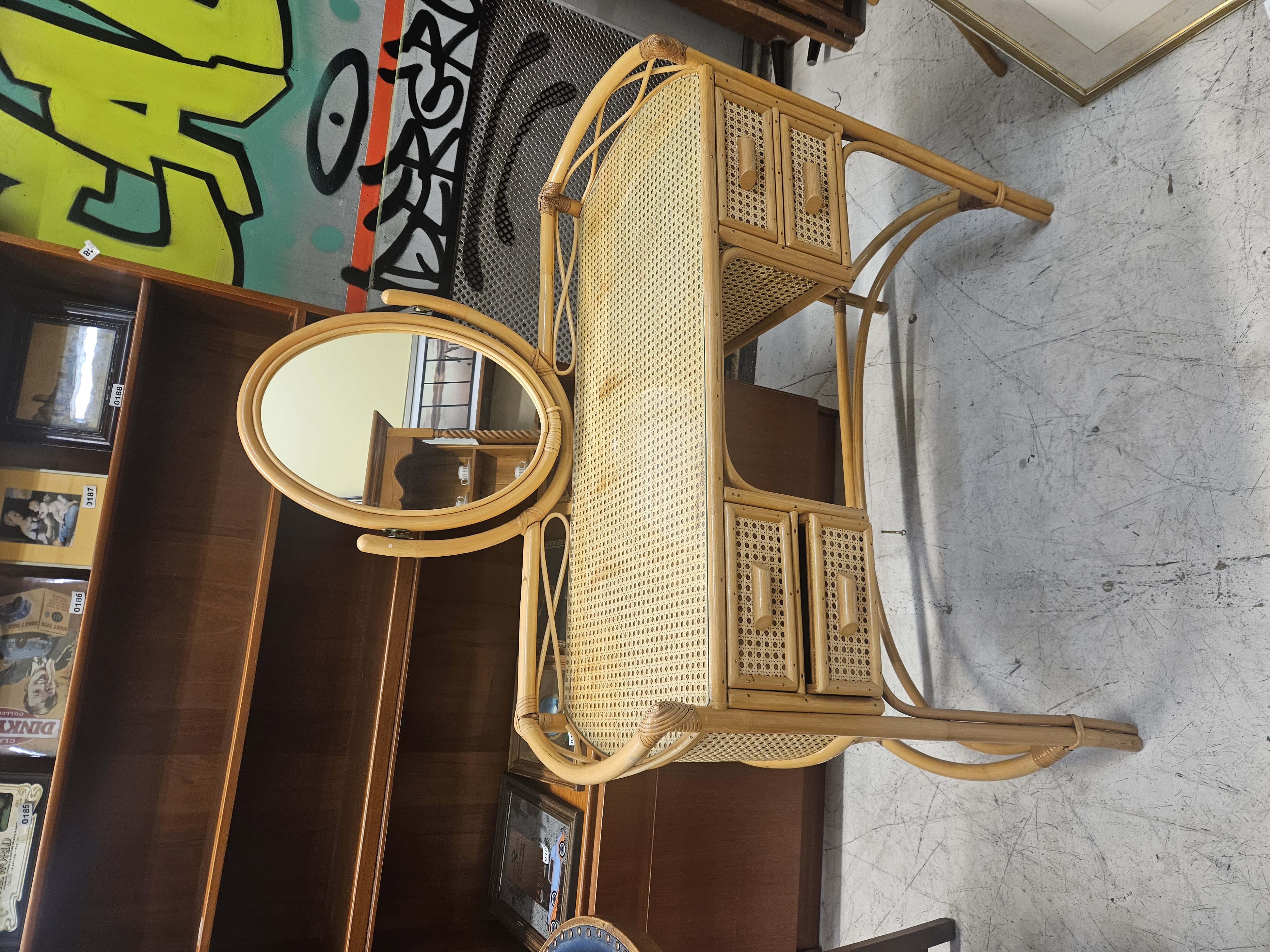 A mid-to-late 20th-century dressing table featuring a structural frame of bent bamboo poles with decorative scrollwork. The piece is fitted with an oval, pivoting mirror held within a bamboo frame. The rectangular top surface is inset with a woven cane panel. Below the top, the table contains four drawers arranged in two pedestals with two drawers on each side. Each drawer front is decorated with an inset woven cane panel and fitted with a vertical bamboo bar handle. The unit is supported by curved bamboo legs reinforced with matching arched stretchers. The drawers are constructed from secondary timber or composite materials