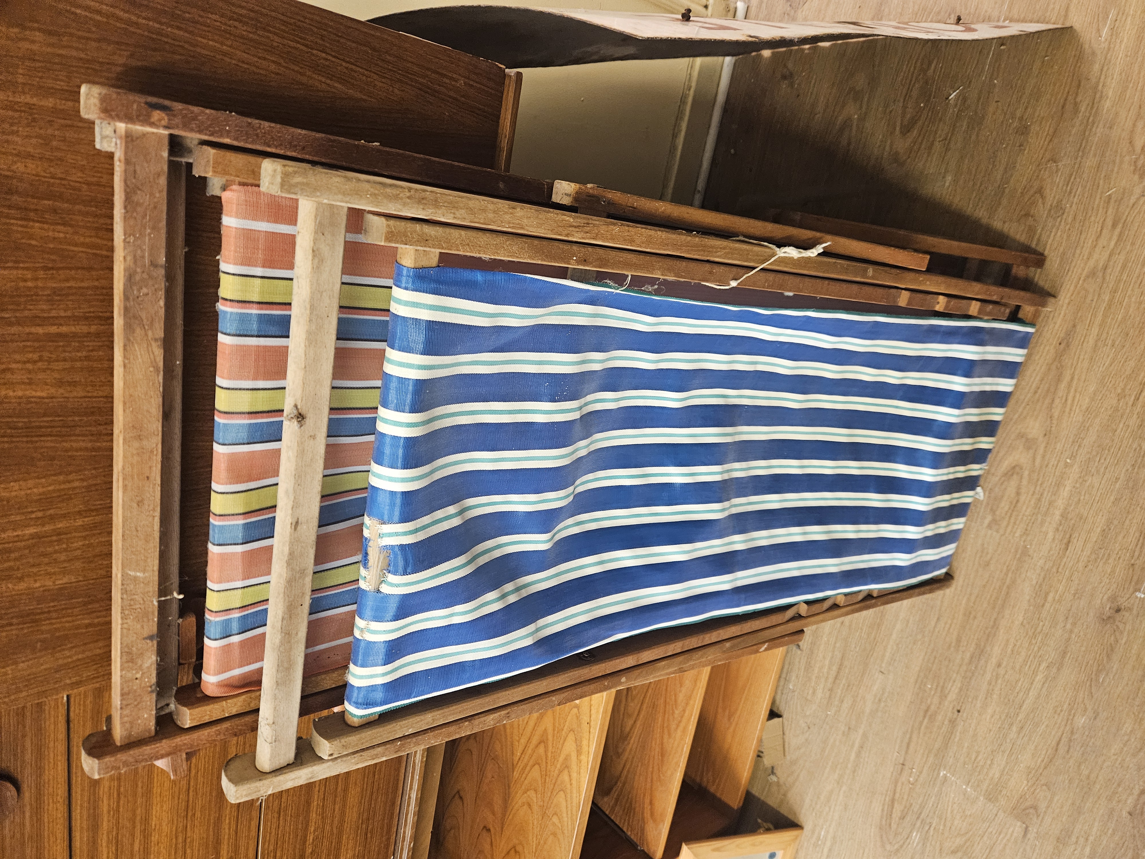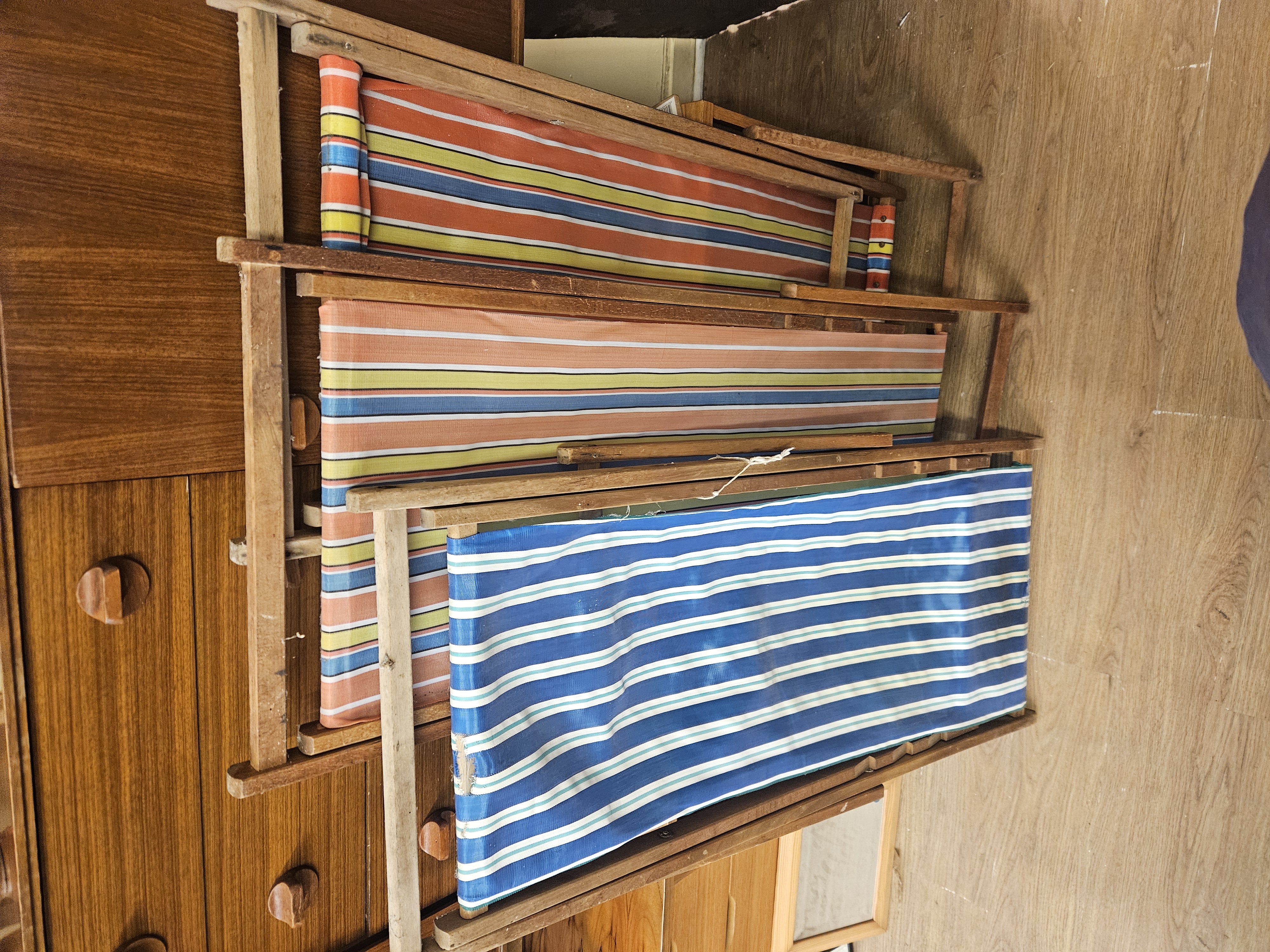 Three vintage folding wooden deck chairs with striped canvas slings