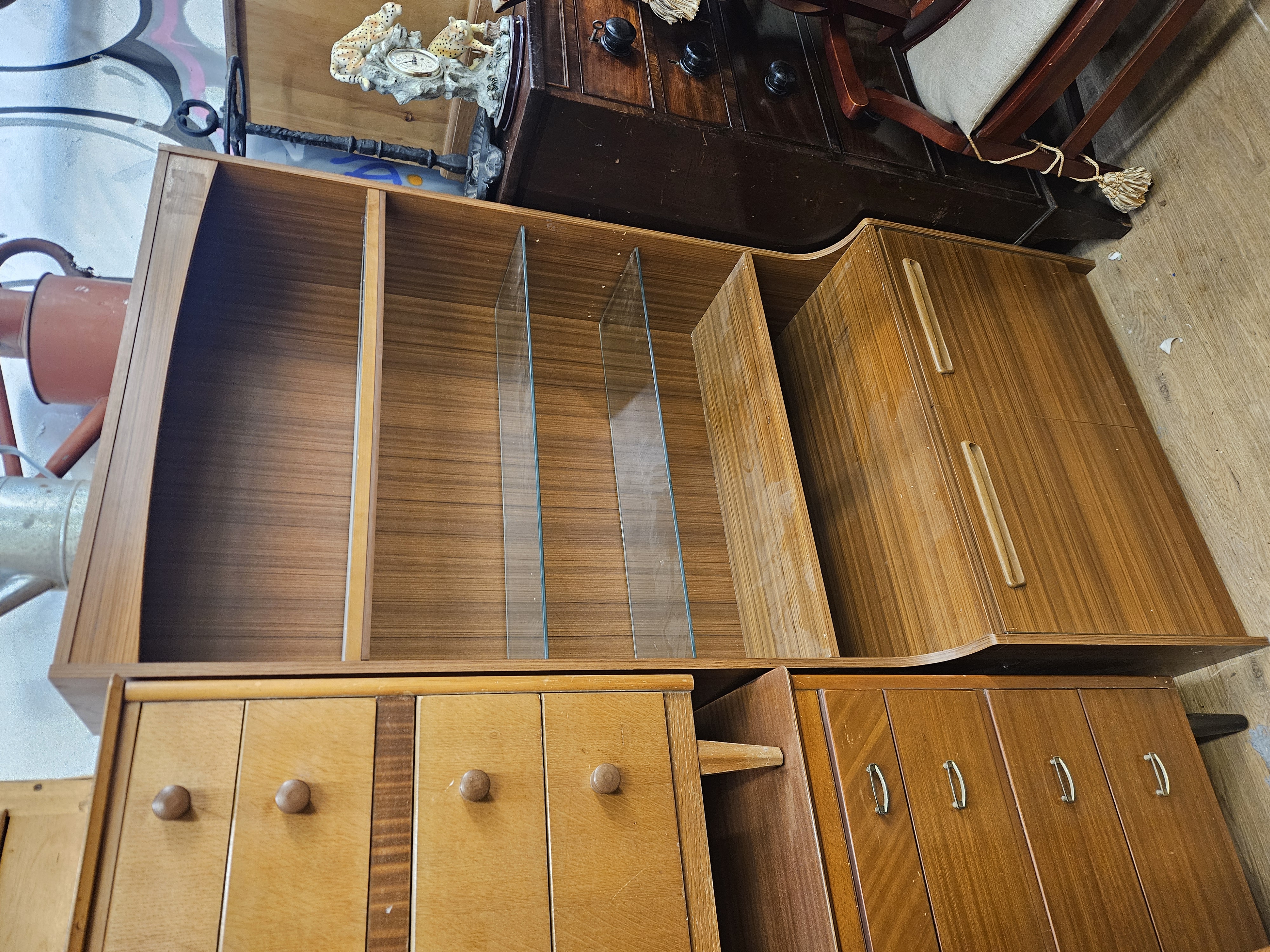 A mid-century modern wall unit upper section, dating from the 1960s or 1970s. The piece is constructed from wood with a teak-effect veneer finish. The layout is divided into three vertical sections. The left-hand side features two open-fronted storage or display compartments. The central section serves as a display cabinet and is fitted with two adjustable glass shelves; tracks at the top and bottom indicate the original presence of sliding glass doors. The right-hand section comprises a fall-front bureau or drinks cabinet, featuring two integrated, elongated wooden pull handles. The unit is a single component and lacks a plinth base, indicating it is the upper portion of a larger modular system. No maker marks or labels are present.