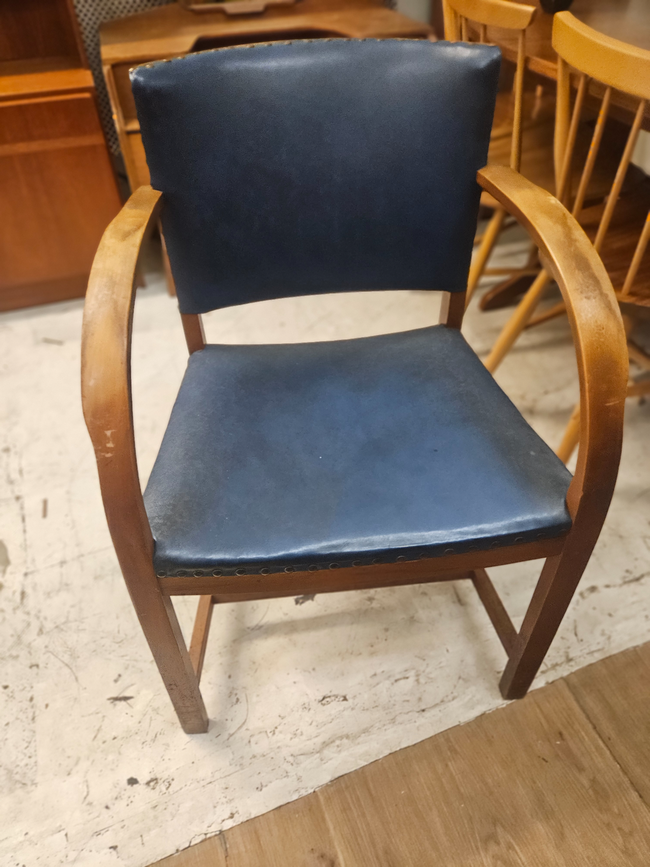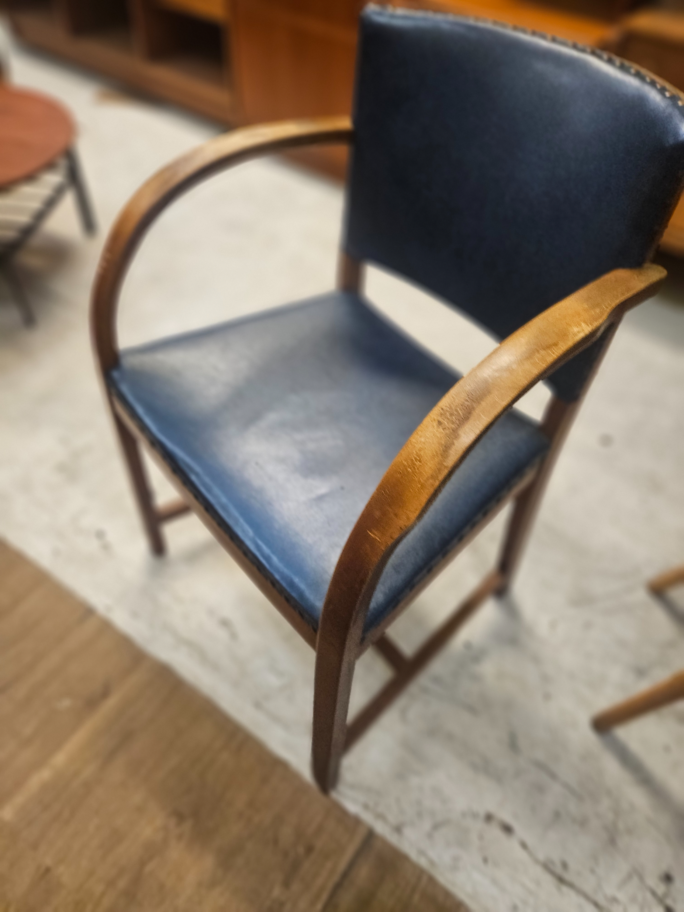 A mid-century modern armchair featuring a stained hardwood frame. The construction is characterised by continuous curved arms that wrap around the backrest, likely formed from steam-bent or laminated wood. The seat and backrest are padded and upholstered in a blue faux-leather or vinyl, secured with brass-toned upholstery tacks along the edges. The chair stands on four square-profile tapered legs. No maker’s marks, labels, or inscriptions are visible on the item. The design shares characteristics with mid-20th-century pieces often attributed to Young Manufacturing or described as having Italian Art Deco influences.