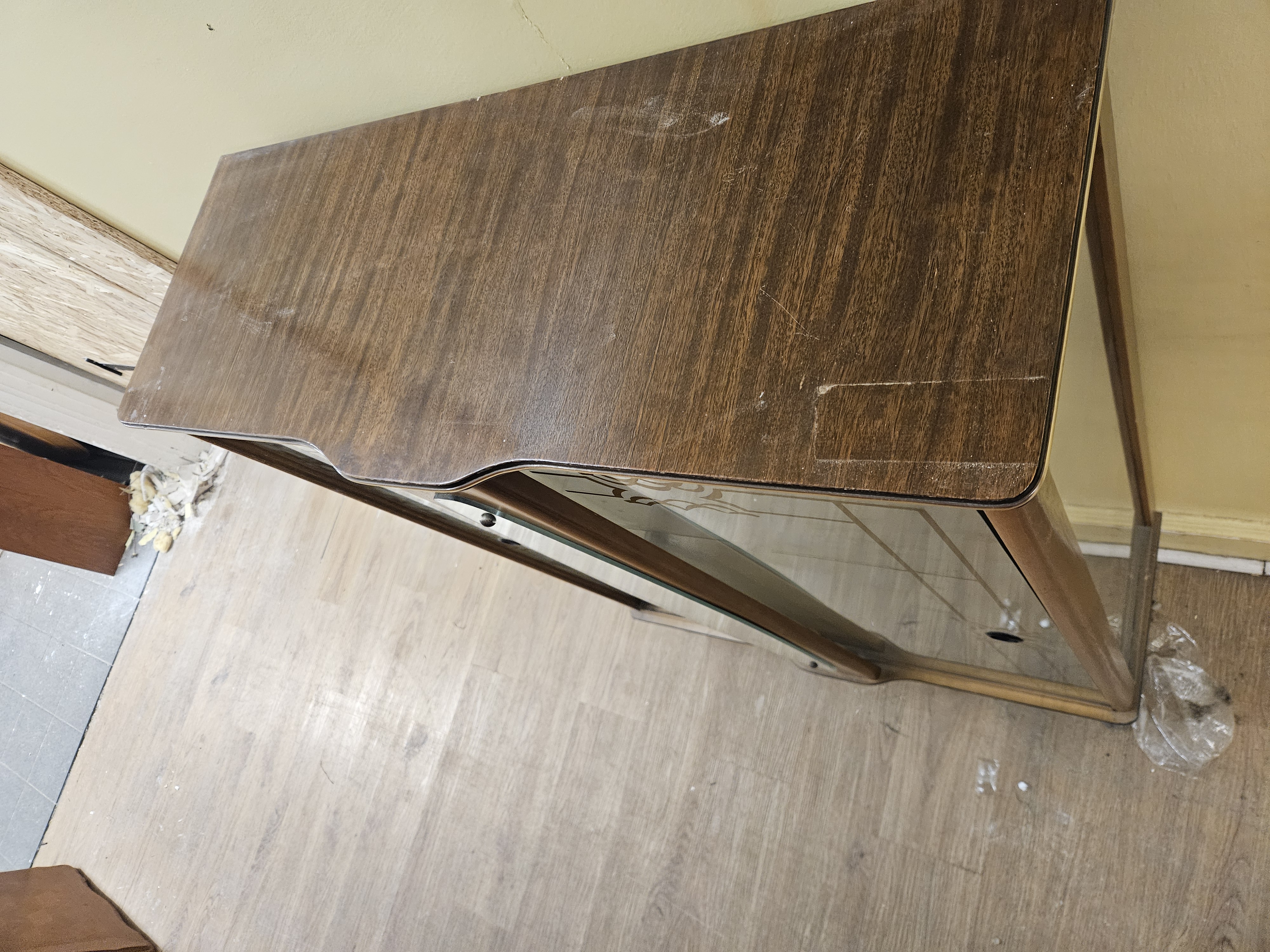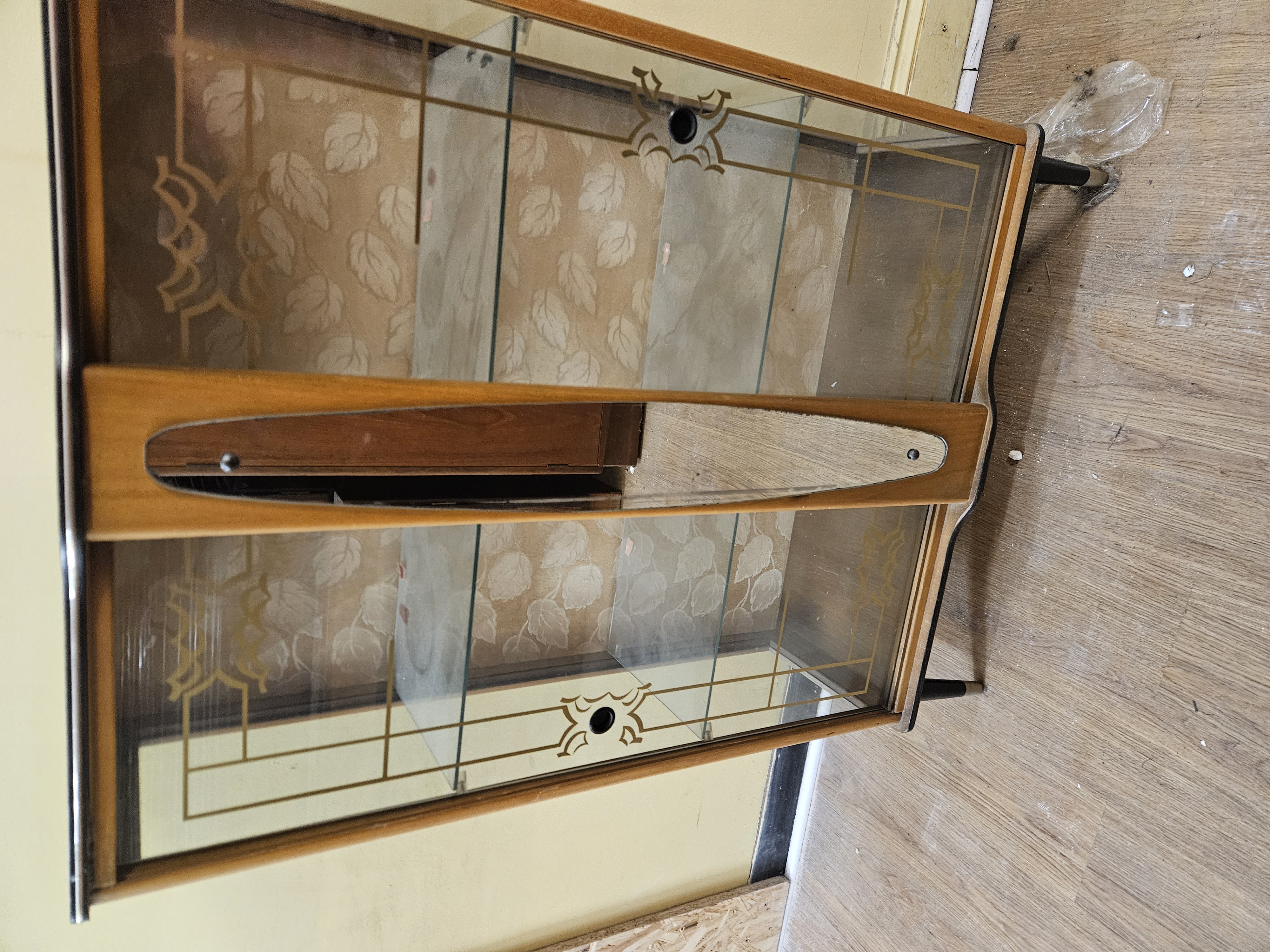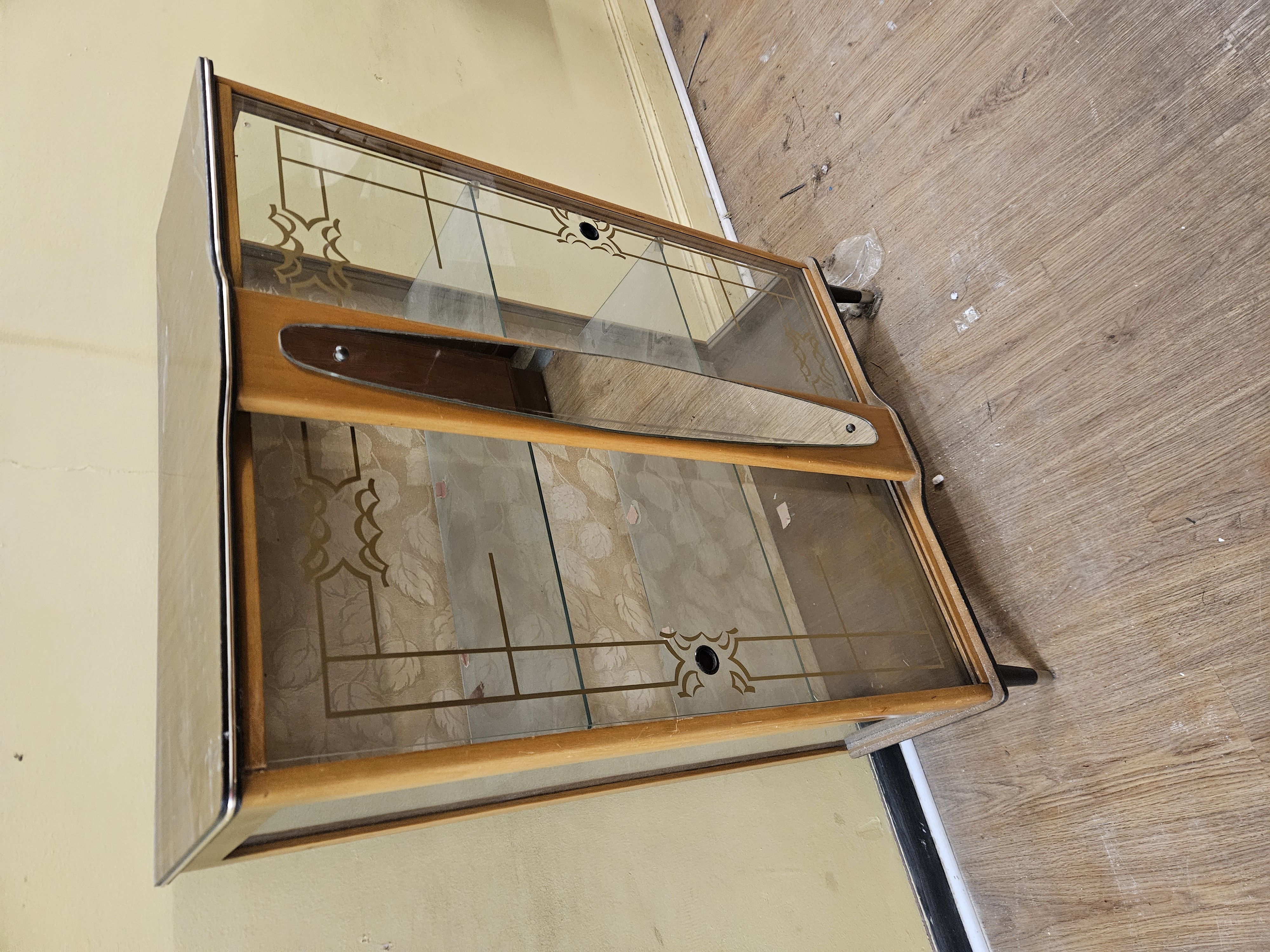 A mid-century modern display cabinet of one-piece construction, typical of British furniture manufacture from the mid-20th century. The unit features a light-toned wood frame, likely beech or maple veneer, with a contrasting figured wood-veneered top. The top is designed with a shaped, slightly bowed front edge. The front is fitted with twin sliding glass doors, each decorated with a gold-tone etched or transfer-printed geometric and foliate pattern. The interior contains two glass shelves. The back panel is divided into two sections, comprising a mirrored base and a foliate-patterned papered upper section. The sliding doors are fitted with recessed black circular finger pulls. The cabinet is supported by four ebonised tapered legs terminating in brass-coloured metal ferrules.