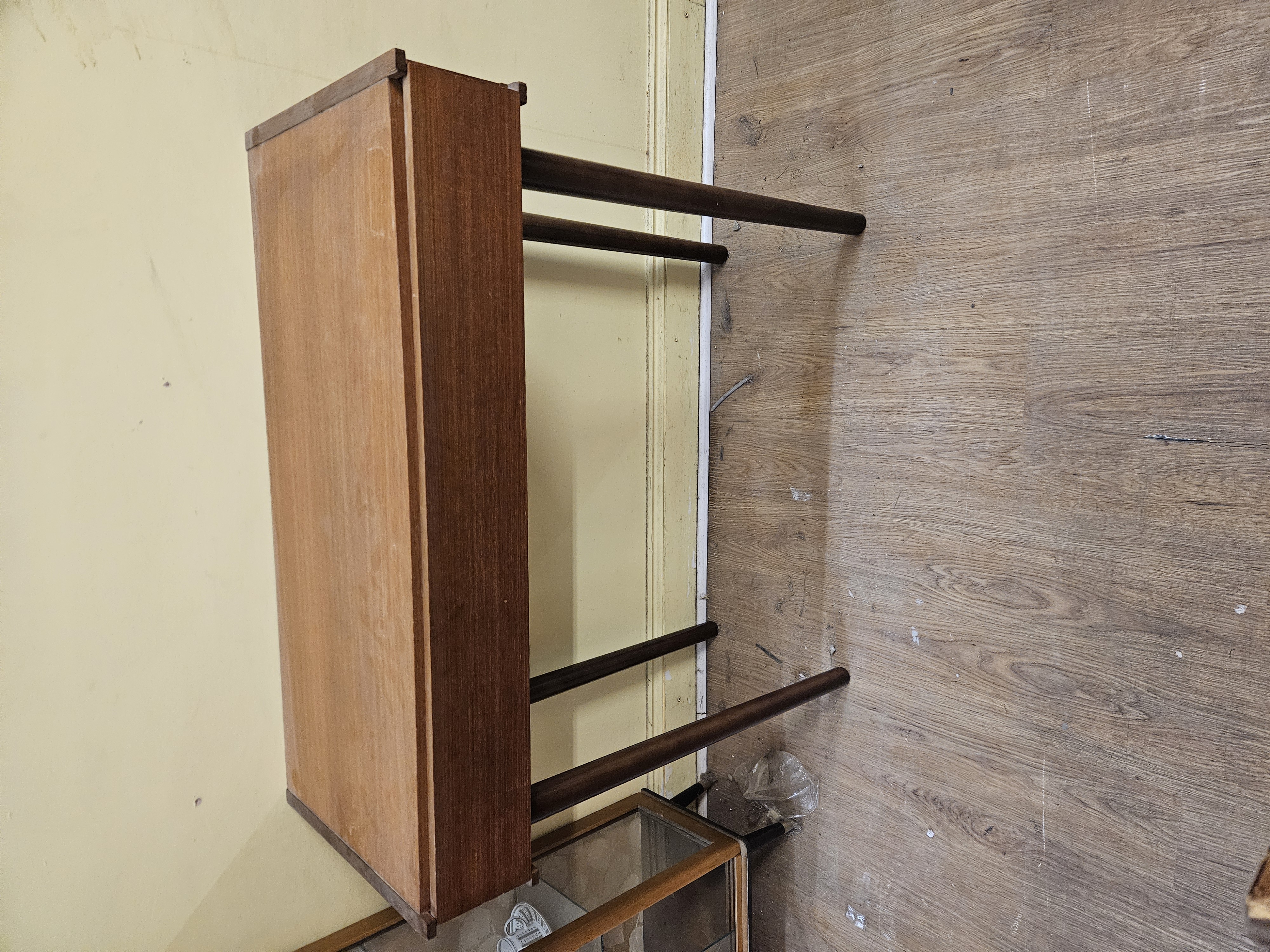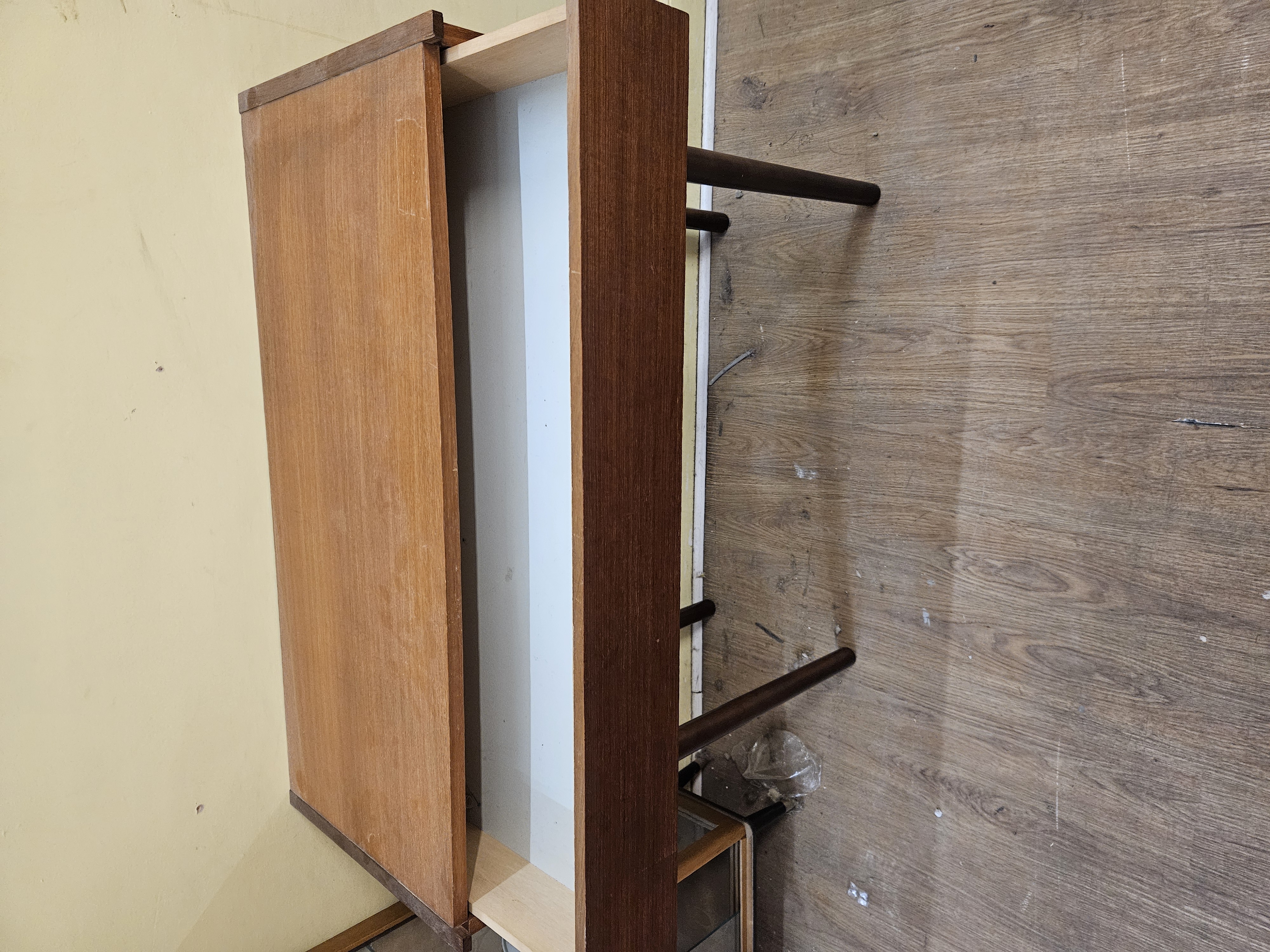 A mid-century modern console or side table, potentially designed as a small vanity or sewing table. The piece is constructed with teak veneer and features a rectangular top with a sliding mechanism. This mechanism opens to reveal a shallow, white-lined internal storage compartment. The table is supported by four round, tapered legs. No maker’s marks, labels, or stamps are visible on the item.