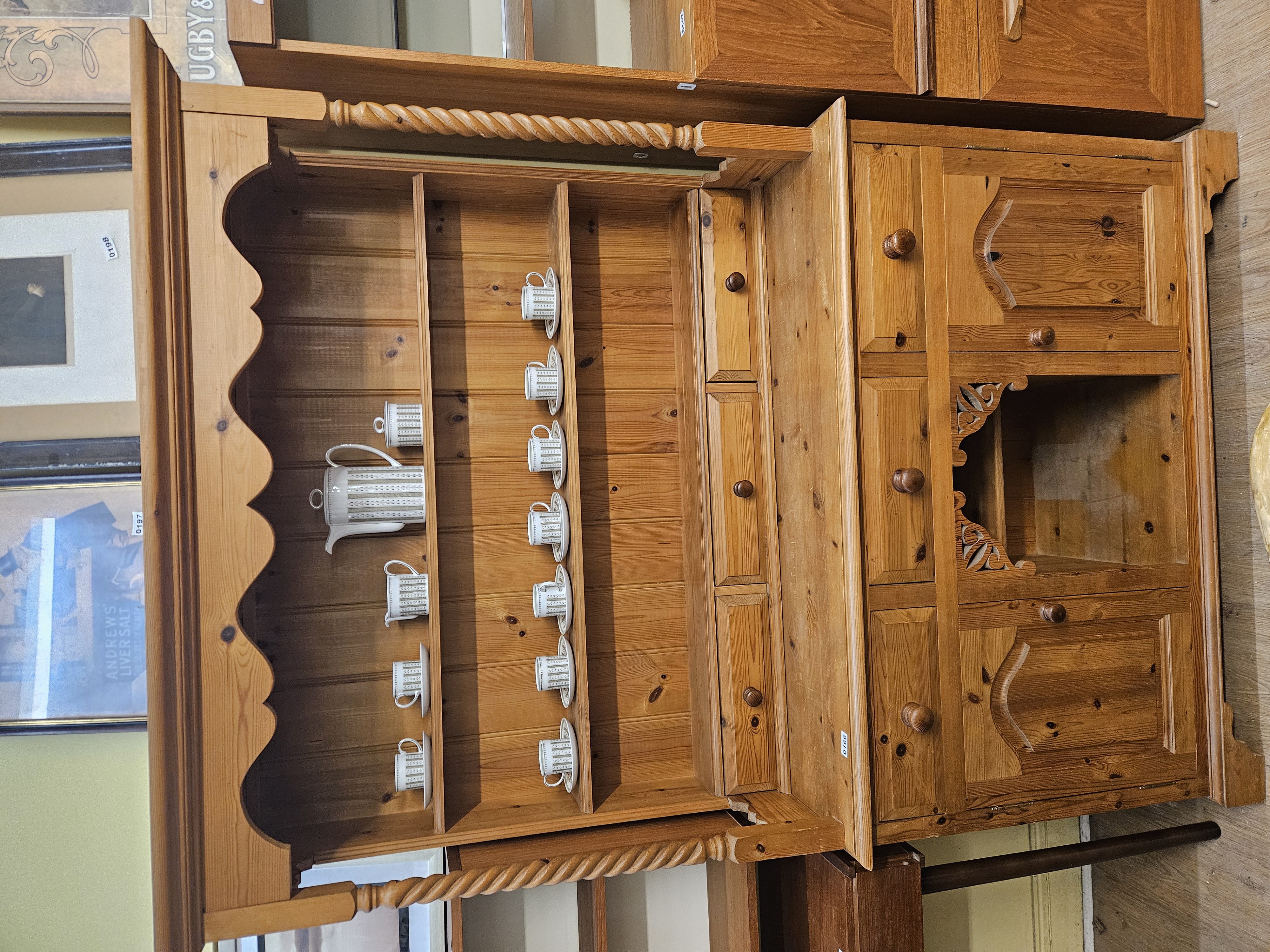 A traditional two-piece kitchen dresser constructed from solid pine with a natural finish, designed in the country farmhouse style. The upper section features an open three-tier plate rack with integrated plate grooves, surmounted by a decoratively scalloped top frieze and supported by two barley-twist uprights. The base unit comprises three frieze drawers above a central configuration consisting of one deep drawer and an open recessed dog kennel alcove with a decorative carved fretwork gallery. This central section is flanked by two single-panel cupboard doors with shaped internal chamfering. The dresser is fitted with turned pine pull knobs throughout and is of two-part construction to facilitate transport. A small white inventory label with the printed characters 0166 is present on the right-hand side of the base unit.