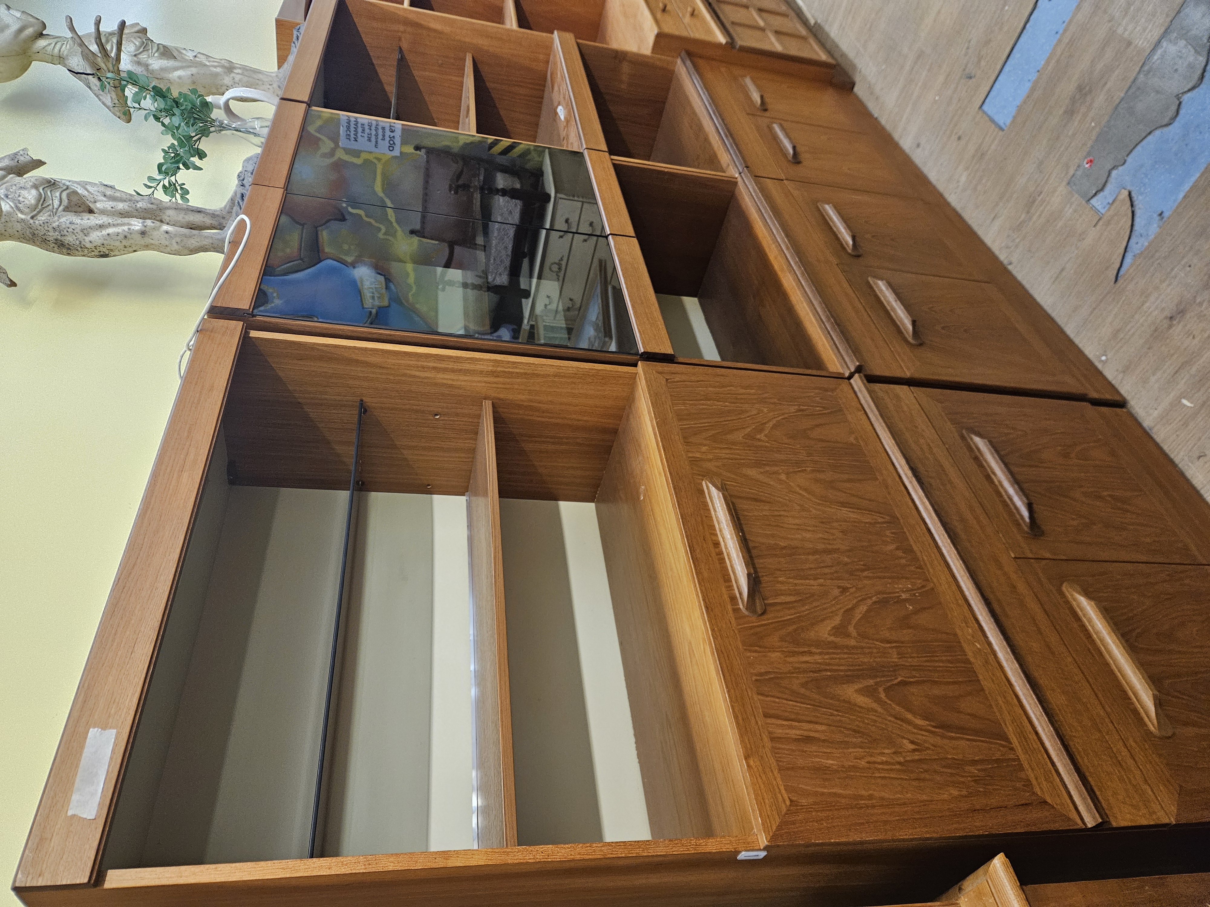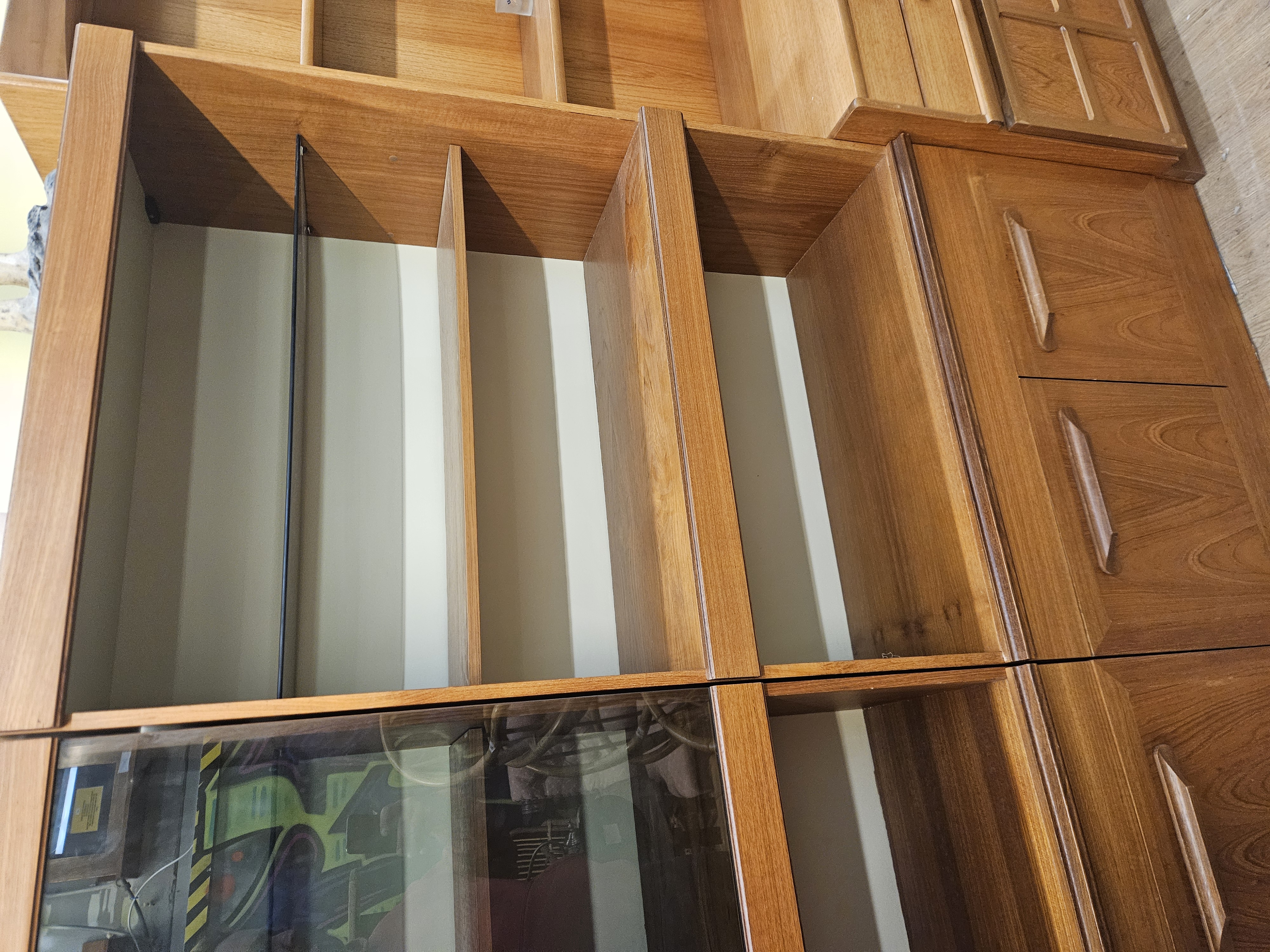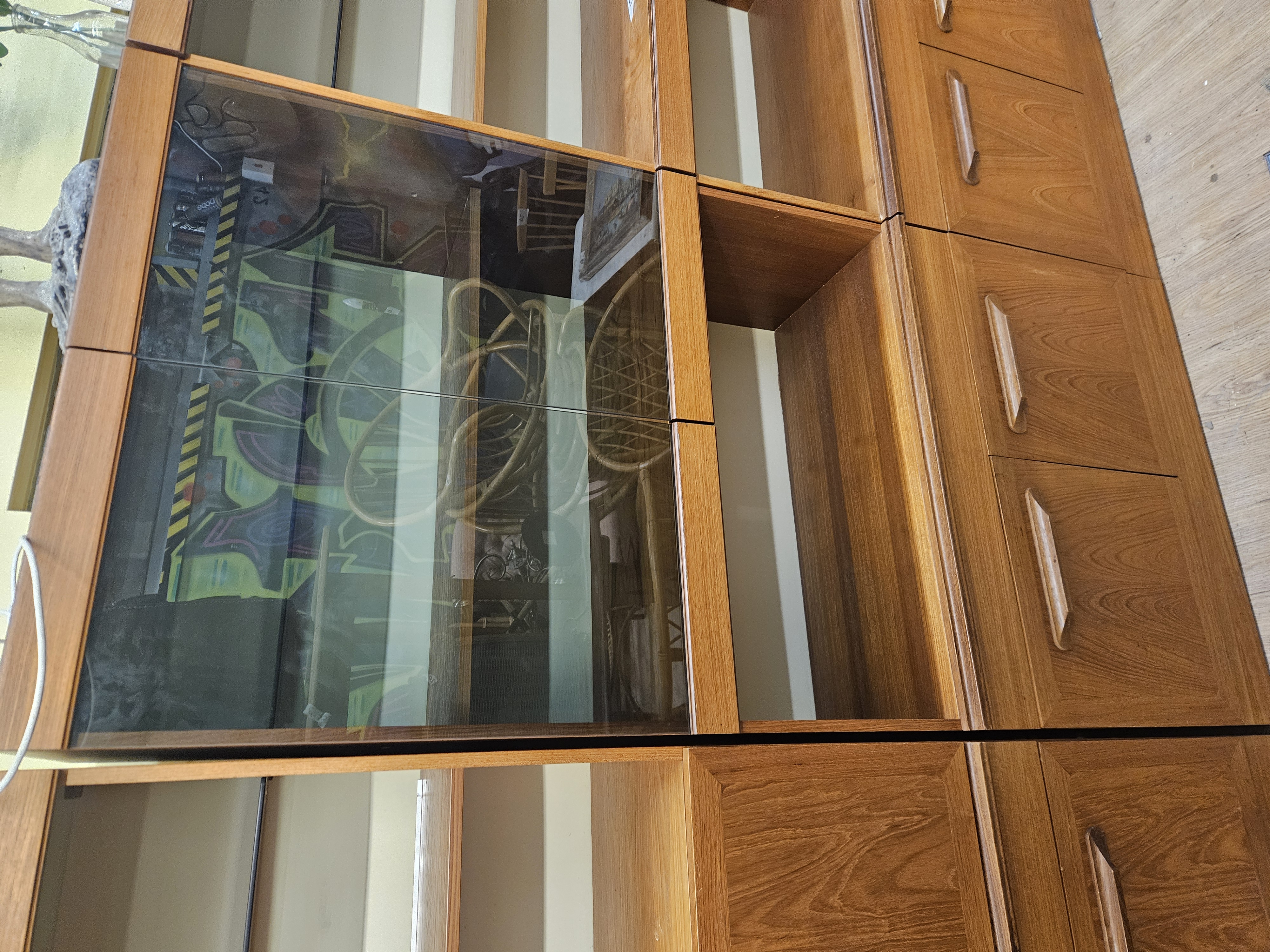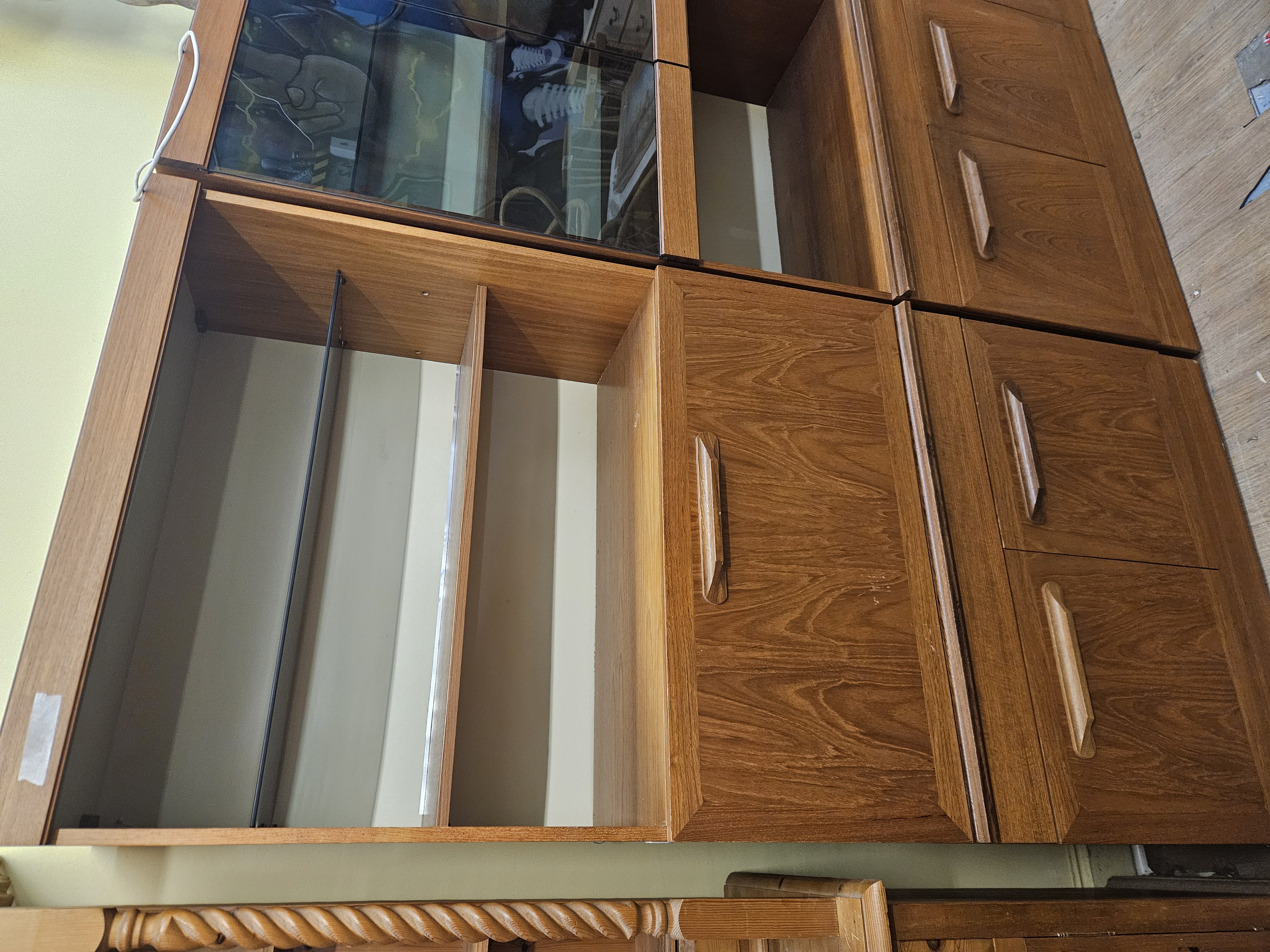 A modular teak wood wall unit comprising three sections with open shelving, drawers featuring integrated handles, and a smoked-glass fronted cabinet.