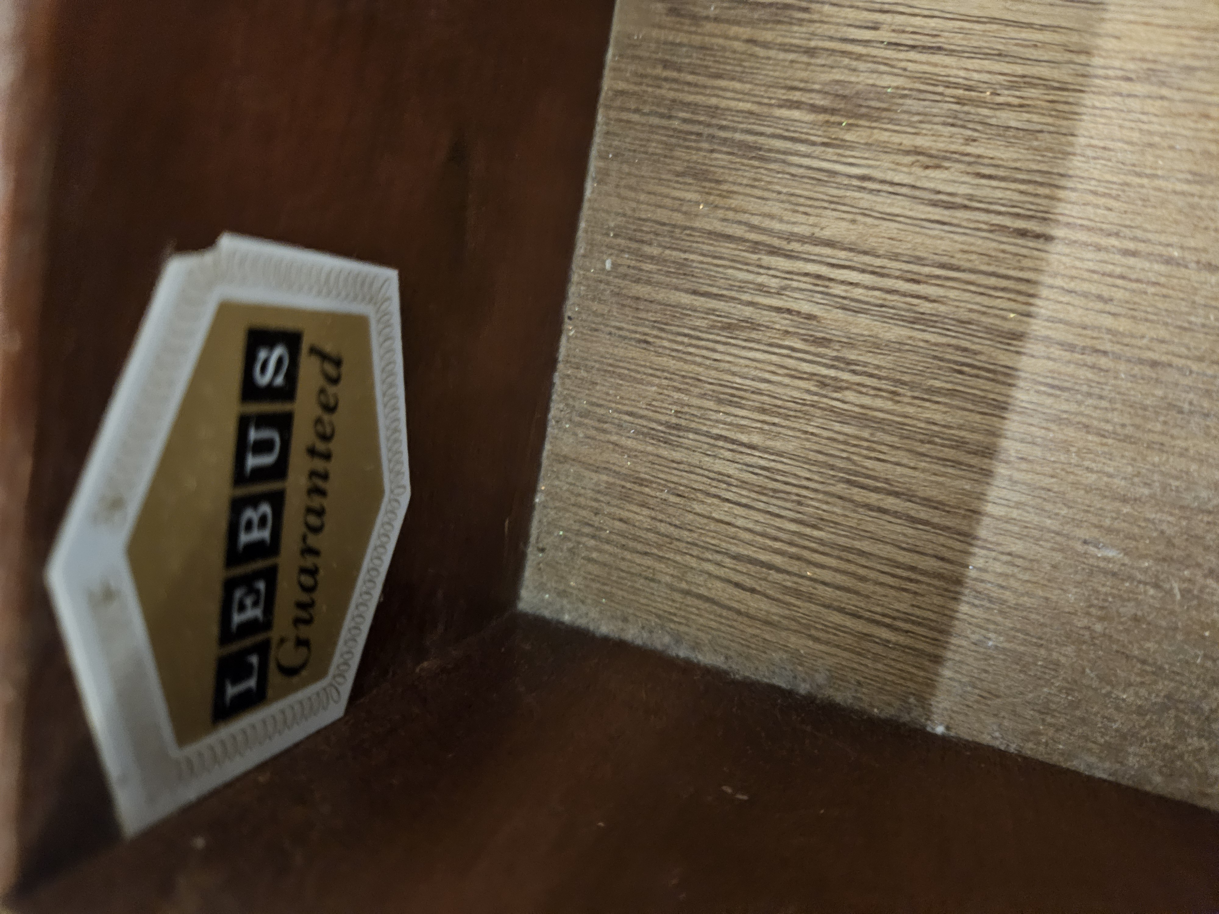 A mid-century modern chest of drawers manufactured by the British firm Harris Lebus. The piece is constructed with oak veneers and features four full-width drawers. A distinctive design element includes a darker contrasting horizontal band of veneer positioned between the second and third drawers. The unit is supported by four short tapered legs and includes a small raised gallery rail at the rear of the top surface. Each drawer is fitted with two original turned circular wooden pull knobs. The drawer interiors are constructed from a light-coloured secondary wood. A hexagonal paper label is present in one drawer interior featuring the LEBUS brand name and the word Guaranteed on a gold-coloured background.
