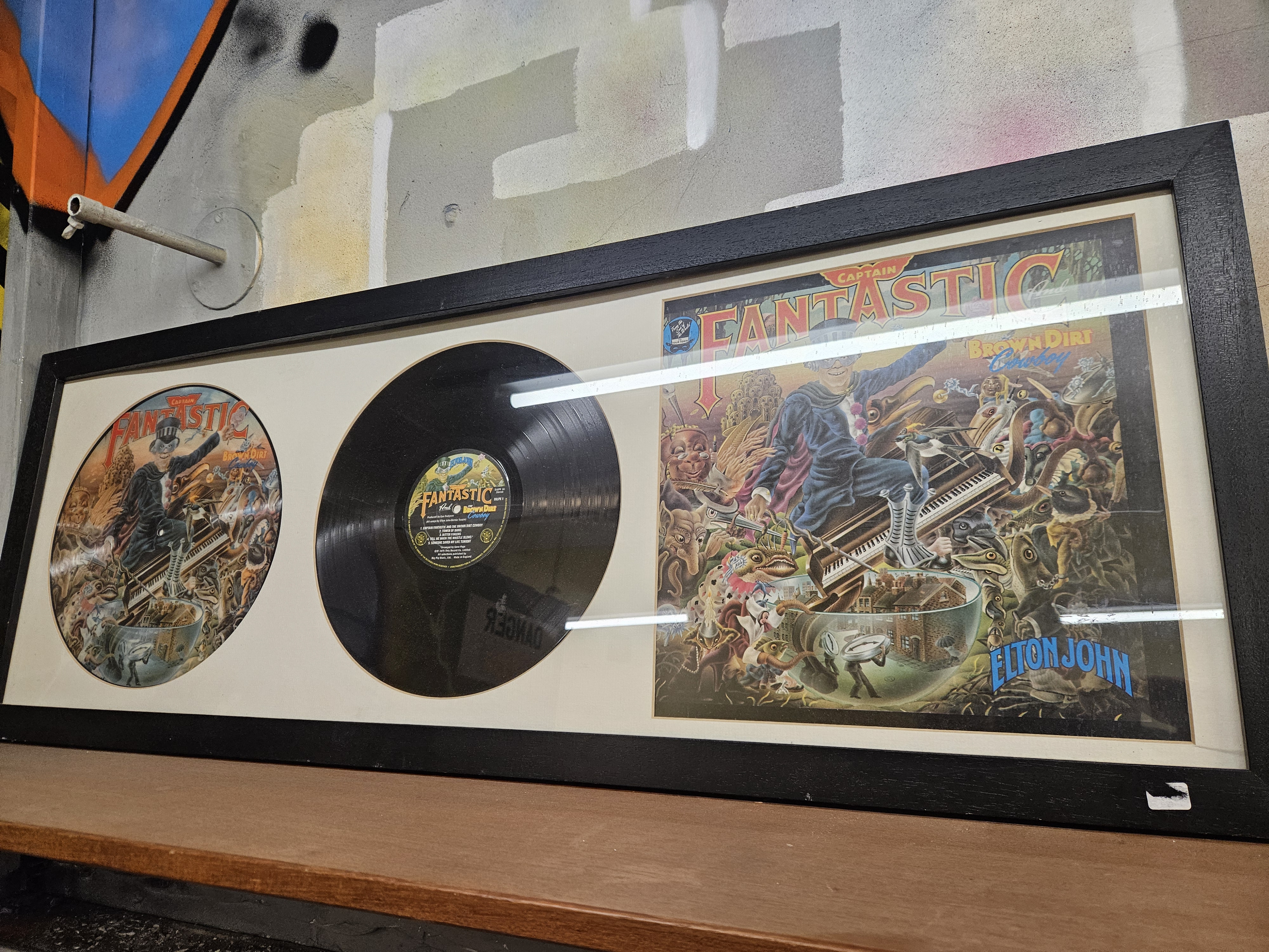 A professionally framed music memorabilia display featuring Elton John’s 1975 studio album Captain Fantastic and the Brown Dirt Cowboy. The display is housed in a horizontal black wooden frame with an off-white multi-aperture mount. It contains three distinct elements. To the left is a circular graphic featuring the album’s central character as illustrated by Alan Aldridge. The centre contains an original 12-inch black vinyl LP with a yellow and green DJM Records label. The label identifies the record as a UK pressing, featuring the text Made in England and (P) 1975 This Record Co. Limited, with production credited to Gus Dudgeon. The right side features the full album cover art with the artist’s name Elton John in stylized blue lettering.