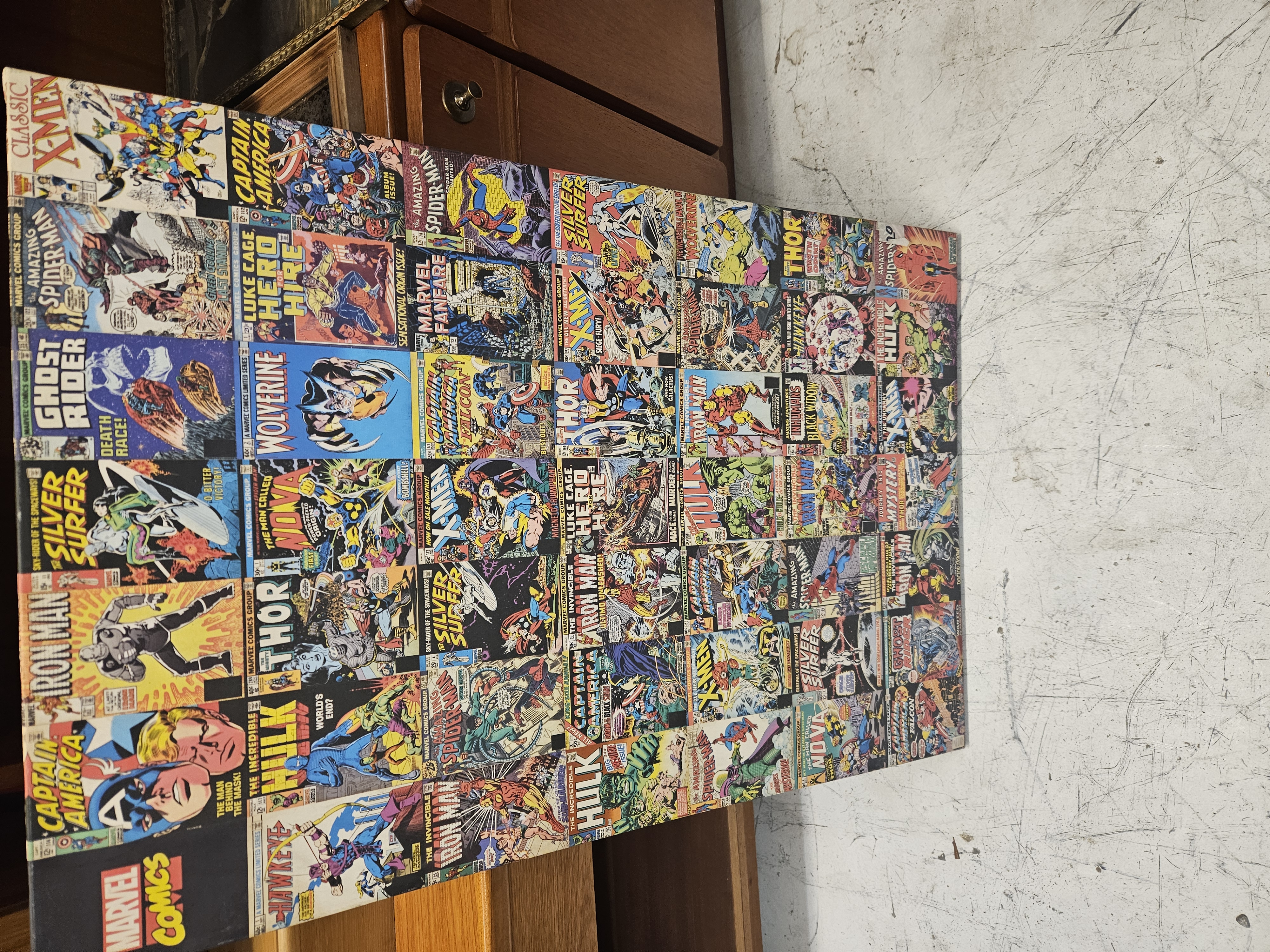 A rectangular wall art panel featuring a printed collage of various Marvel Comics cover reproductions, attributed to American Art Decor. The grid-style arrangement includes titles such as The Amazing Spider-Man, Iron Man, Captain America, The Incredible Hulk, Thor, Silver Surfer, Ghost Rider, Wolverine, and Classic X-Men. The covers represented are primarily from the Silver and Bronze Age eras, featuring the Marvel Comics Group branding and vintage price points. The item is constructed as a printed board or canvas mounting, designed for portrait orientation display.