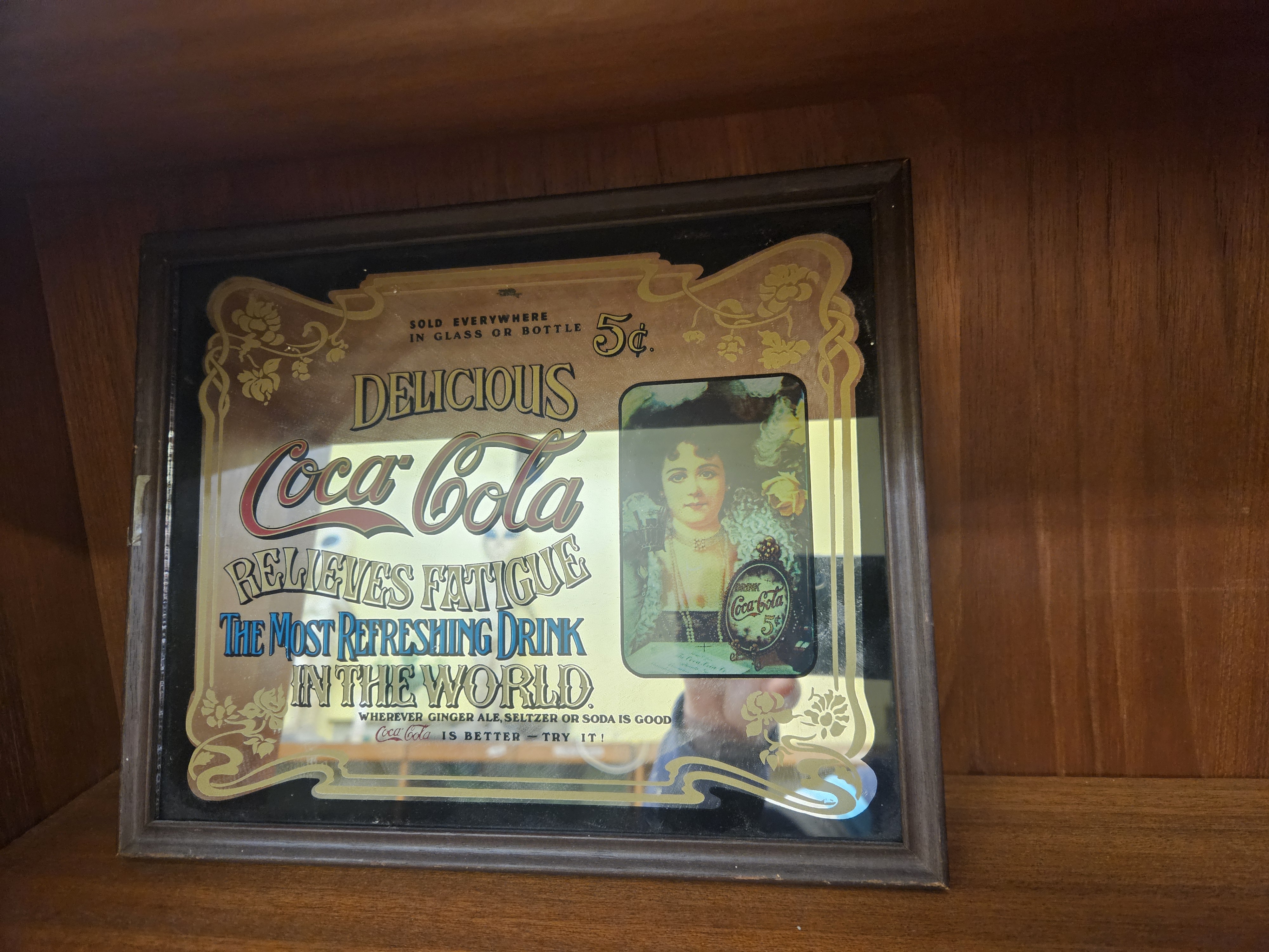 A rectangular advertising mirror featuring screen-printed graphics in the Art Nouveau style. The design incorporates a gold-coloured ornate floral border framing central promotional text and an inset oval portrait of a woman in early 20th-century attire holding a glass of Coca-Cola. The text includes the slogans SOLD EVERYWHERE IN GLASS OR BOTTLE 5c, DELICIOUS Coca-Cola RELIEVES FATIGUE, and THE MOST REFRESHING DRINK IN THE WORLD. The Coca-Cola brand name is displayed in the signature Spencerian script. The mirror is mounted within a dark-stained wooden frame. This item is a late 20th-century decorative reproduction of early 20th-century advertising material, commonly produced for home bars and commercial establishments during the 1970s and 1980s.