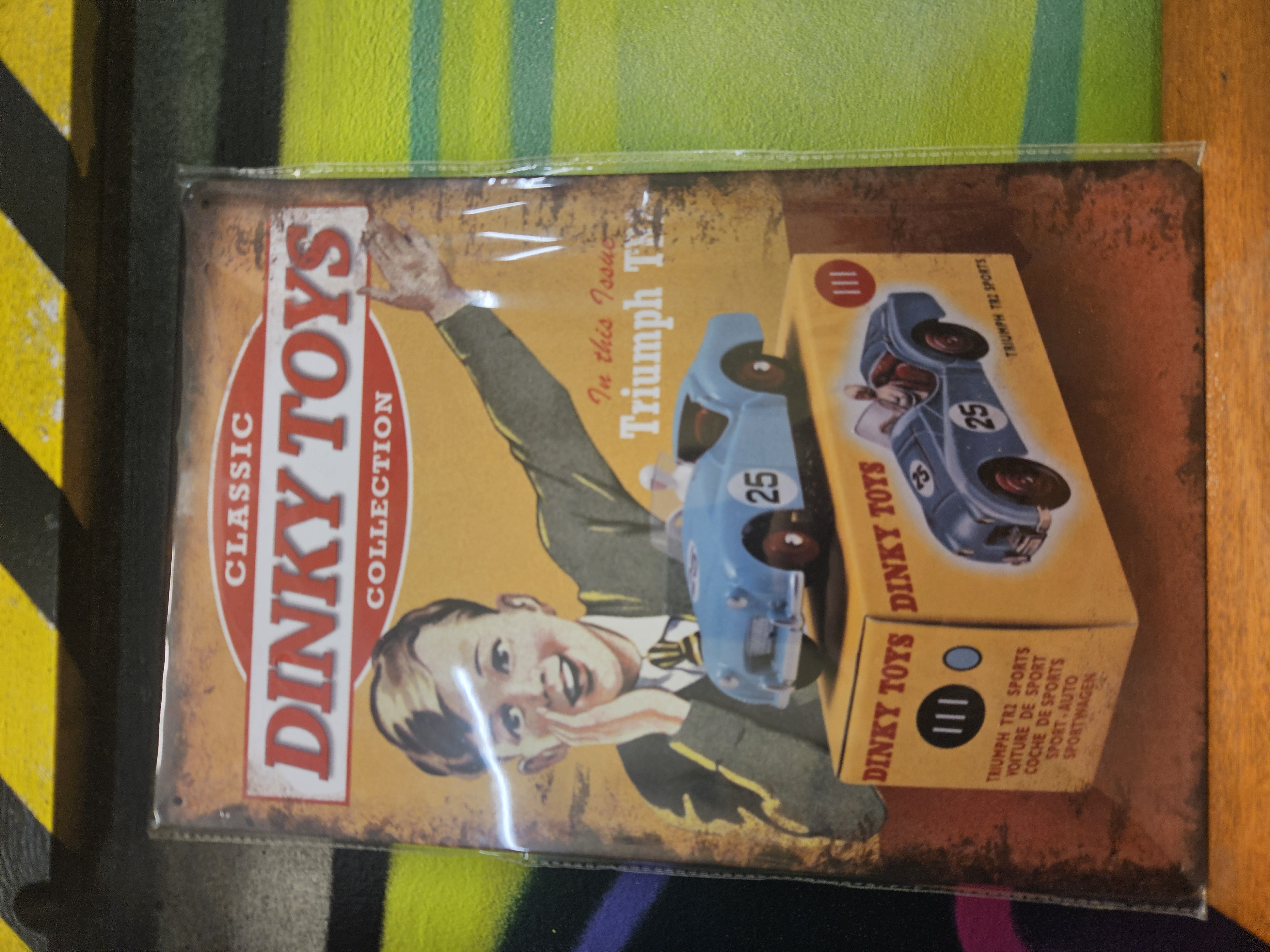 A rectangular printed tinplate advertising sign produced for the DeAgostini Classic Dinky Toys Collection. The graphic features a nostalgic illustration of a young boy alongside a blue Triumph TR2 sports car bearing the racing number 25. The design incorporates a depiction of the original Dinky Toys model 111 packaging, including multilingual text such as Voiture de Sport and Sportwagen. The sign is styled as a modern reproduction with printed faux-distressed edges to simulate oxidation and age. It features the branding Classic Dinky Toys Collection within a red oval and the text In this Issue Triumph TR2. The item is housed in a clear plastic protective sleeve.