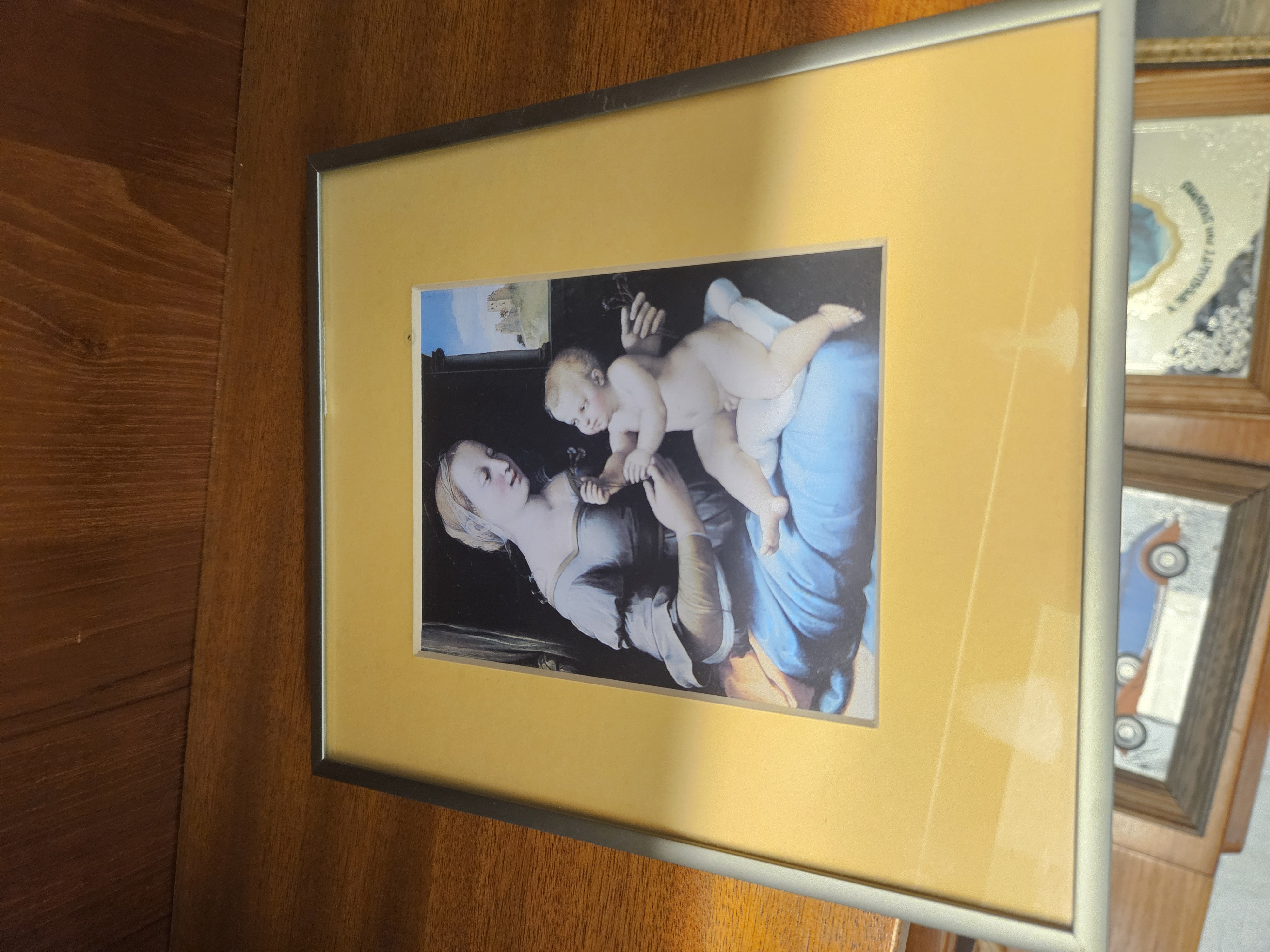 This item is a colour print on paper after the original Renaissance painting by Raphael, titled ‘Madonna of the Pinks’ (Madonna dei Garofani). The composition features the Madonna in a grey dress with gold-toned sleeves holding a seated infant, with both figures holding small flowers. A window in the background reveals a landscape with a distant castle under a blue sky. The work is mounted within a wide mustard-yellow mat and housed in a modern, slim silver-toned frame under glass. No signature, date, or inscriptions are visible on the face of the item.