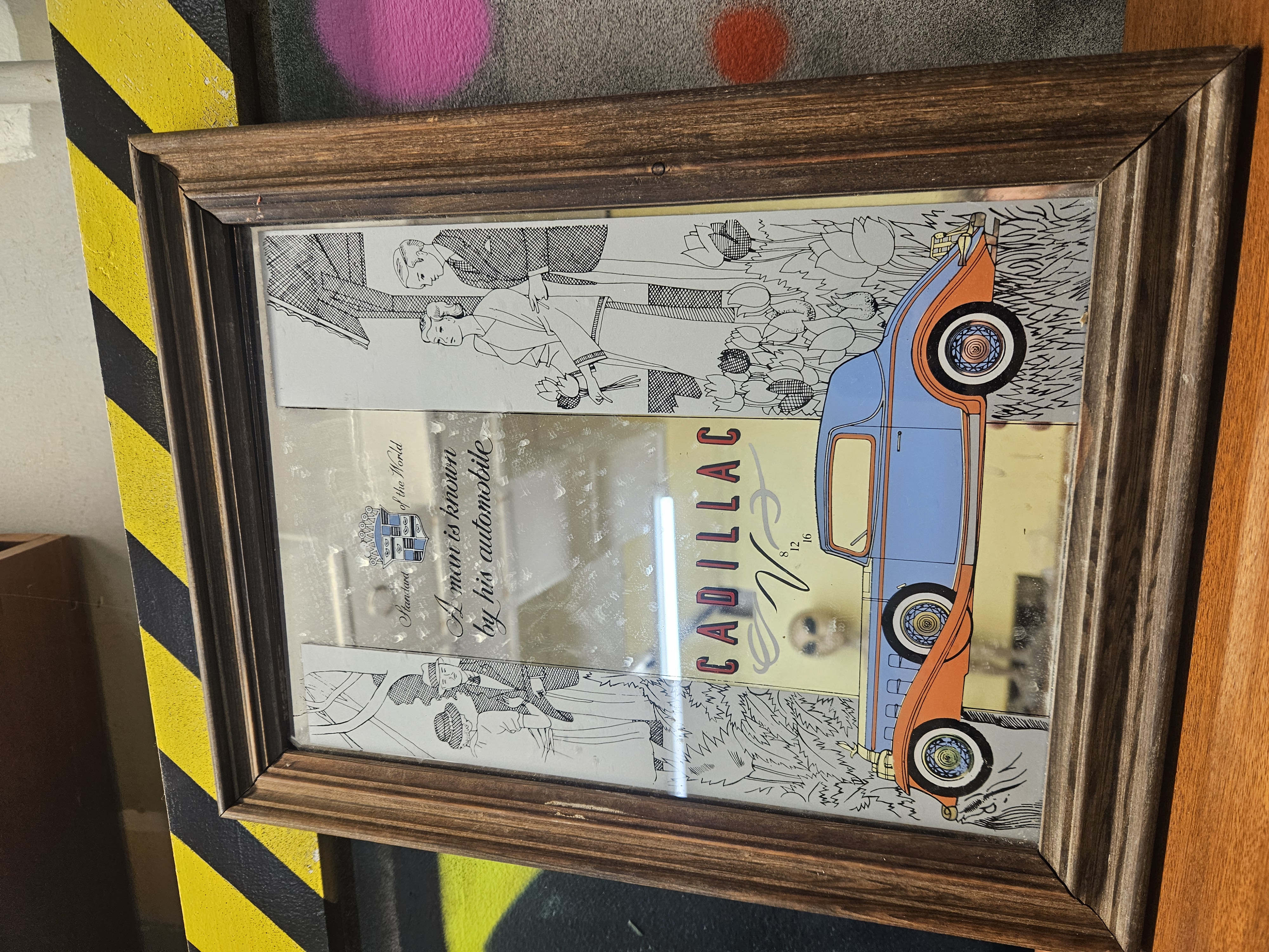 A late 20th-century decorative advertising mirror for Cadillac automobiles, featuring graphics in the Art Deco style of the 1930s. The mirror plate is reverse-printed with a central illustration of a vintage coupe in blue and orange livery. The design is flanked by monochrome line-art scenes depicting figures in period evening attire amongst floral motifs. The display incorporates official Cadillac branding, including the crest and crown logo, the slogan Standard of the World, and the phrase A man is known by his automobile. A stylized V motif to the right contains the numbers 8, 12, and 16, denoting the engine configurations offered by the manufacturer during the interwar period. The glass plate is set within a dark brown moulded wooden frame with a visible grain.