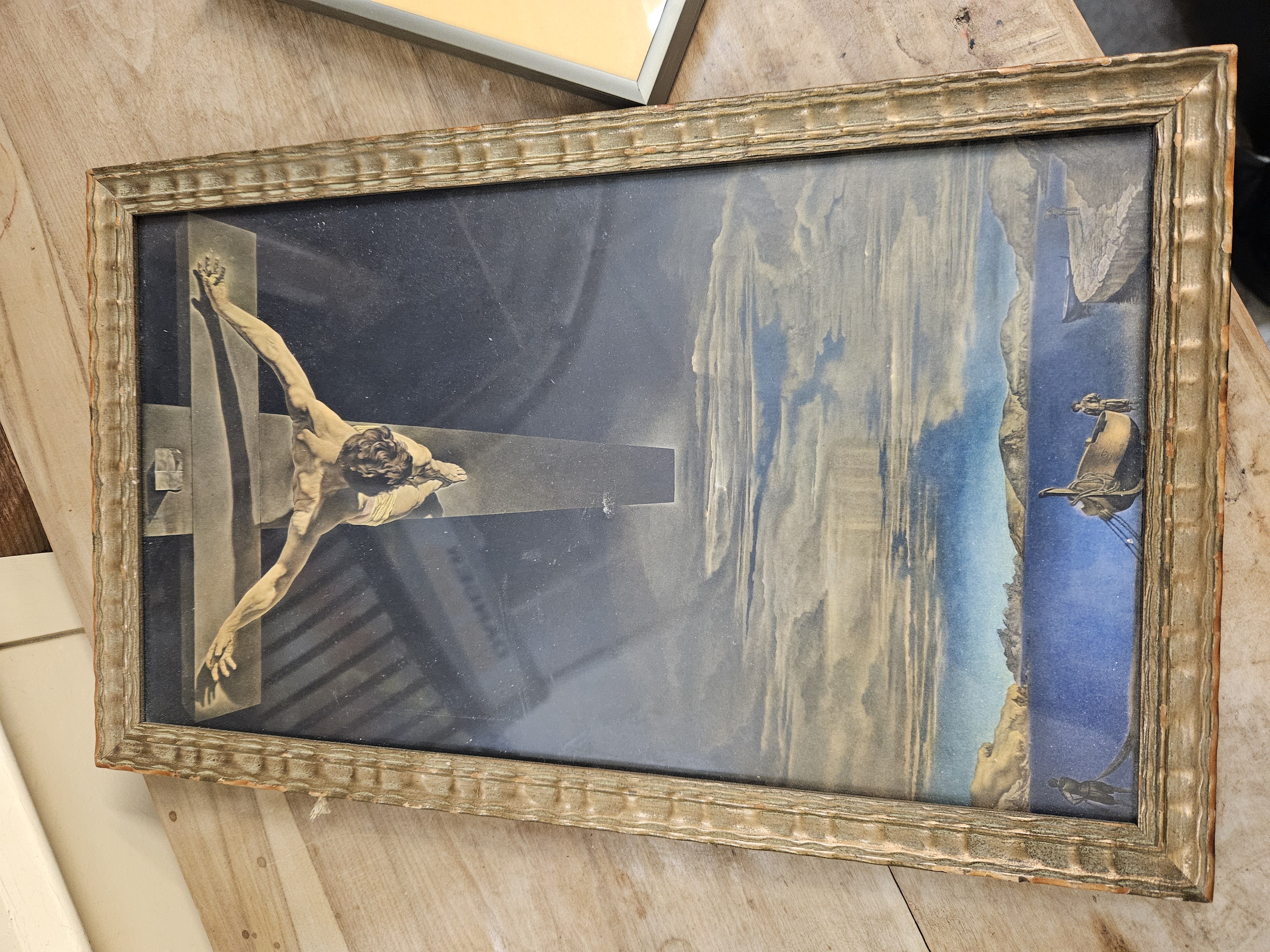 A photo-mechanical print on paper after the original 1951 painting by Salvador Dalí titled ‘Christ of Saint John of the Cross’. The composition depicts the crucifixion from a dramatic overhead perspective, suspended above a coastal landscape with figures and a boat. The print is housed under glass within an ornate, moulded gilt-finished frame featuring a repeating reeded pattern. No signatures, dates, or inscriptions are visible on the face of the artwork.