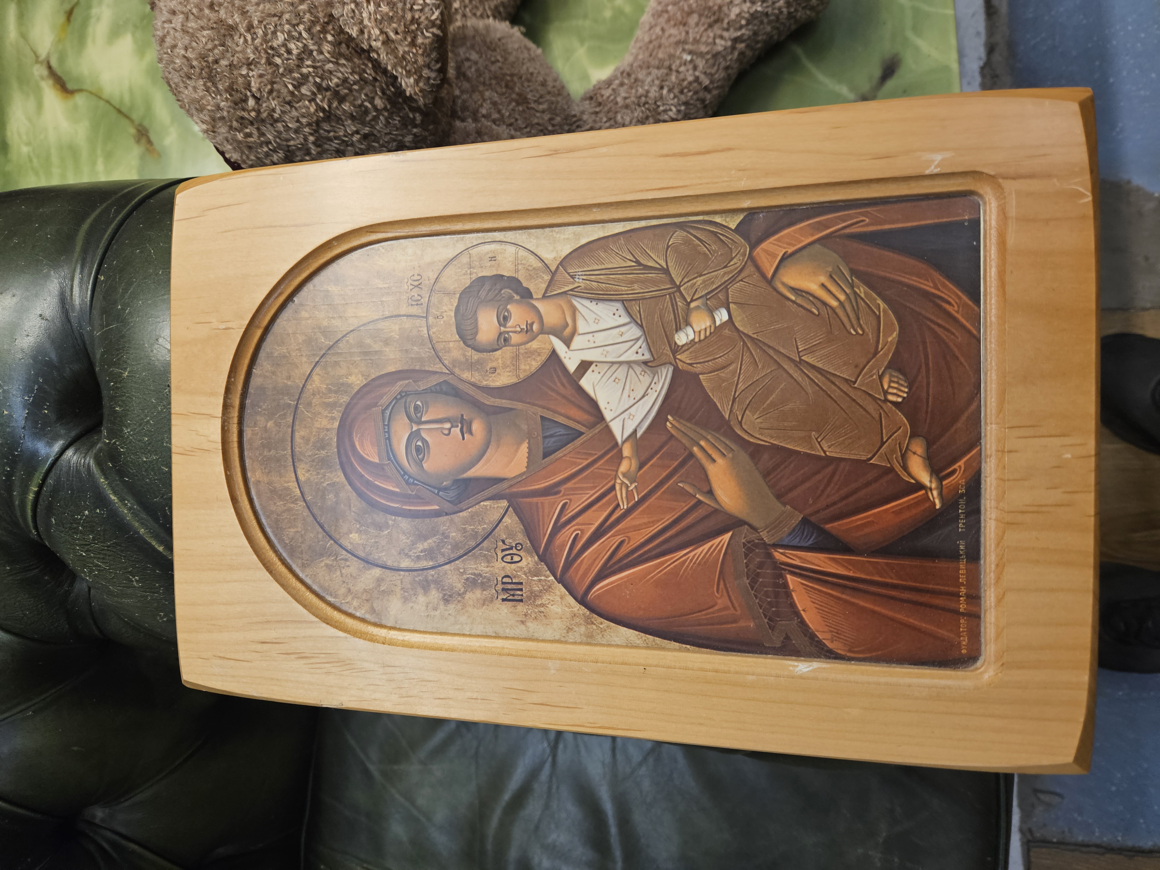 A contemporary religious icon depicting the Mother of God Hodegetria with the Christ Child. The item is a high-quality colour print mounted on a light-coloured wooden board with a recessed arched kovcheg. The iconography features the Greek abbreviations IC XC (Iisous Khristos) and MP OY (Meter Theou). A vertical Cyrillic inscription in Ukrainian is located along the lower right edge: ФУНДАТОР: РОМАН ЛЕВИЦЬКИЙ ТРЕНТОН, ЗСА (Fundator: Roman Levytskyi Trenton, ZSA). This translates to Donor: Roman Levytskyi, Trenton, USA, identifying the patron and the origin within a Ukrainian diaspora community in the United States. The icon is a modern production.