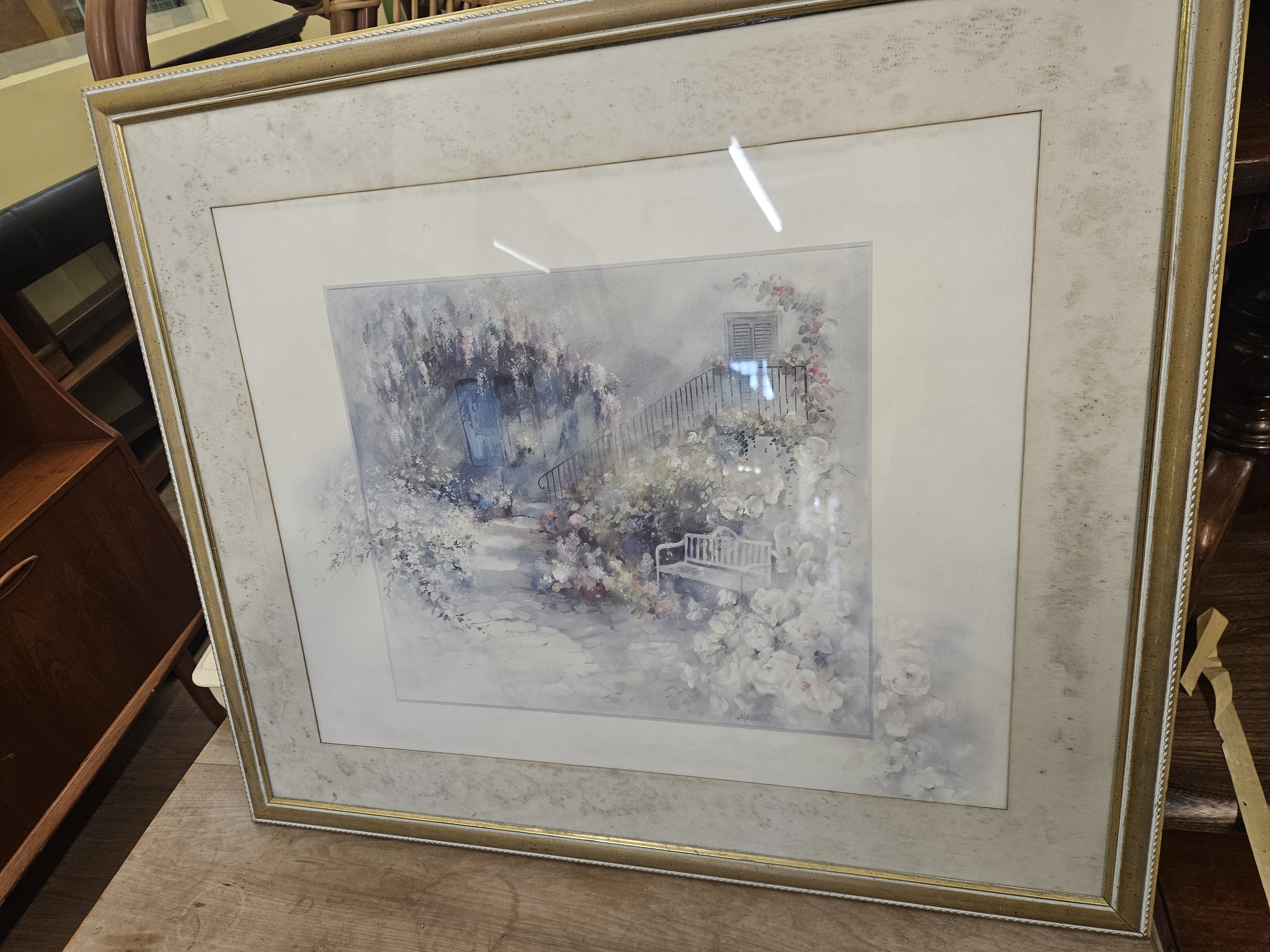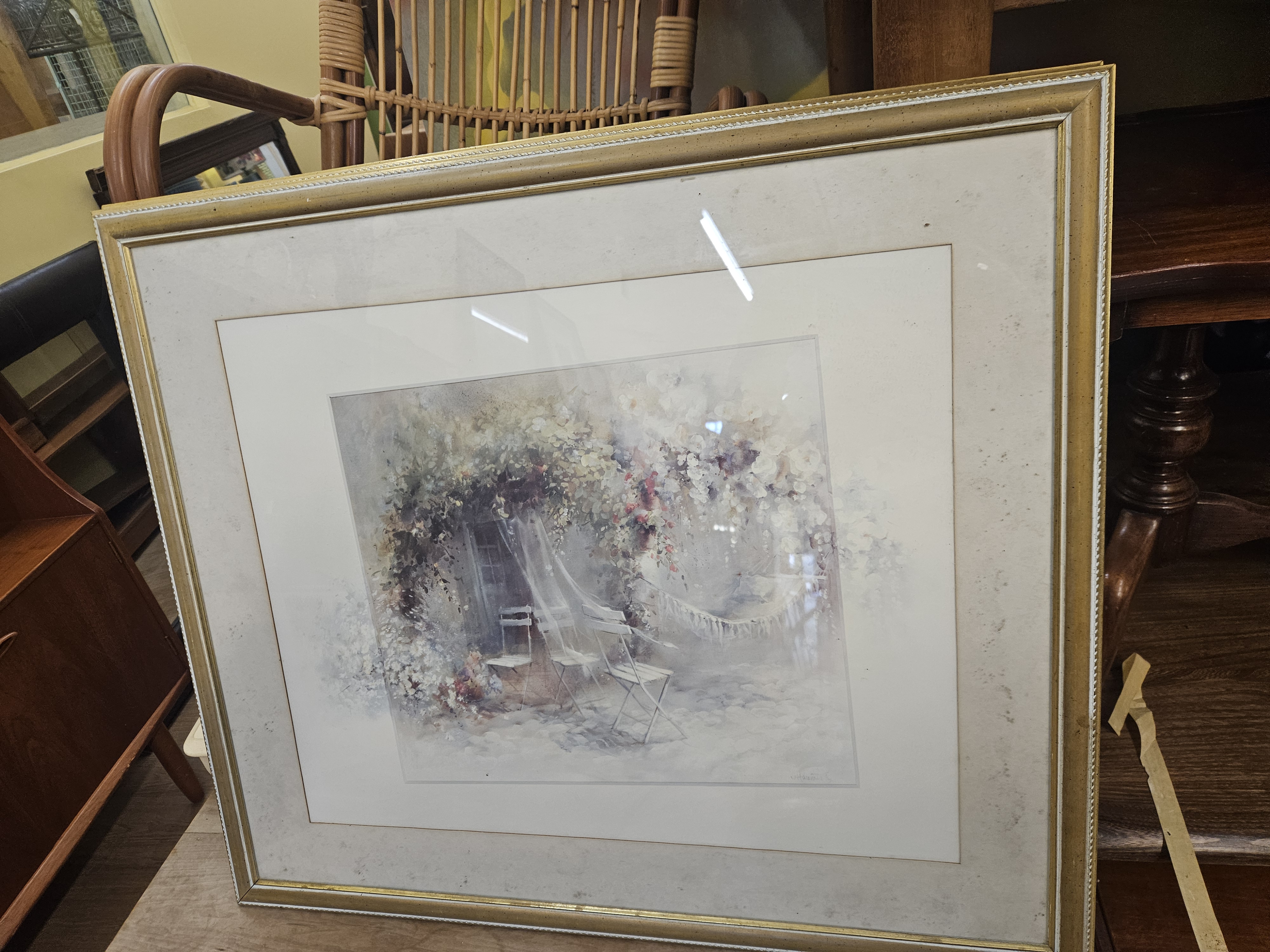 A pair of original works on paper by the artist Vivien Walmsley, executed in watercolour with gouache highlights. The compositions depict garden settings in a soft-focus, impressionistic style. The first work features a white garden bench positioned amongst white and pink blossoms, set against the backdrop of a blue door and wrought iron railings. The second work illustrates a pair of white bistro chairs and a fringed hammock suspended beneath a floral canopy. Both works are signed V. Walmsley in the lower right corner. The pieces are housed in matching gilt-edged frames with wide, textured cream mounts.