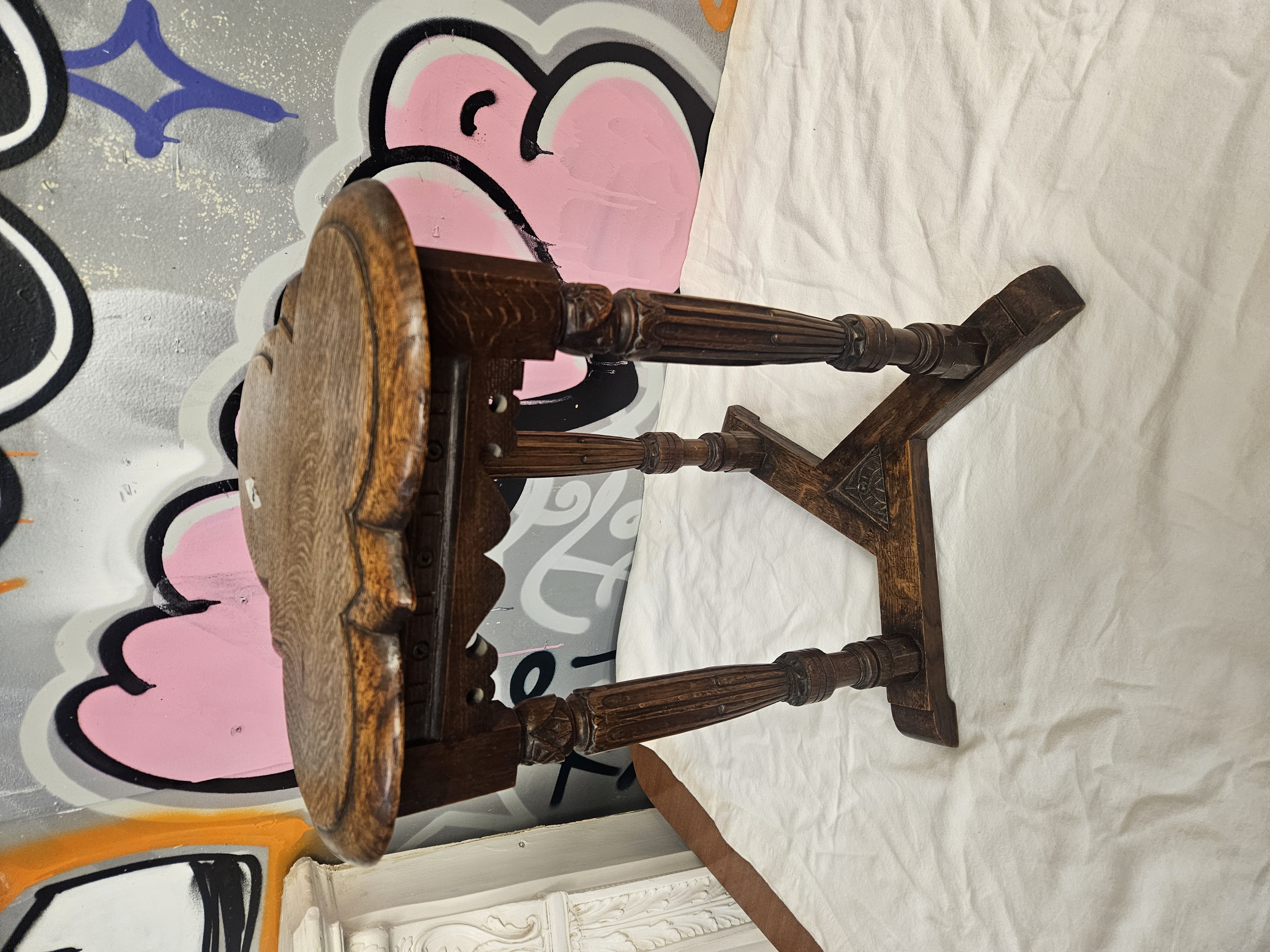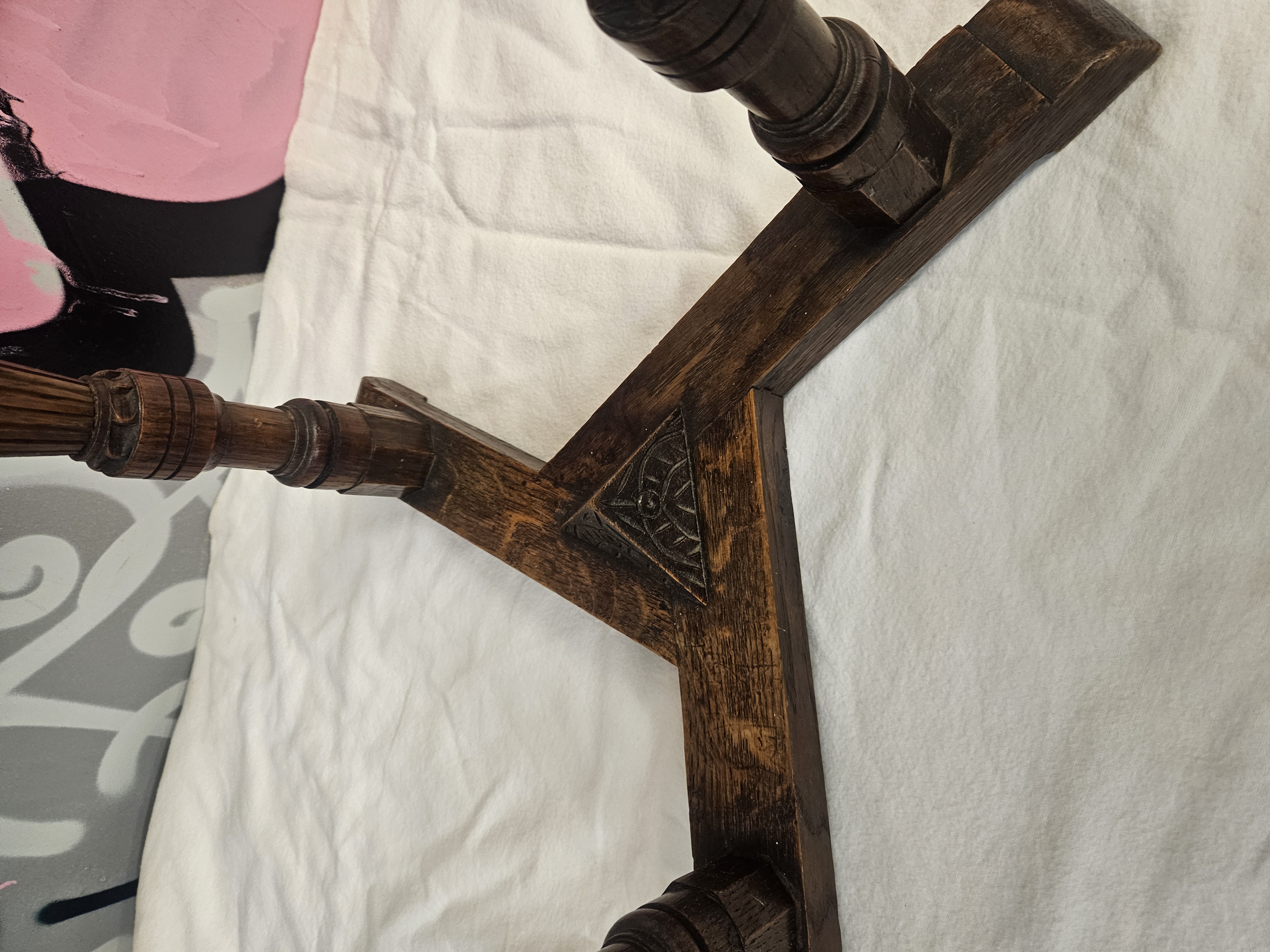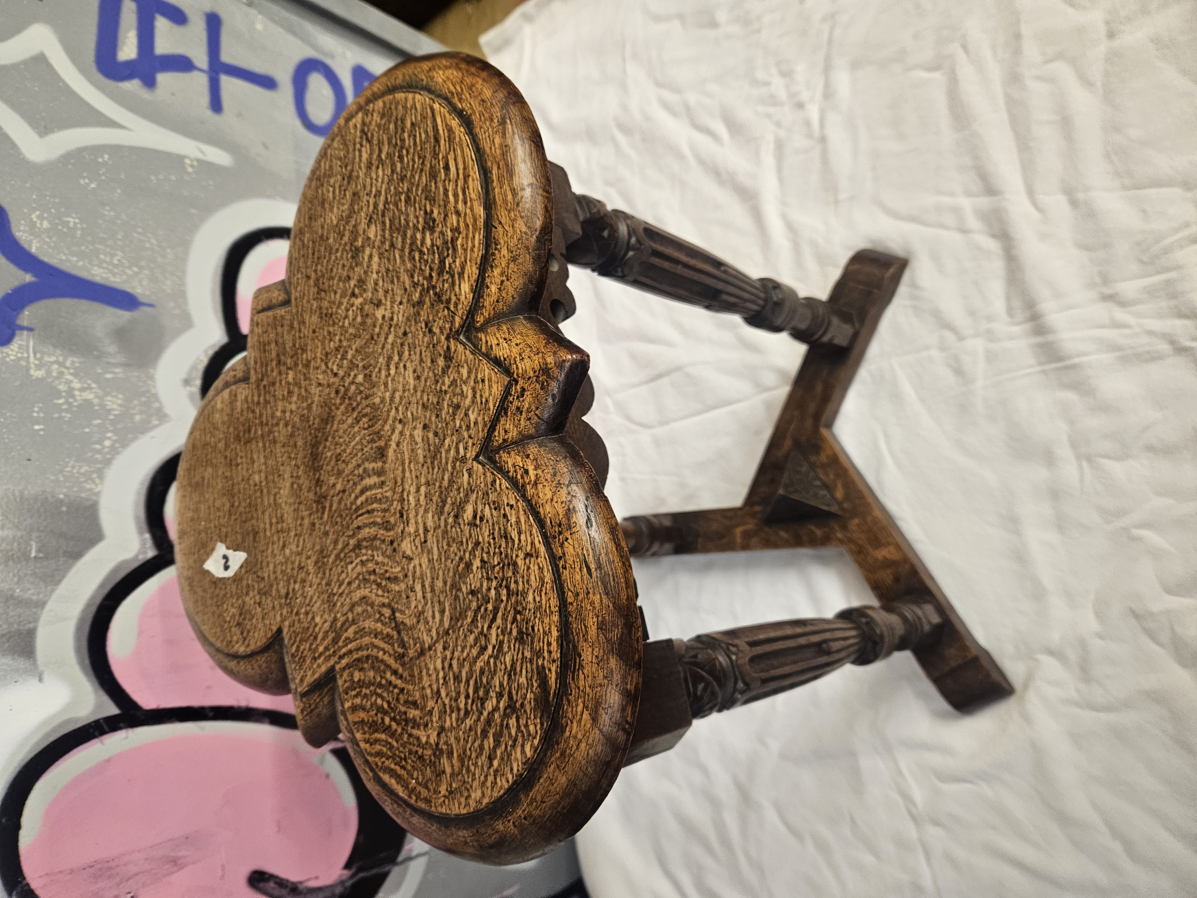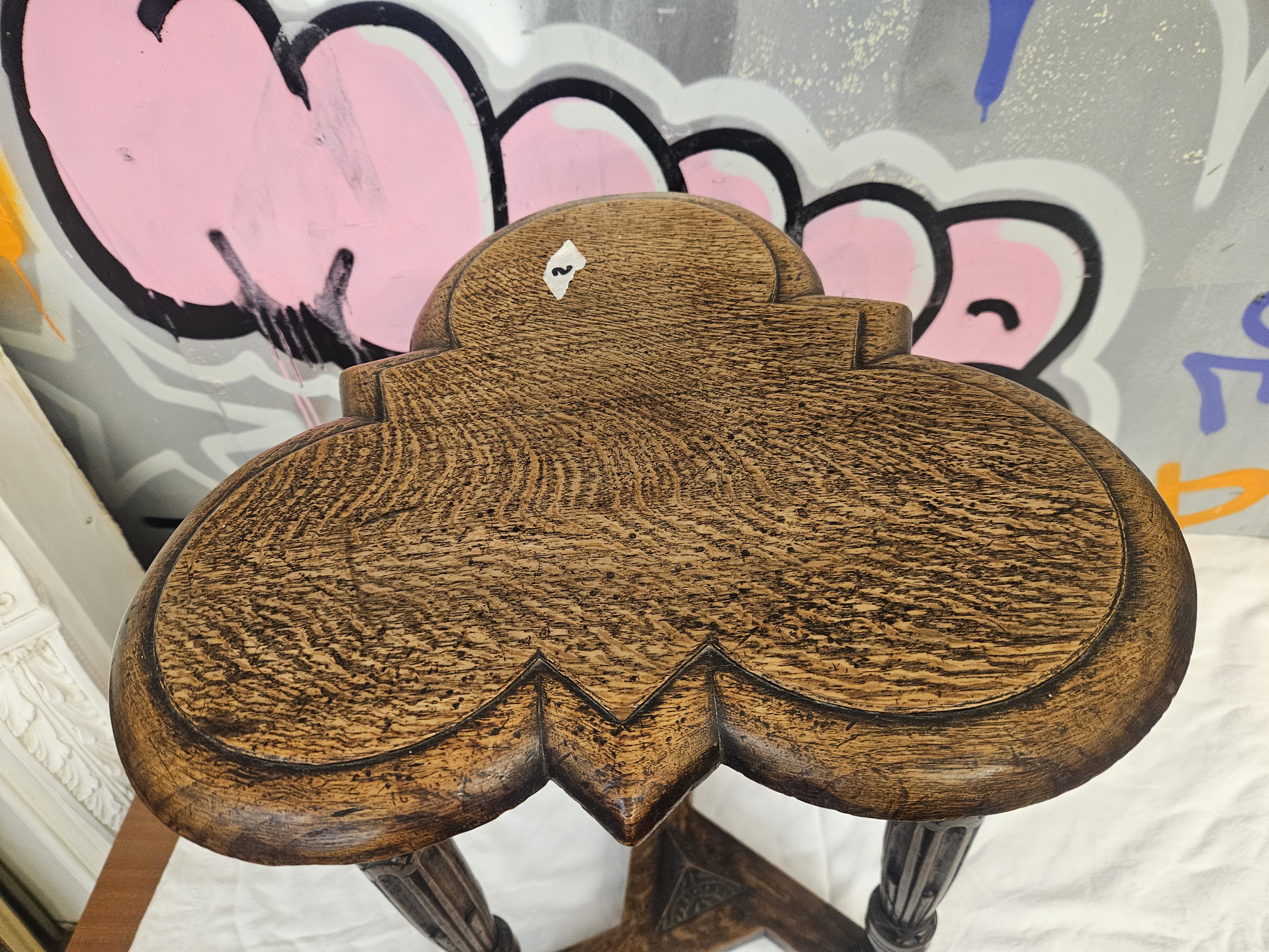 A mid-20th century oak occasional table constructed in the Jacobean Revival style. The solid oak top features a trefoil or clover leaf design with a moulded edge and notched corners. The base consists of three turned and fluted legs terminating in block feet, joined by a triangular stretcher. The stretcher is decorated with a central carved triangular boss depicting a floral motif. The wood is finished with a dark stain, showing a prominent grain throughout. This design is characteristic of 20th-century British revivalist furniture, often produced by makers such as Wood Bros or Titchmarsh and Goodwin.