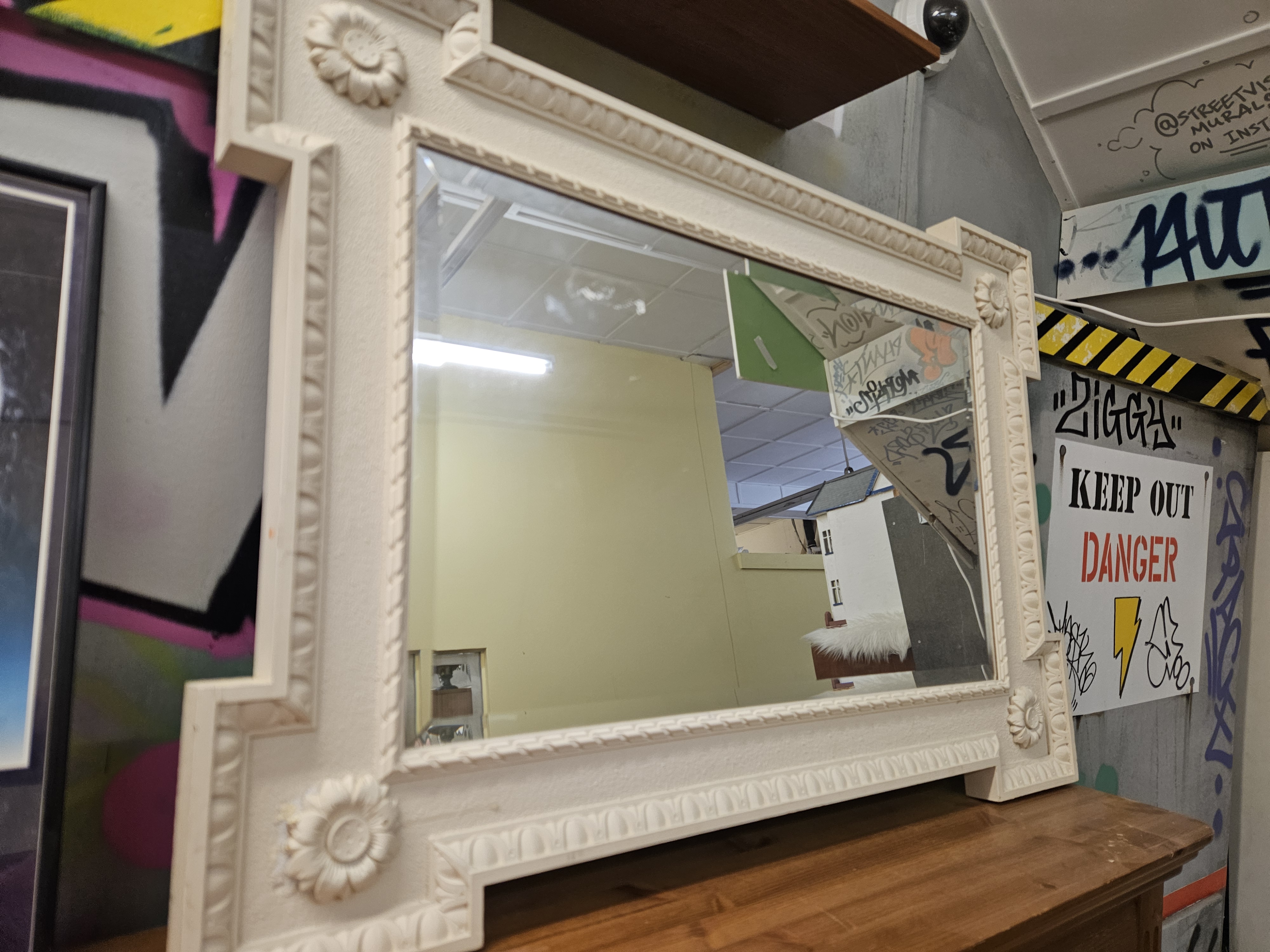 A late 20th-century wall mirror designed in the Neoclassical revival style. The rectangular frame is constructed from a moulded composite material with a textured matte off-white finish. The architectural form features eared or crossette corners, each decorated with an applied floral rosette. The frame is further detailed with repeating moulded gadroon-style patterns to both the inner and outer borders. The mirror houses a bevelled glass plate. No maker marks or inscriptions are visible on the front or edges of the item.