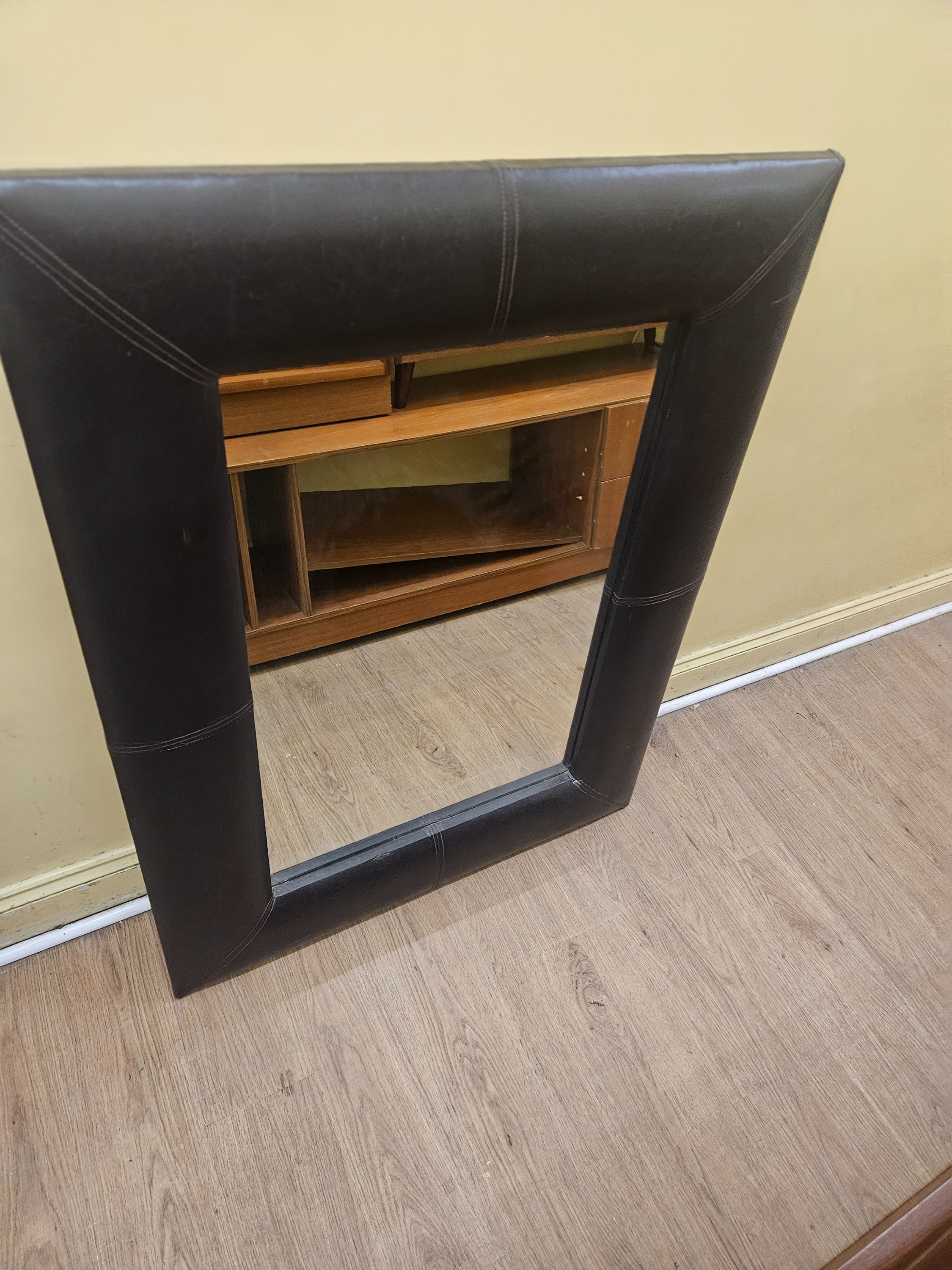 A large contemporary wall mirror featuring a wide bevelled frame upholstered in a dark brown or black leather-effect material. The frame design is characterised by visible contrast top-stitching at each mitred corner and centred on each of the four rails. The style is similar to contemporary luxury home furnishings such as the Clove leather mirror by Ben Soleimani, though no labels or marks are present to confirm a specific manufacturer. The mirror plate is clear and appears to be original to the frame.