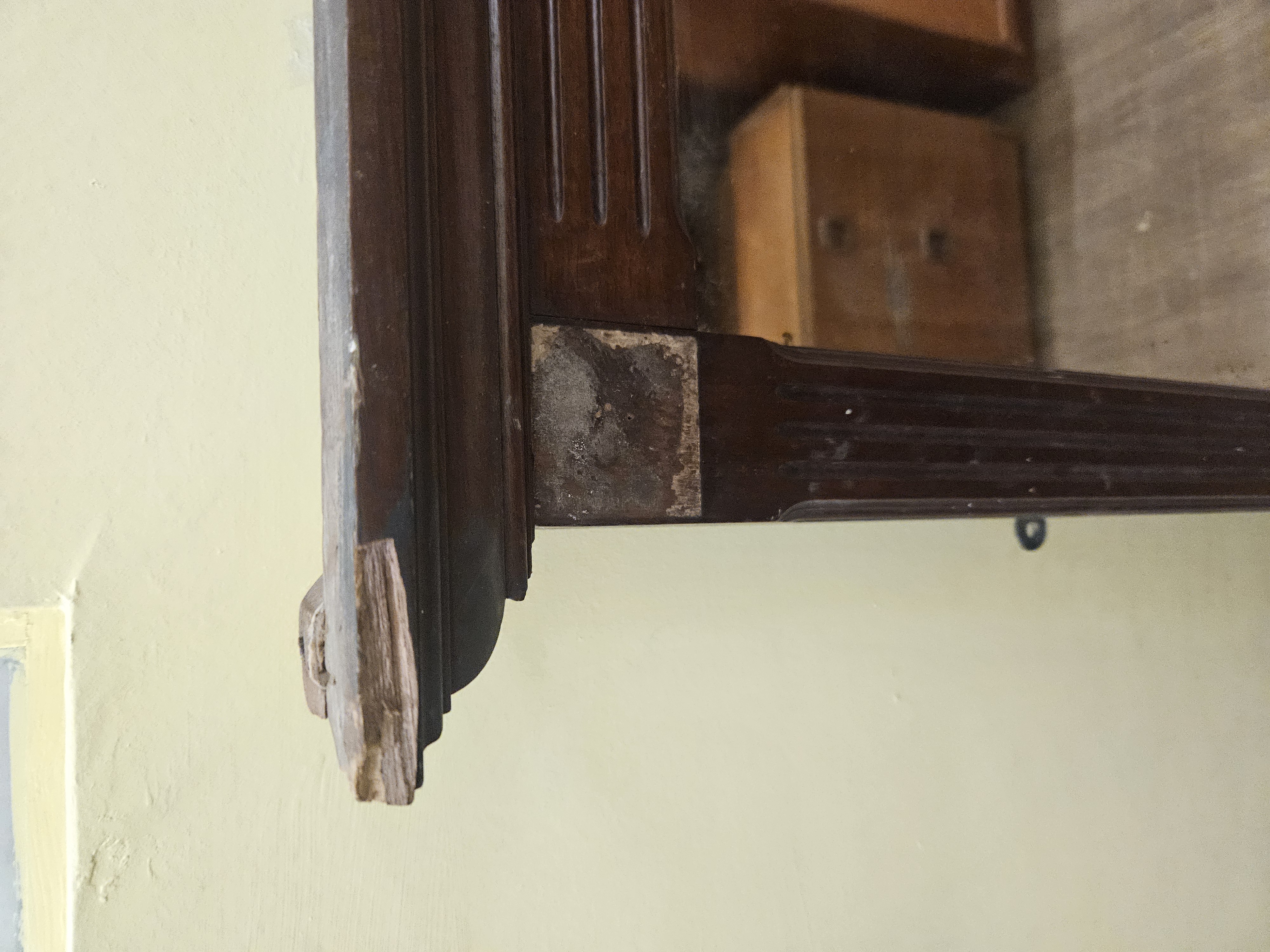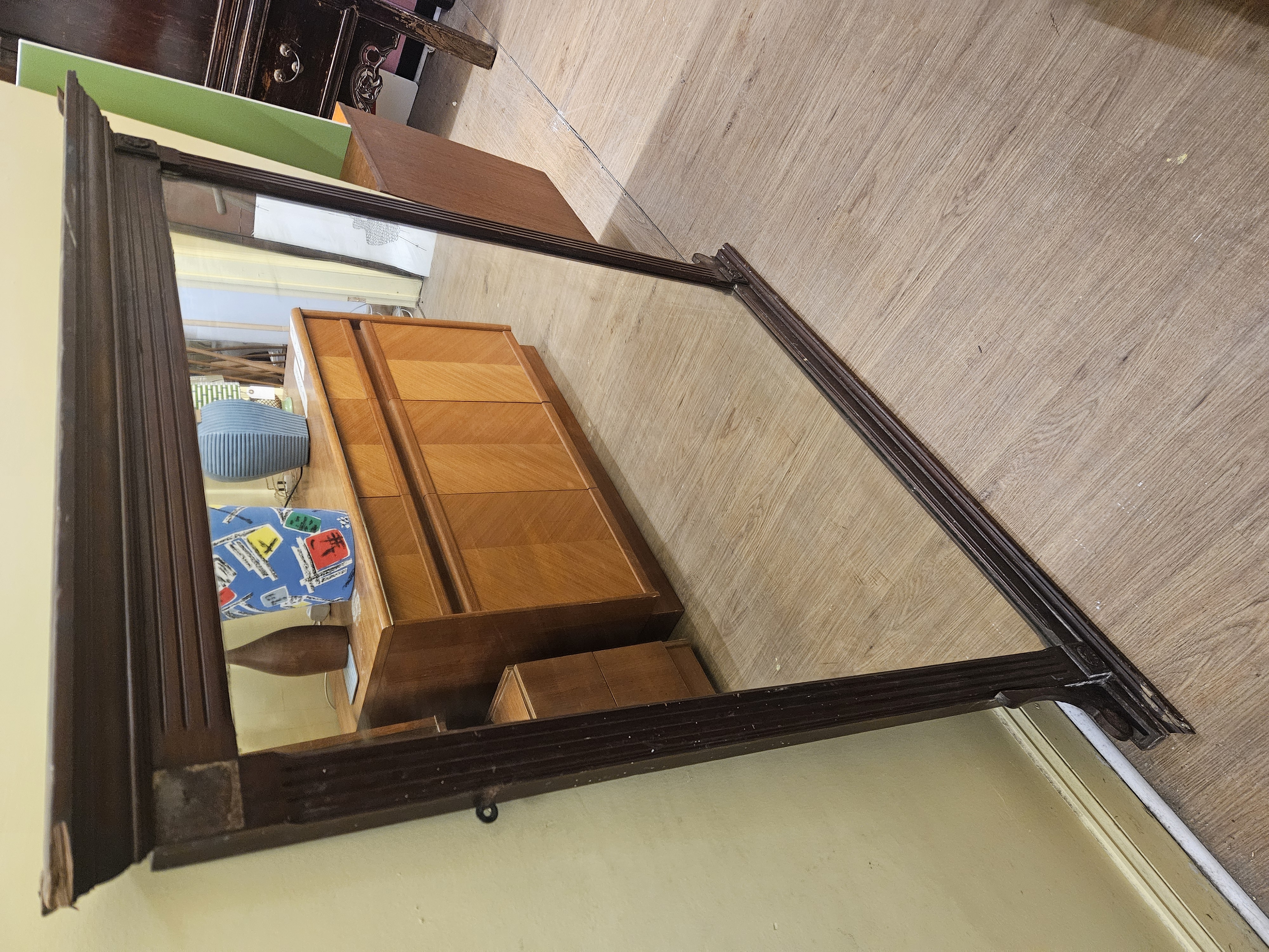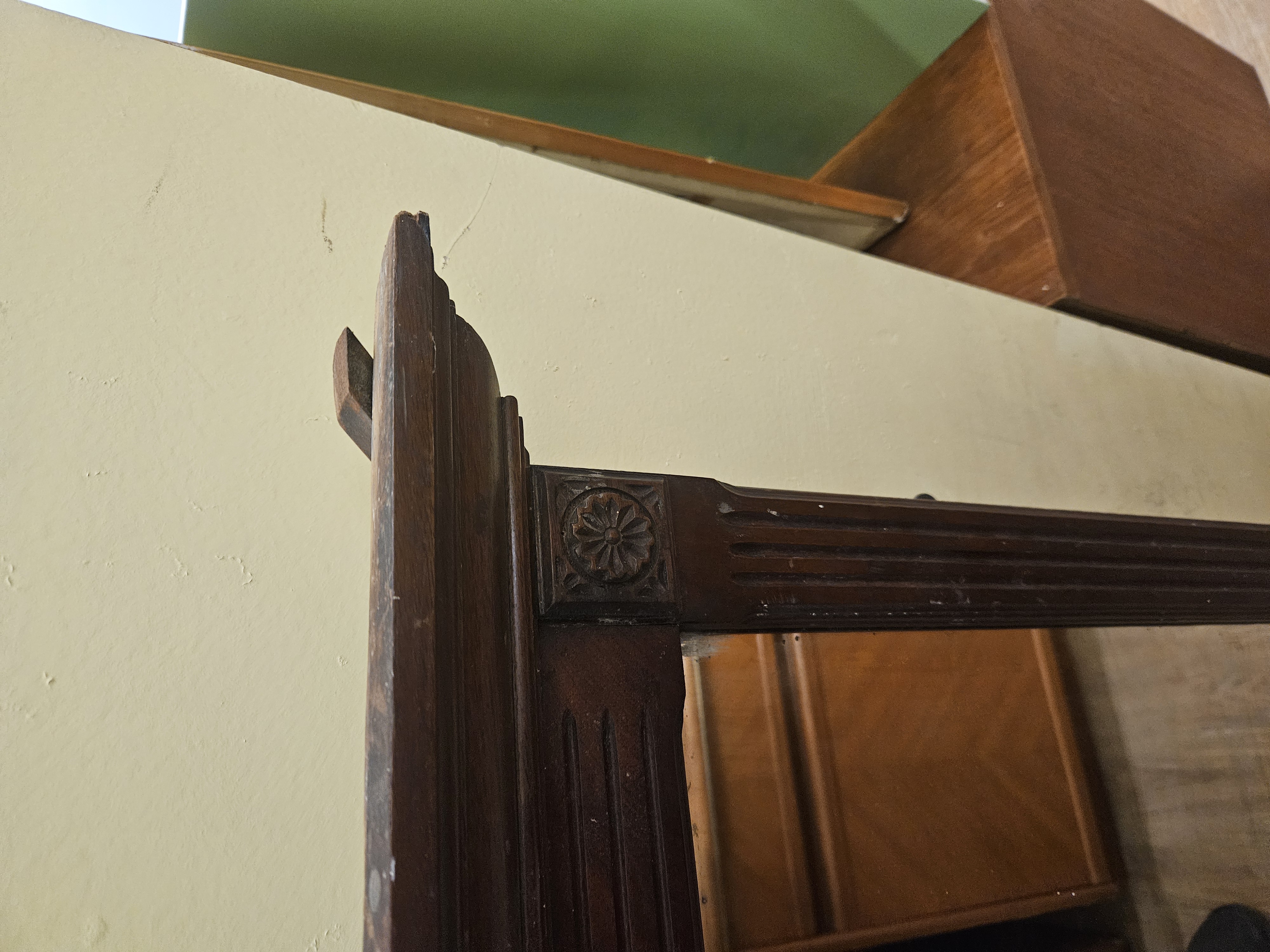 A large landscape wall mirror of architectural form, dating to the late 19th or early 20th century. The frame is constructed from mahogany with a dark-stained finish. It features a prominent stepped and moulded cornice above a rectangular mirror plate. The side uprights are designed as pilasters with recessed fluting. The upper corners are accented with square blocks, one of which retains a carved floral rosette. The construction suggests it was originally intended as an overmantel mirror or as part of a larger dressing suite. No maker’s marks or labels are present.