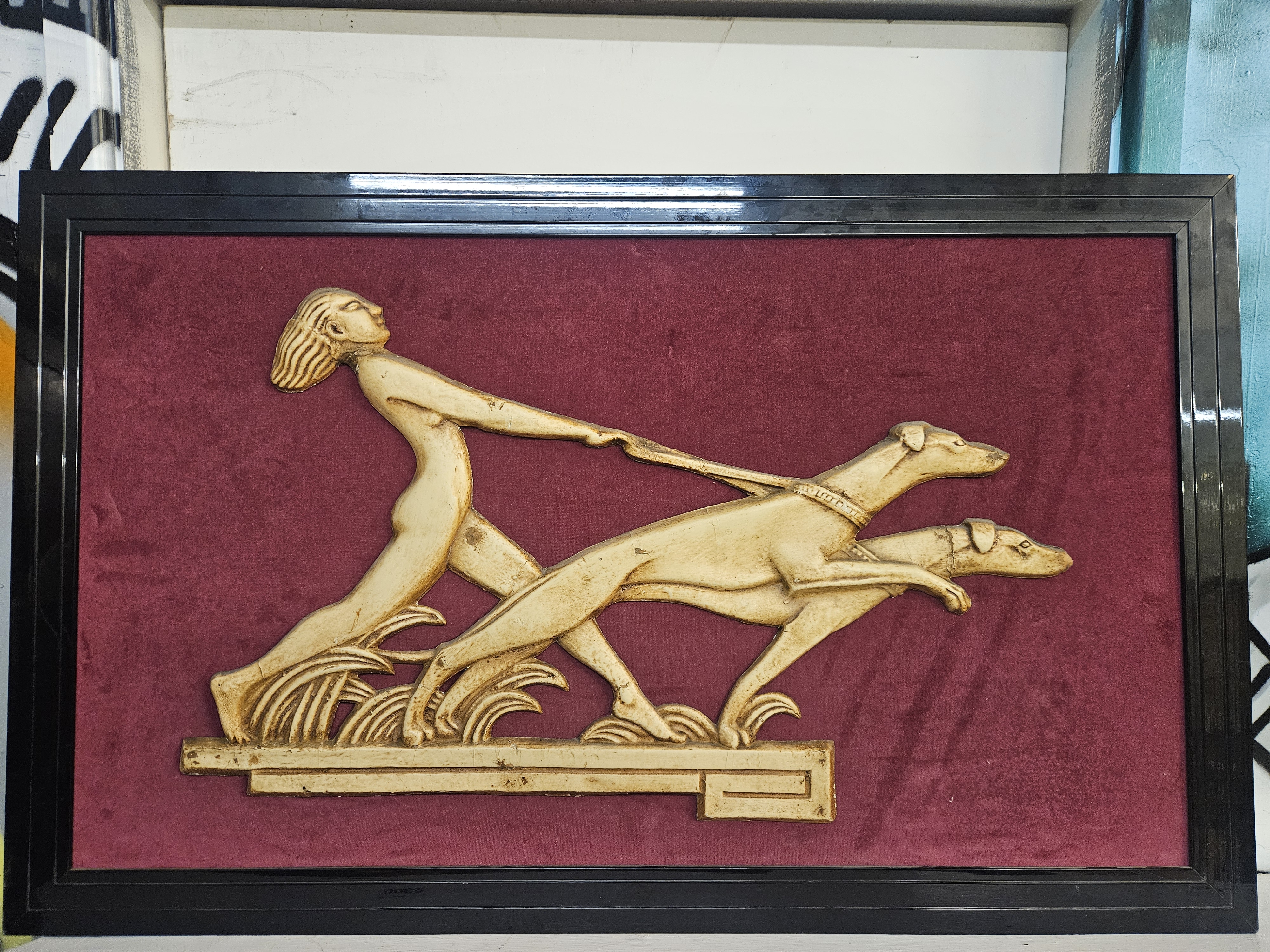 This framed wall relief is executed in the Art Deco style, featuring a composition material plaque with an ivory-coloured finish. The relief depicts a stylized nude female figure in profile, holding the leashes of two leaping hounds, likely greyhounds or whippets. The figures are positioned above a stylized grass base terminating in a Greek key motif. The plaque is mounted on a burgundy velvet-textured backing and housed within a modern black stepped frame. No maker’s marks or signatures are present on the relief itself. The subject matter is a common interwar motif often associated with Diana the Huntress.