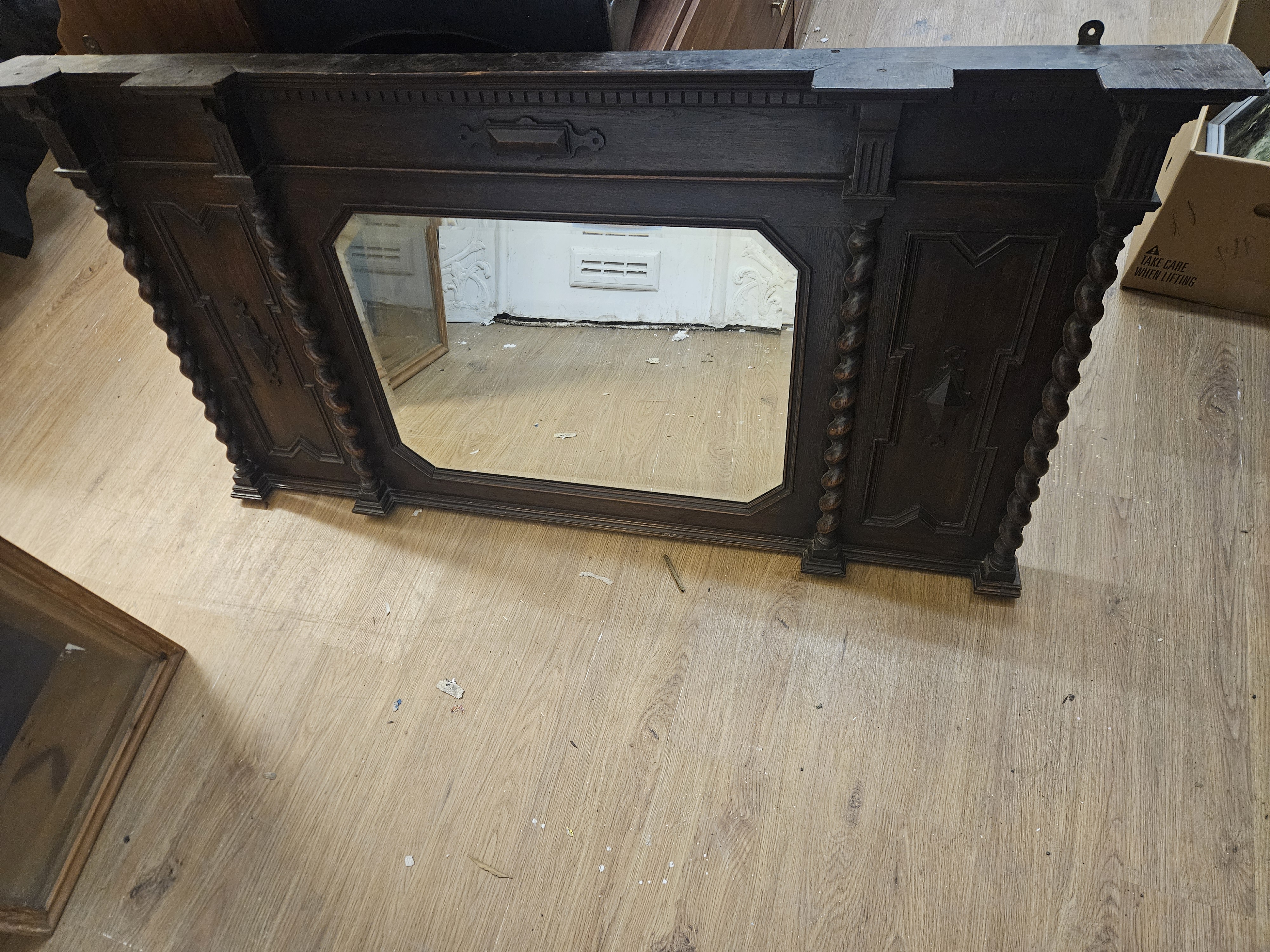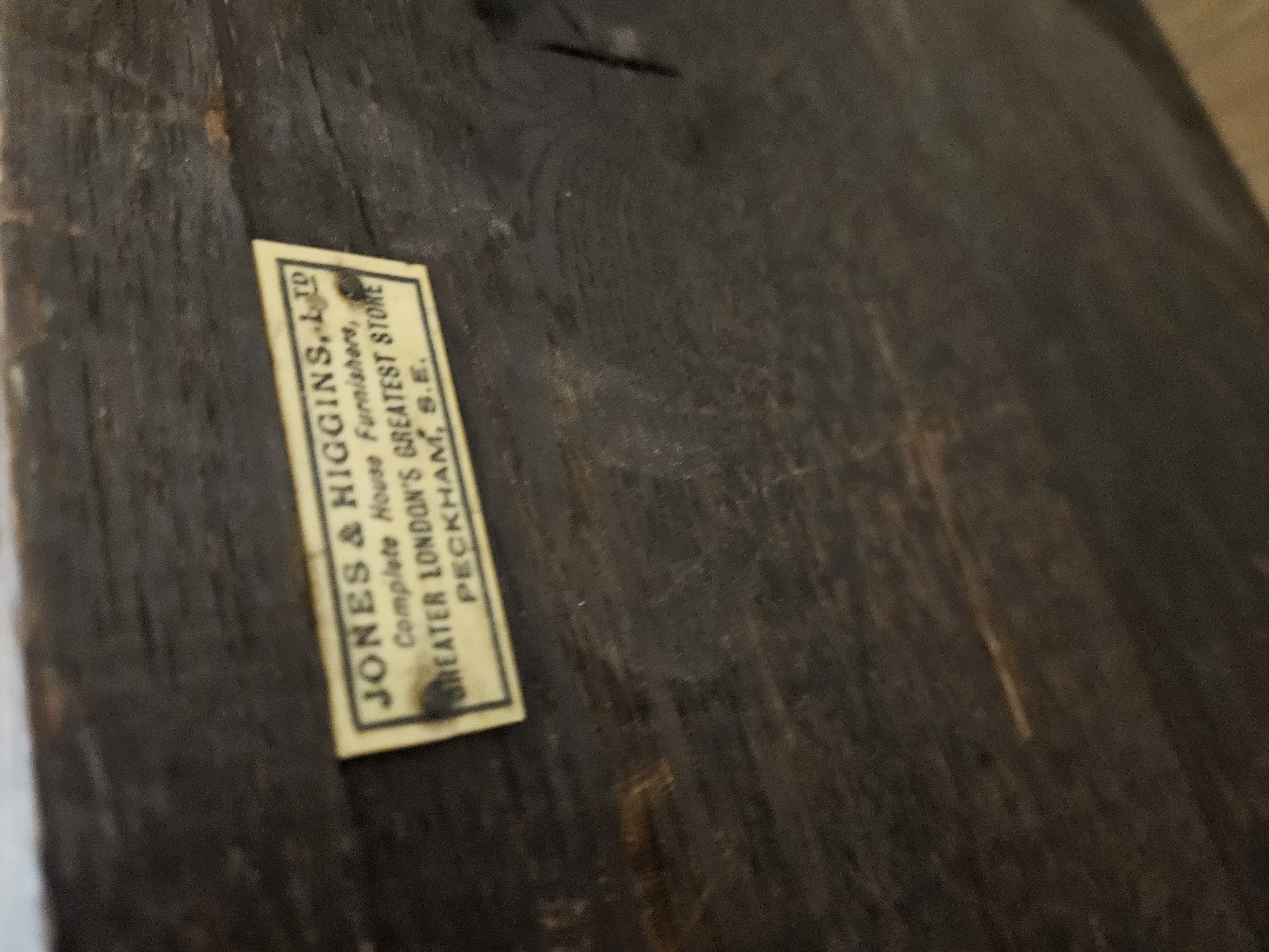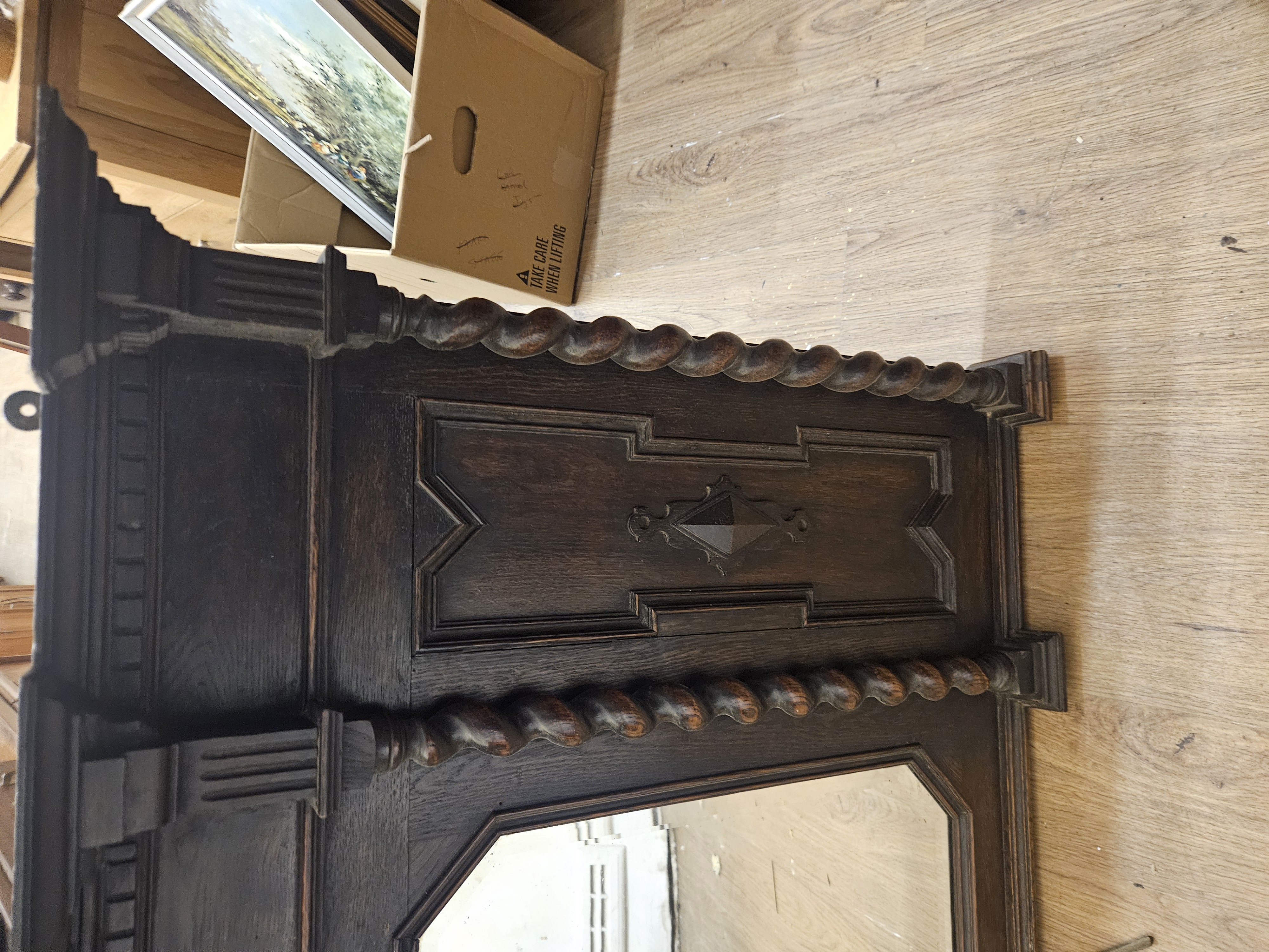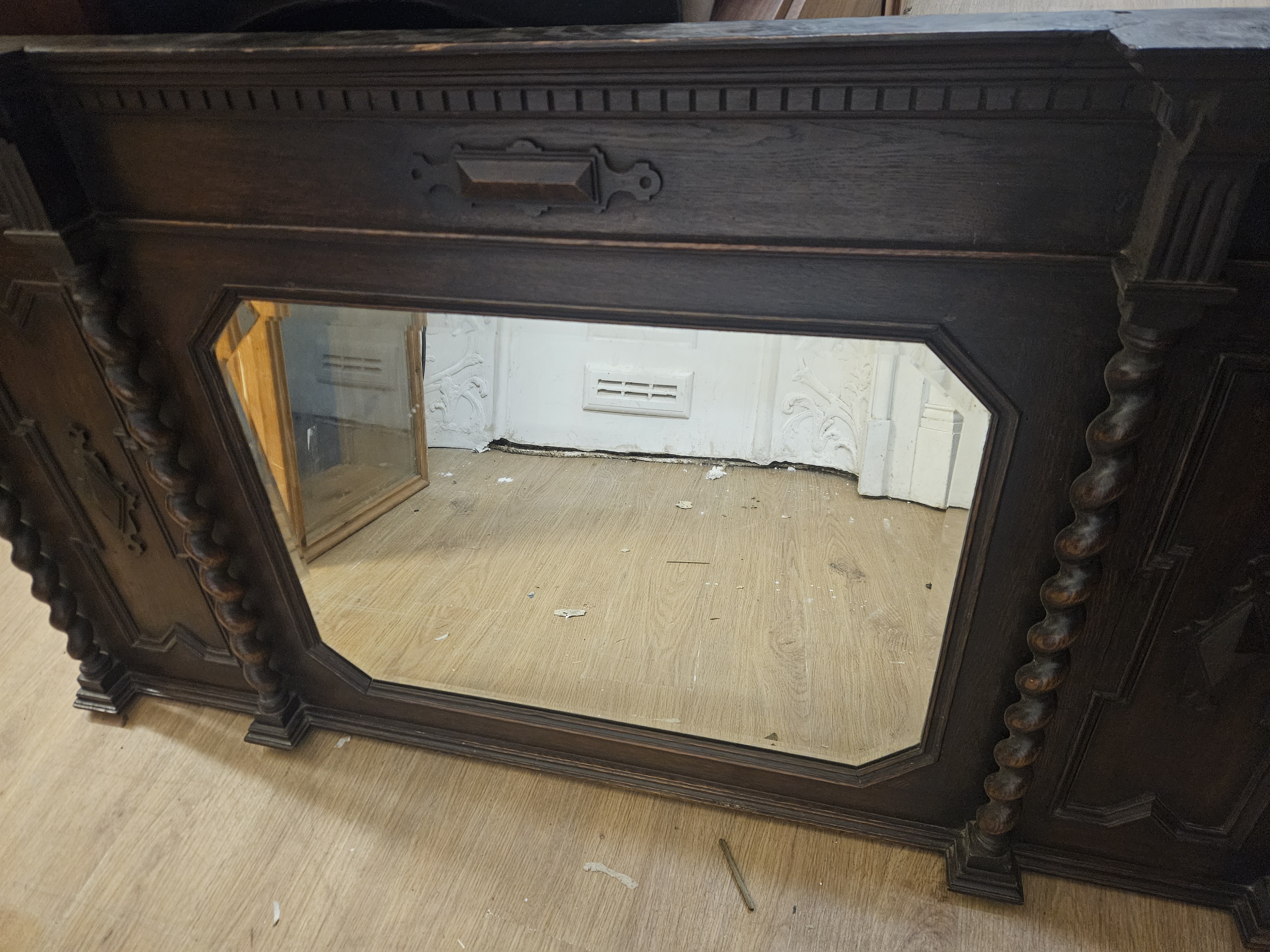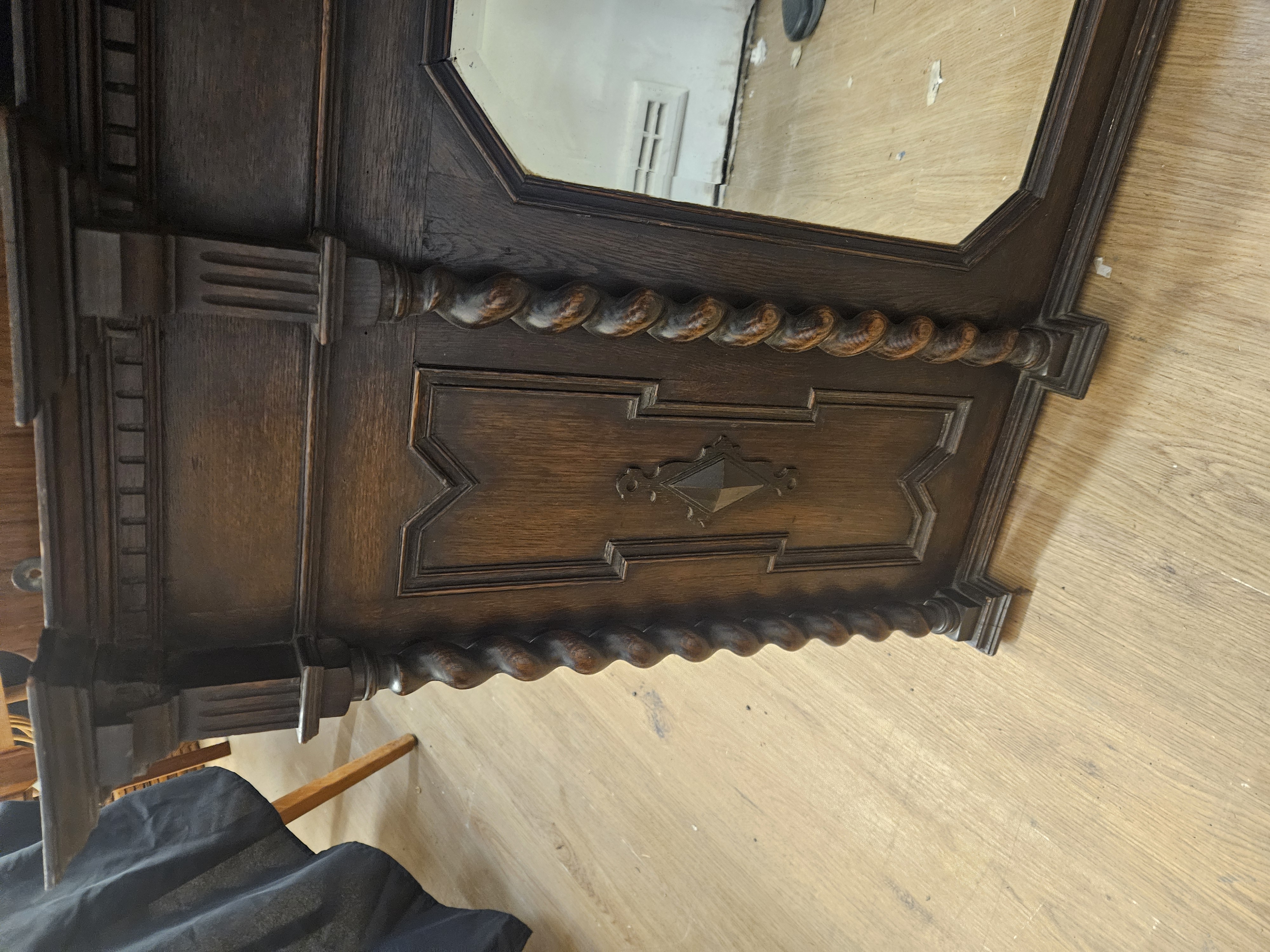 A large early 20th-century Jacobean Revival style overmantel or sideboard mirror constructed from dark-stained oak. The frame features a dentil-moulded cornice above a central frieze decorated with a raised rectangular boss. The structure is supported by two pairs of prominent barley-twist columns flanking the central mirror. The side panels are embellished with relief-carved geometric frames and central diamond motifs. The central mirror plate is octagonal in form. The reverse of the frame retains a printed paper retailer’s label for Jones and Higgins Ltd, Complete House Furnishers, Peckham, S.E. Metal mounting brackets are attached to the upper corners of the reverse.