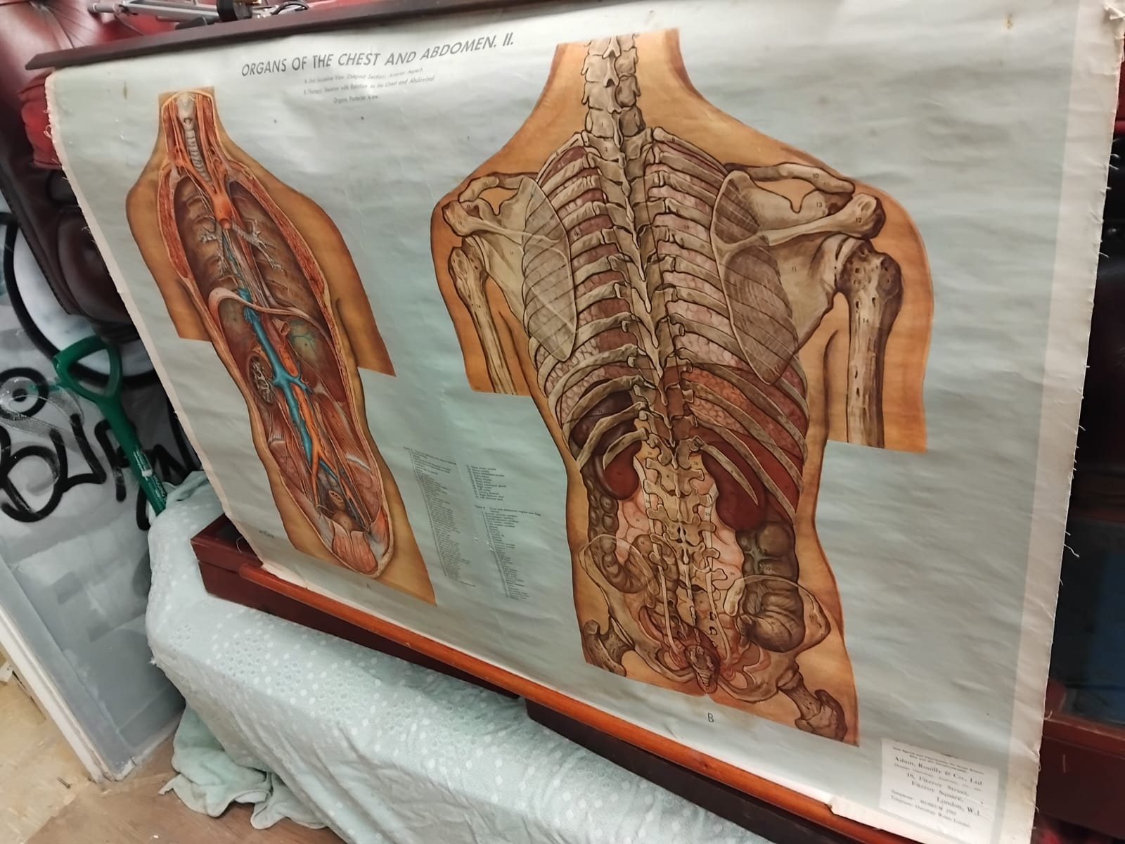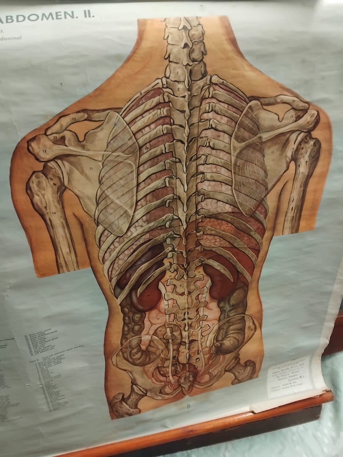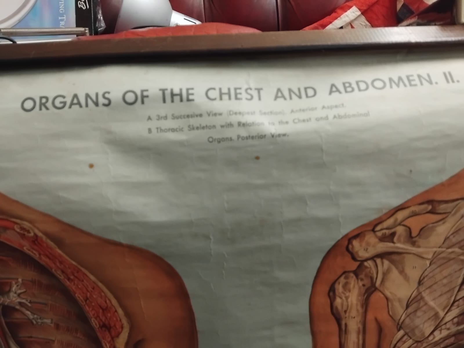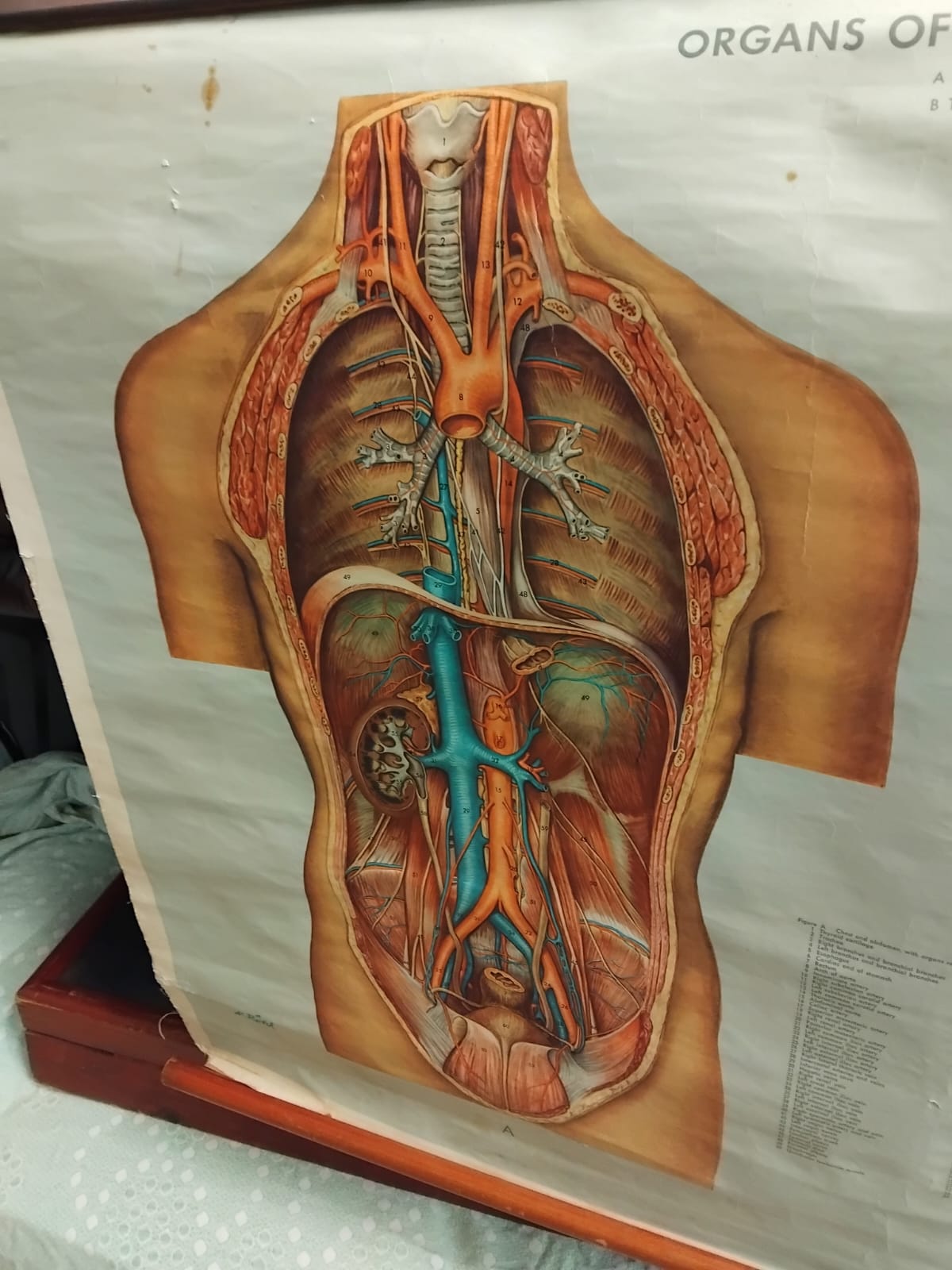 A large-scale professional medical instructional wall chart produced by Adam, Rouilly and Co Ltd. The chart is a colour lithograph backed with linen and mounted to a wooden roller at the bottom edge. Titled Organs of the Chest and Abdomen. II., the piece features two primary anatomical illustrations. Figure A depicts the 3rd Successive View (Deepest Section), Anterior Aspect, showing deep organs, major blood vessels including the aorta and vena cava, and the kidneys from a frontal perspective. Figure B depicts the Thoracic Skeleton with Relation to the Chest and Abdominal Organs, Posterior View, showing the ribcage, vertebral column, and scapulae with internal organs visible from the rear. Both illustrations include detailed, numbered keys for identification. A printed label in the bottom right corner identifies the manufacturer as Adam, Rouilly and Co. Ltd., 18, Fitzroy Street, Fitzroy Square, London, W.1., with the telephone exchange MUSEUM 2703 and telegram address Osteology Wesdo London.