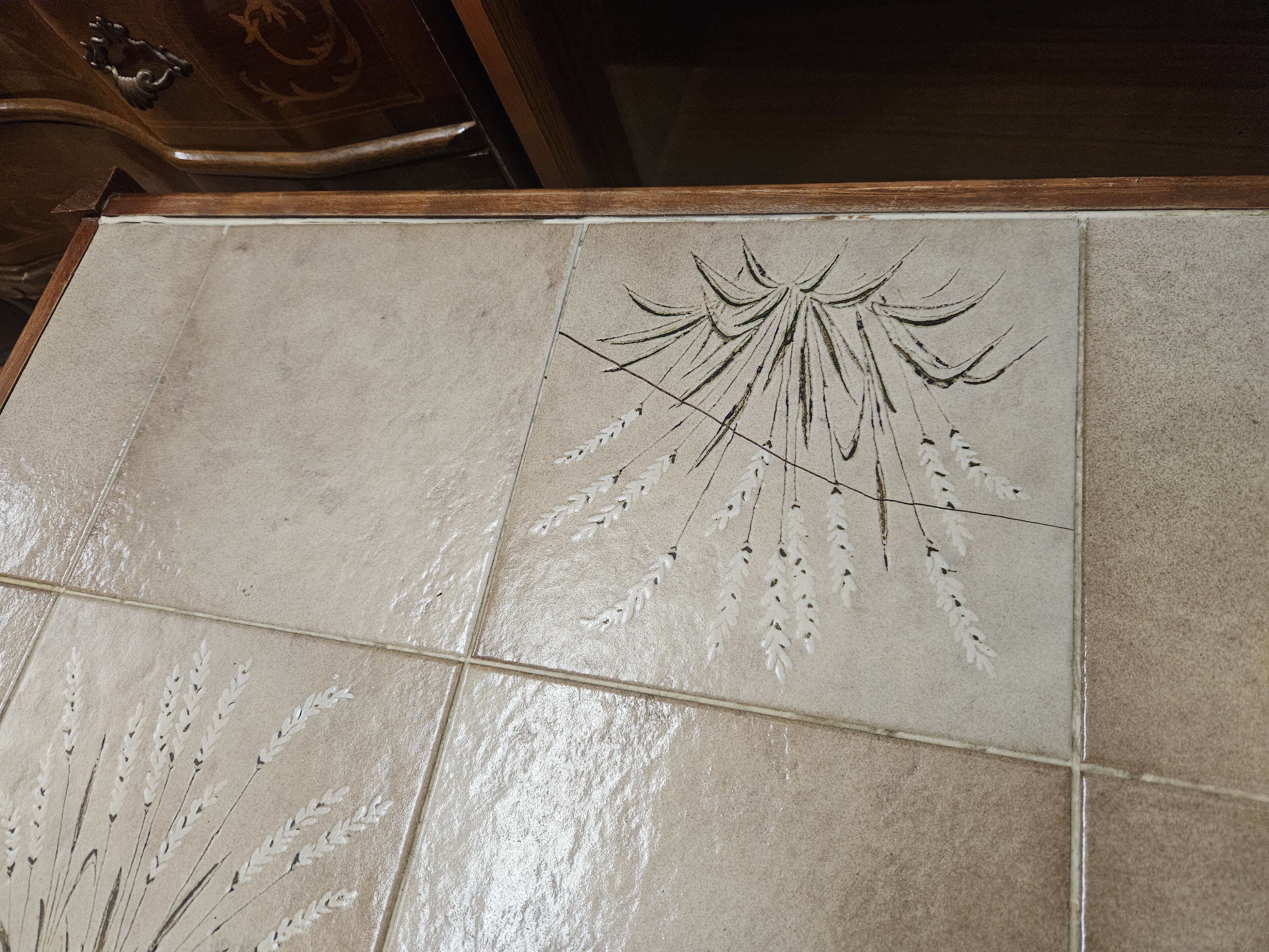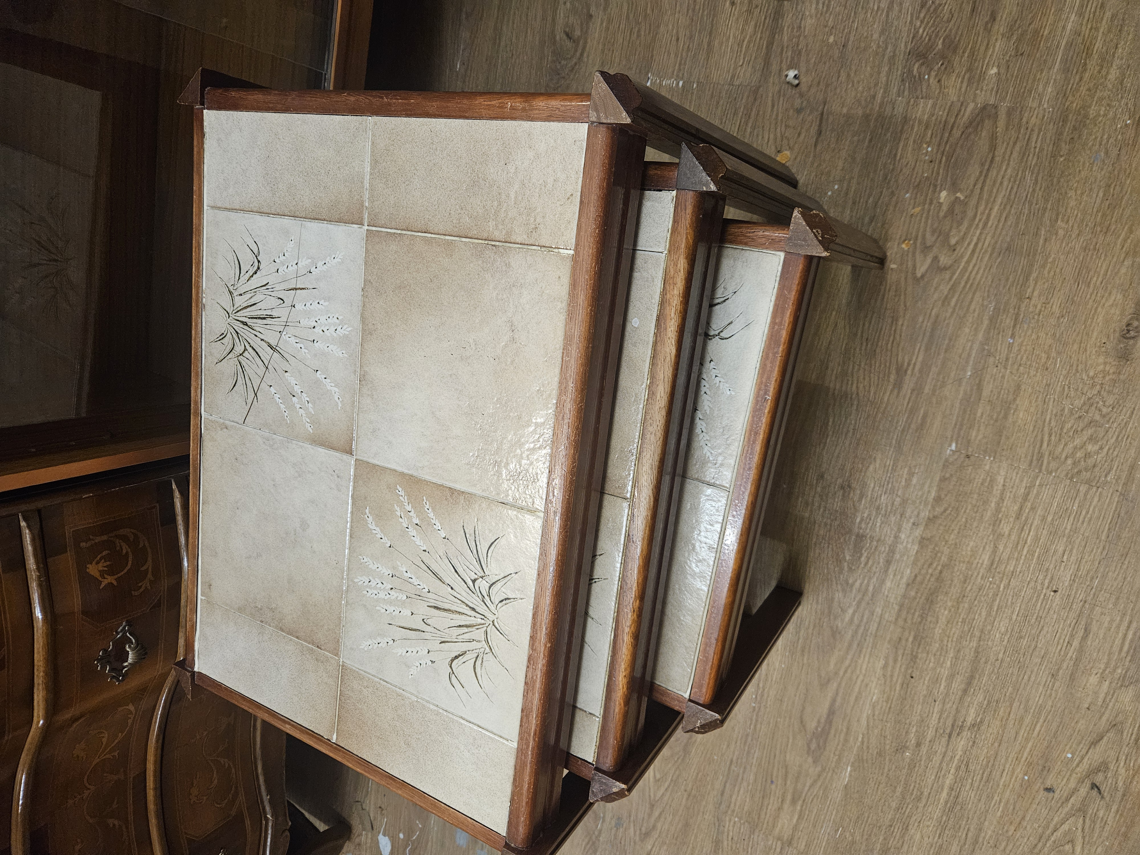 A trio of nesting side tables in the Mid-Century Modern style, dating to circa 1970. The frames are constructed from wood with a teak-coloured finish, featuring a graduated design that allows the smaller tables to slide beneath the larger ones. Each table top is inset with rectangular ceramic tiles in a neutral palette of beige and cream. The tiles are decorated with a stylised botanical motif depicting wheat or grass stalks in dark brown and white glazes. The construction features simple, straight-lined wooden frames characteristic of the period’s functional aesthetic. No maker’s marks or labels are present.