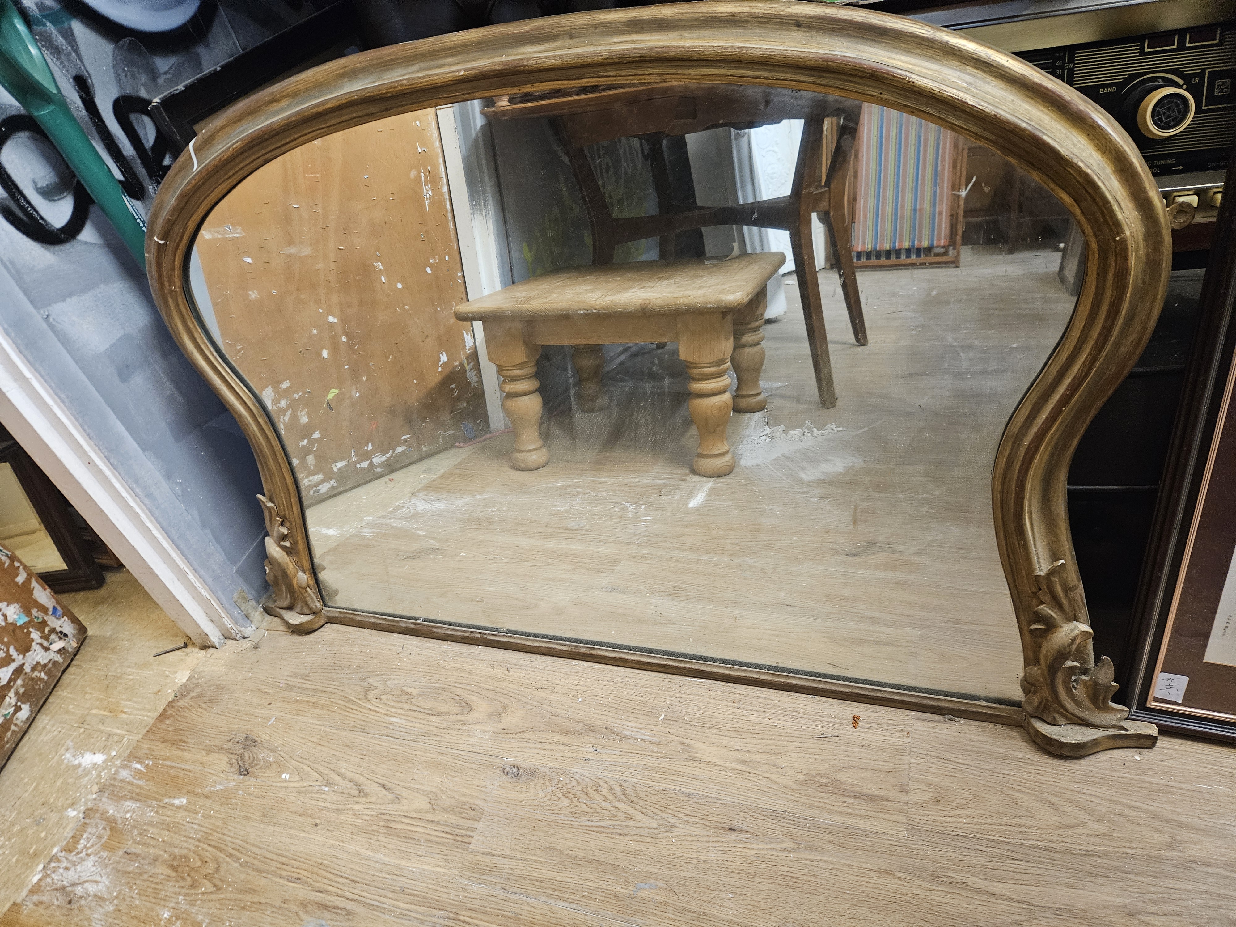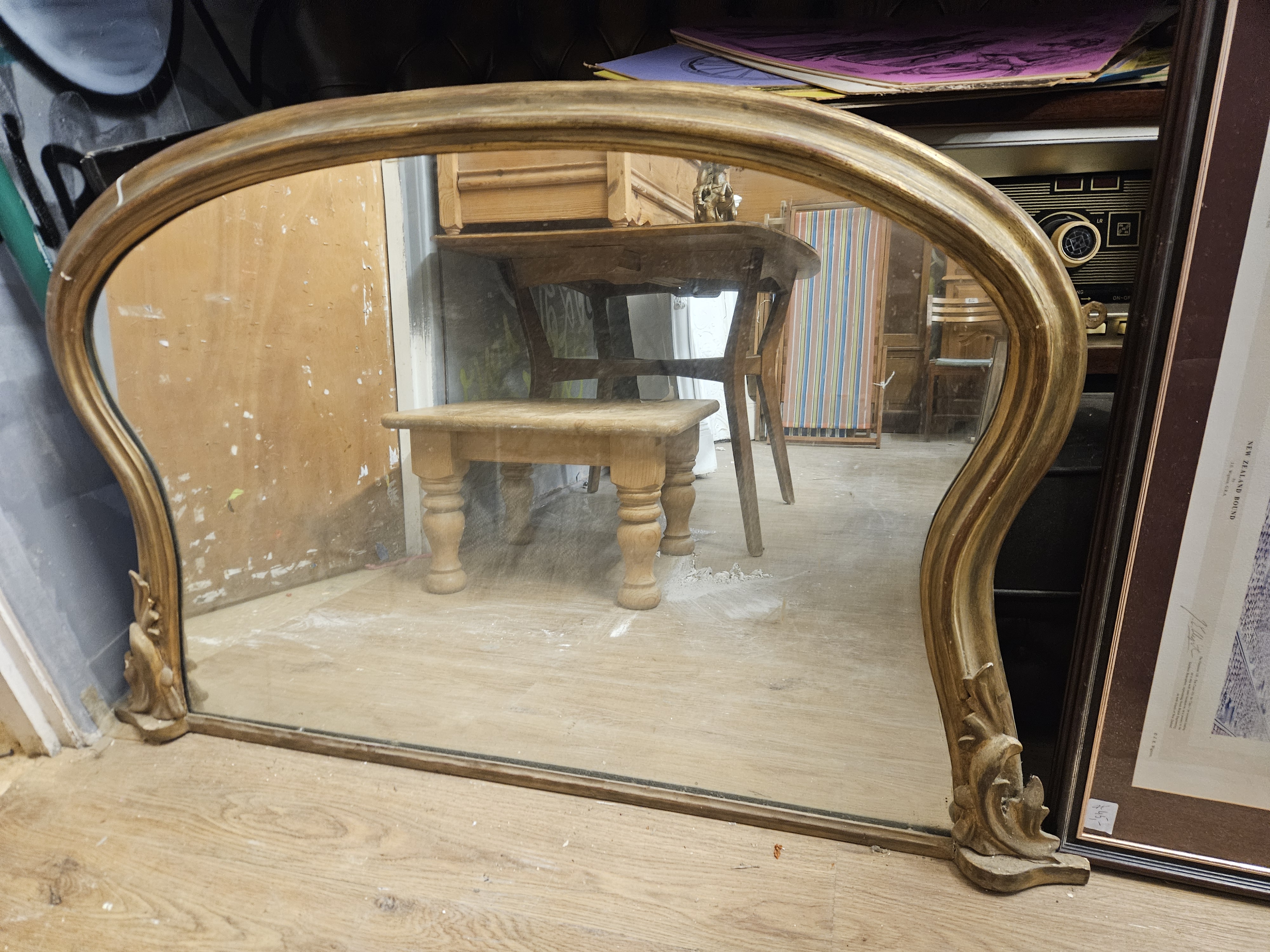 A late 19th to early 20th-century overmantel mirror in the Victorian style. The frame is constructed of gilt gesso over wood, featuring a serpentine arched top with rounded mouldings. The base of the frame is accented by two decorative scrolling acanthus leaf terminals at the bottom corners. The finish consists of a matte gilding with an aged patina. The mirror plate is shaped to fit the specific contours of the frame. No maker marks, labels, or inscriptions are present on the frame or the reverse.