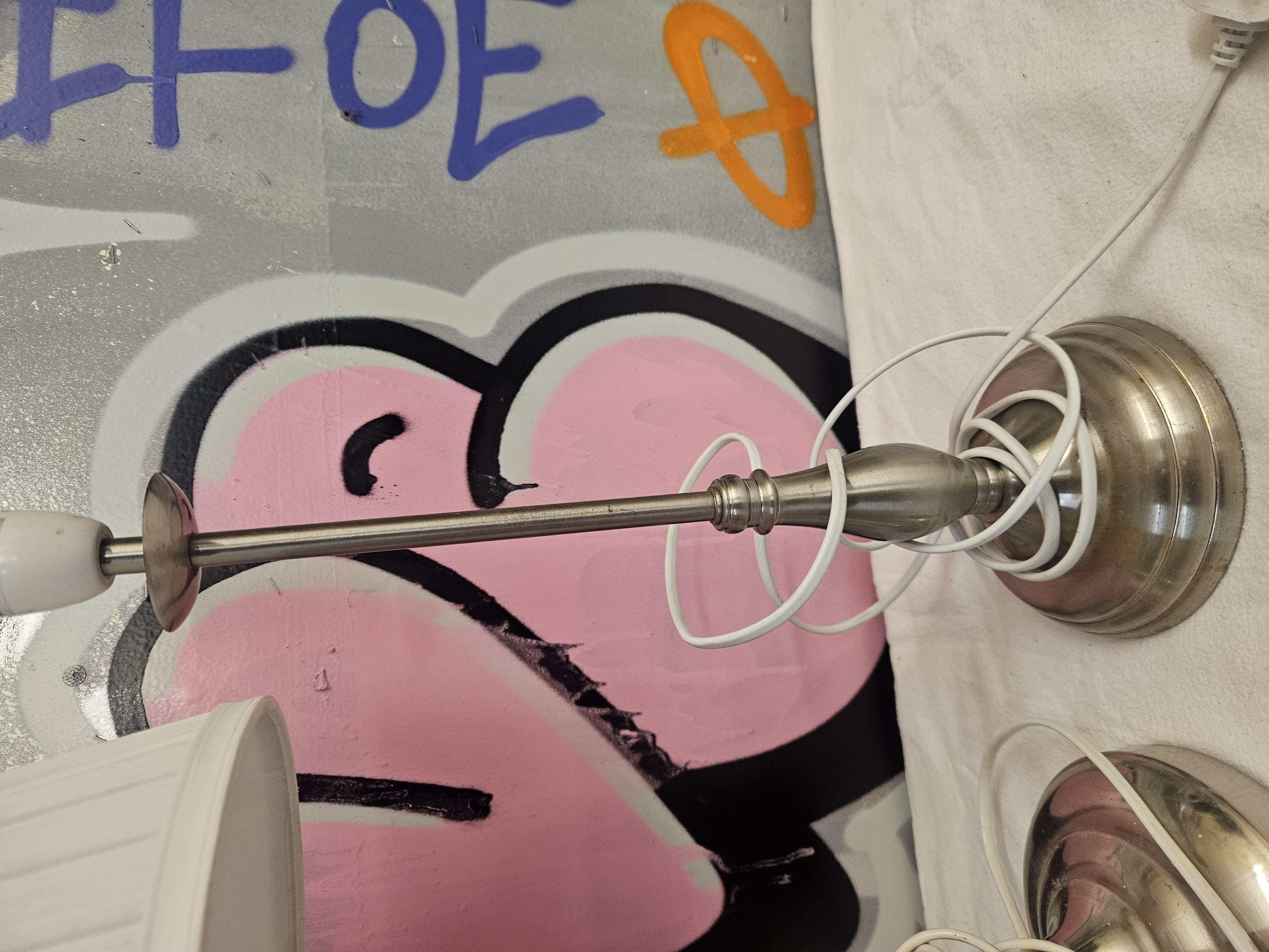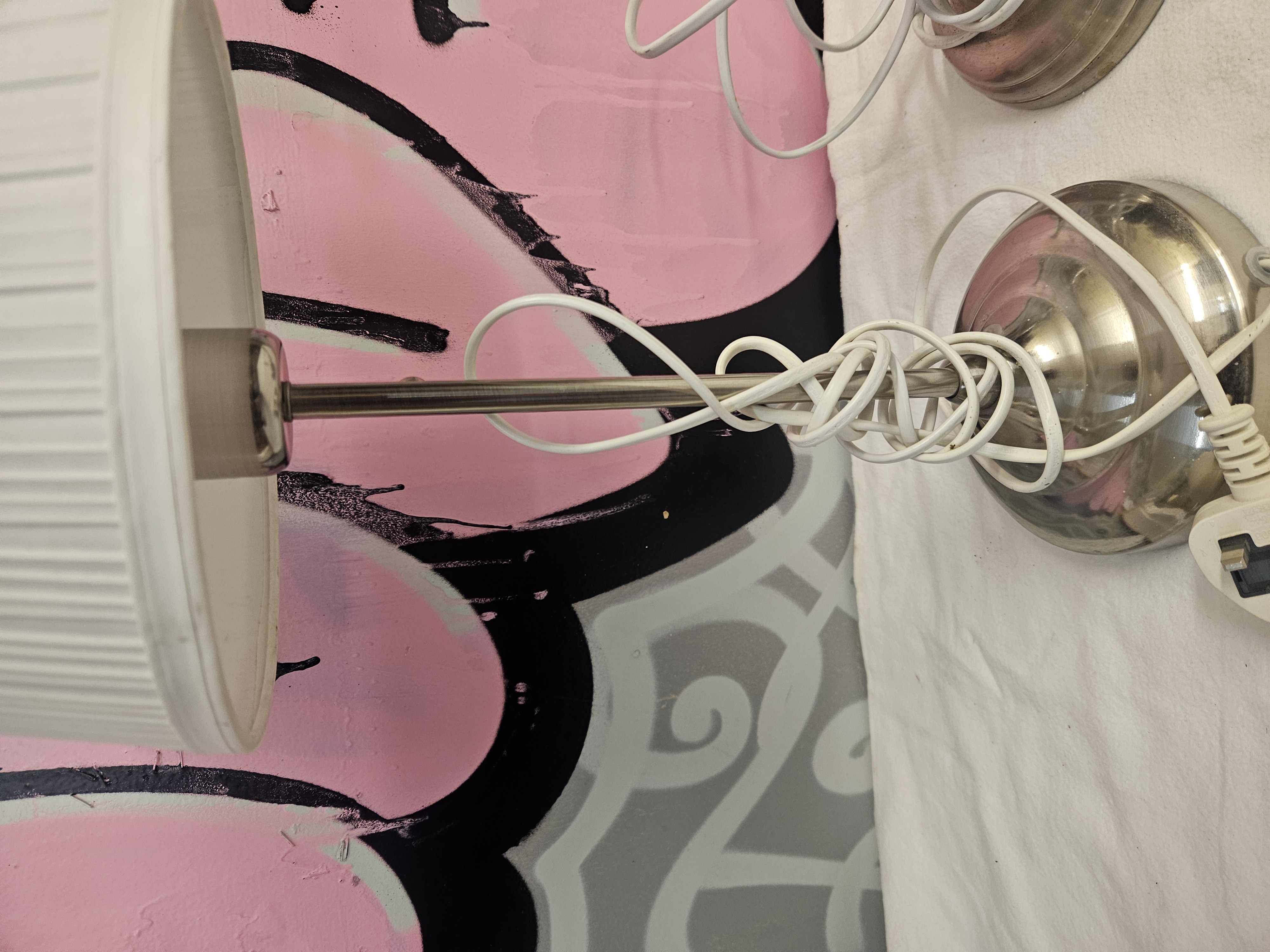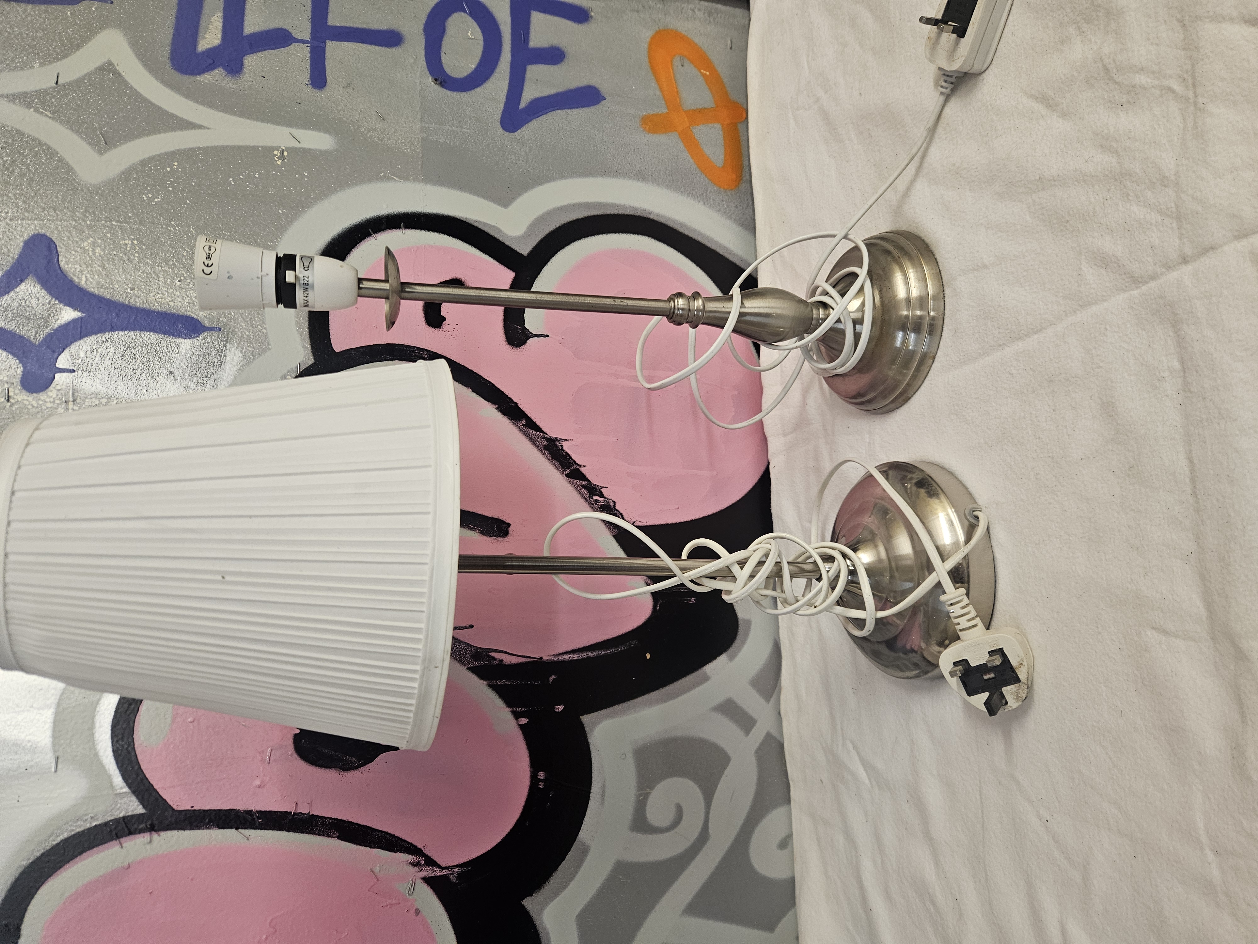 A pair of modern table lamps attributed to the IKEA ARSTID range. Each lamp is constructed with a nickel-plated metal body featuring a slender, tubular stem set upon a stepped, circular weighted base. One lamp retains a white, pleated, tapered synthetic shade. The lamp holders are designed for B22 bayonet bulbs and bear technical markings including the CE mark and a maximum wattage rating of 42W. Both units are equipped with white power cables and standard United Kingdom three-pin plugs.