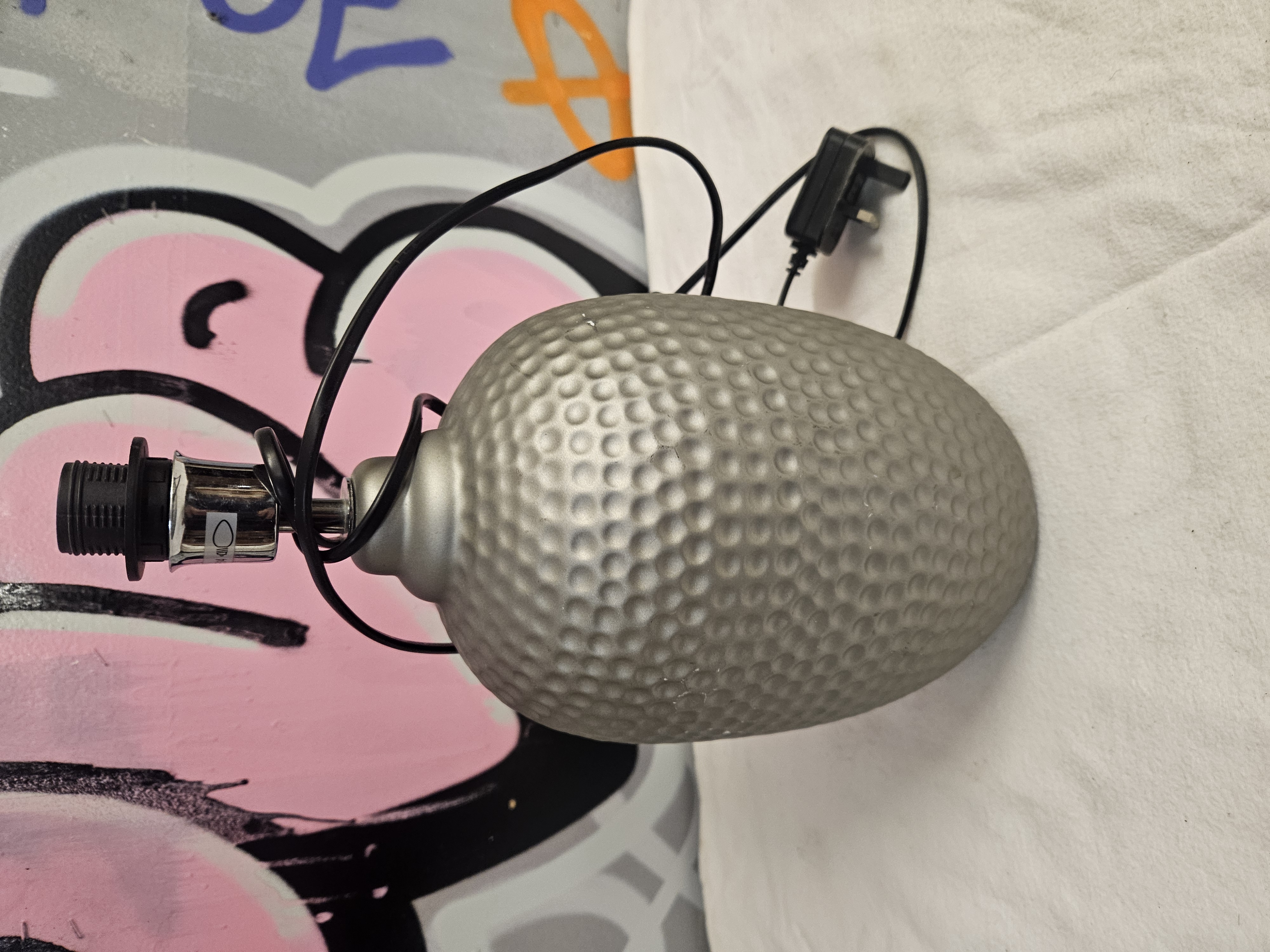 A contemporary table lamp base of ovoid form featuring a repetitive dimpled or hammered texture across the body. The item is finished in a matt silver or pewter-tone effect over a cast body. It is fitted with a black plastic threaded lamp holder for an E27 screw-fit bulb, supported by a chrome-plated metal collar. The lamp is equipped with a modern black power cable and a standard UK three-pin plug. No maker marks or signatures are present, although a small generic safety sticker with a bulb icon is attached to the lamp holder.