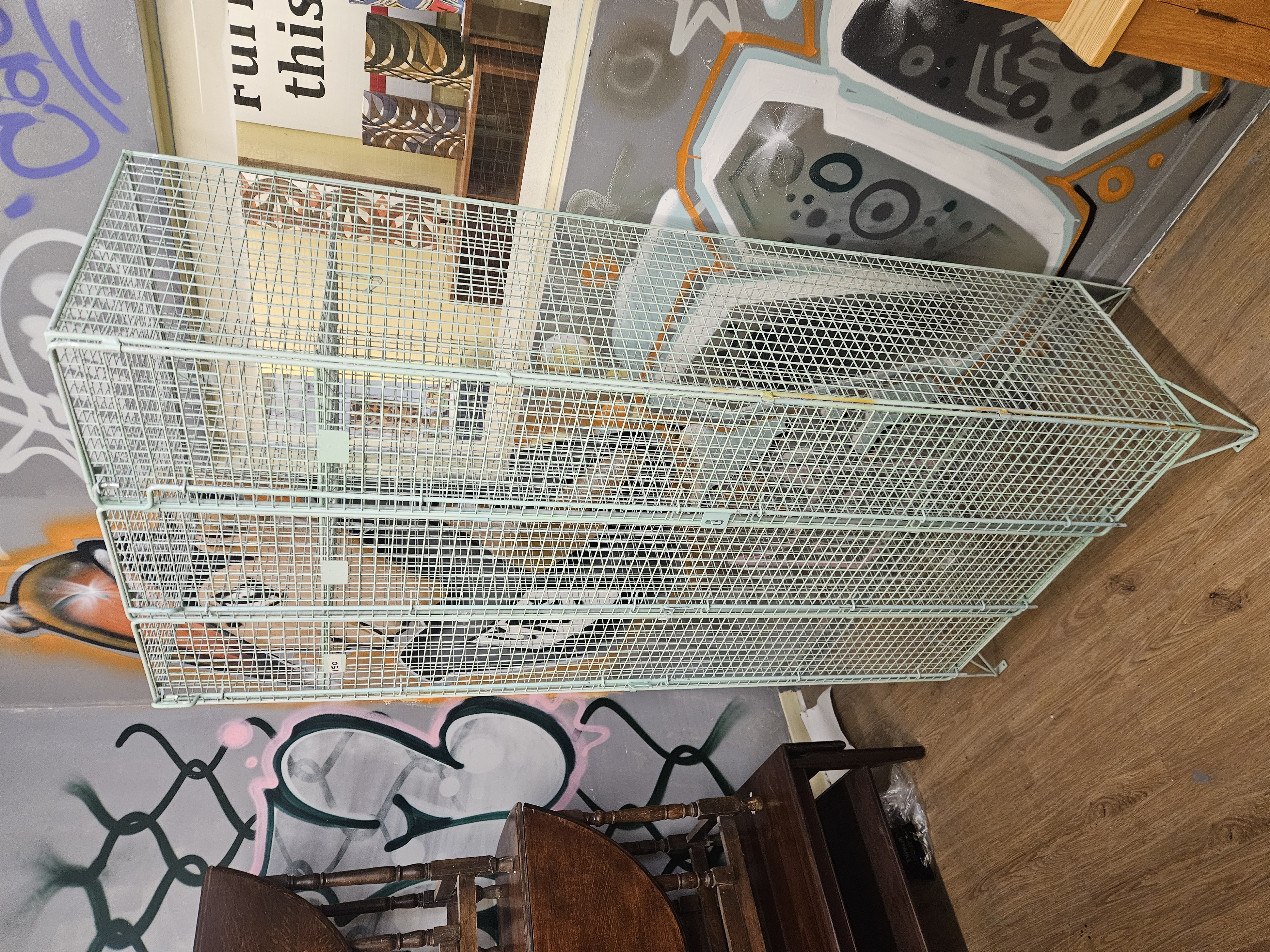 A bank of three industrial style wire mesh lockers