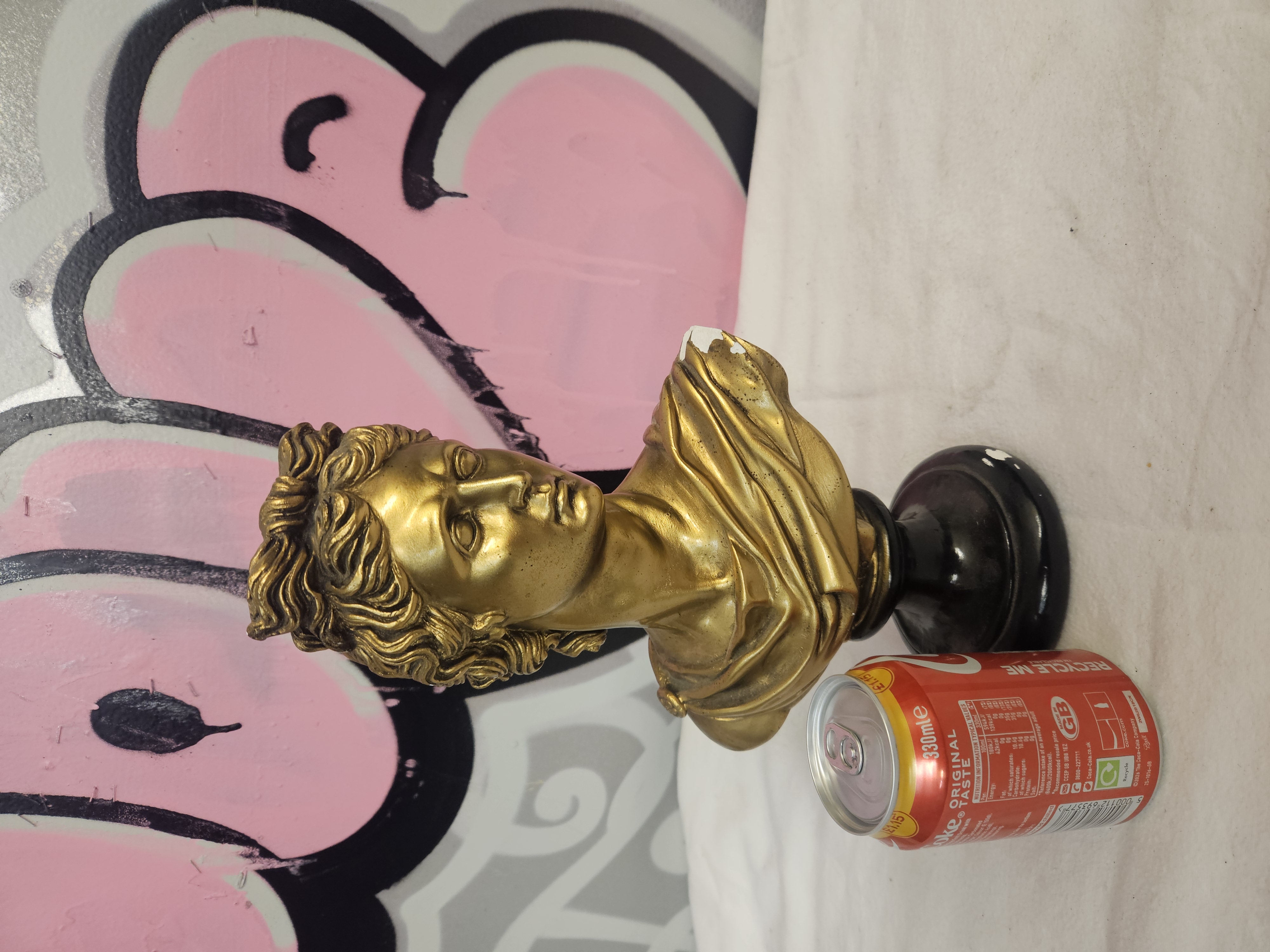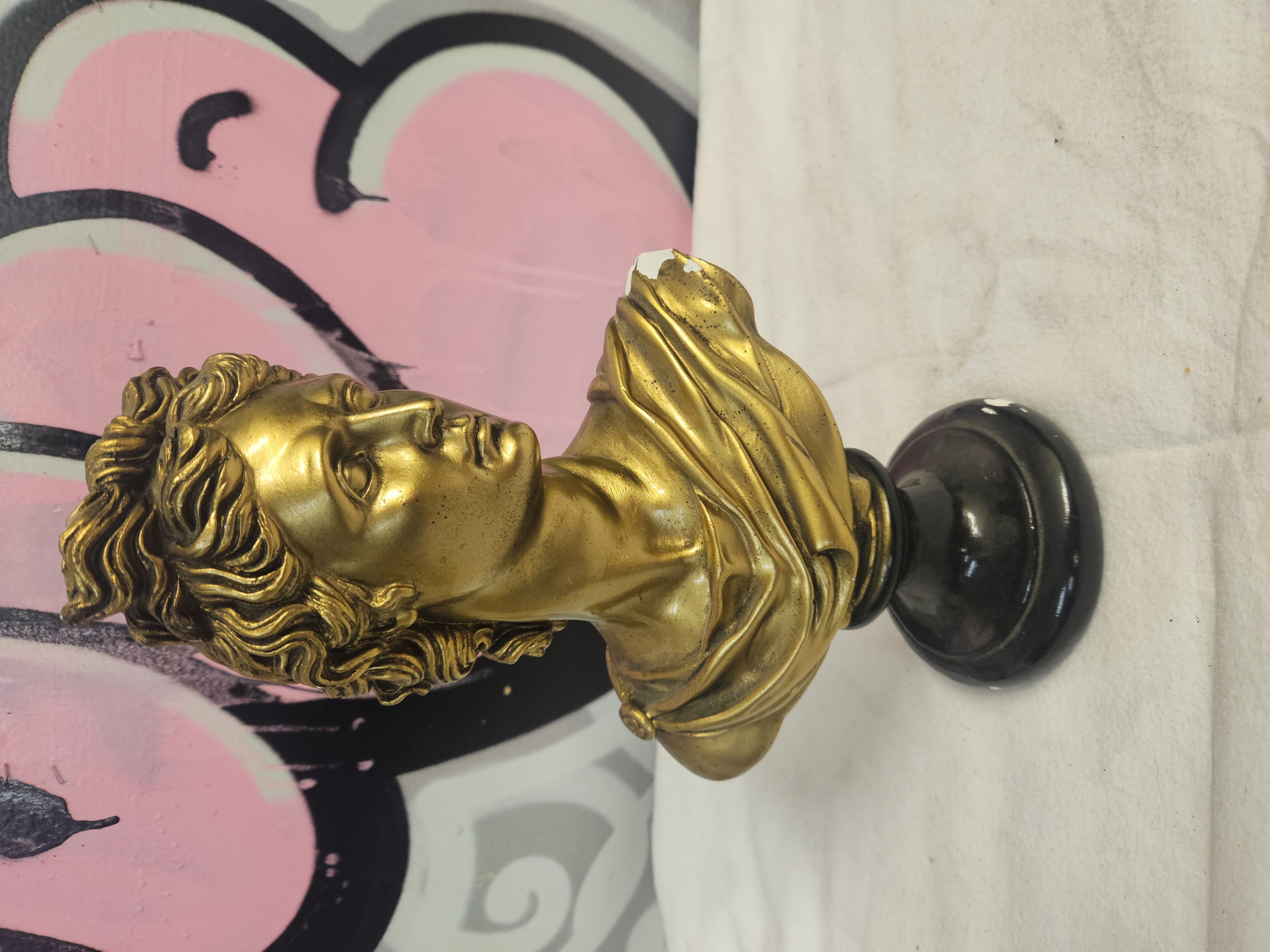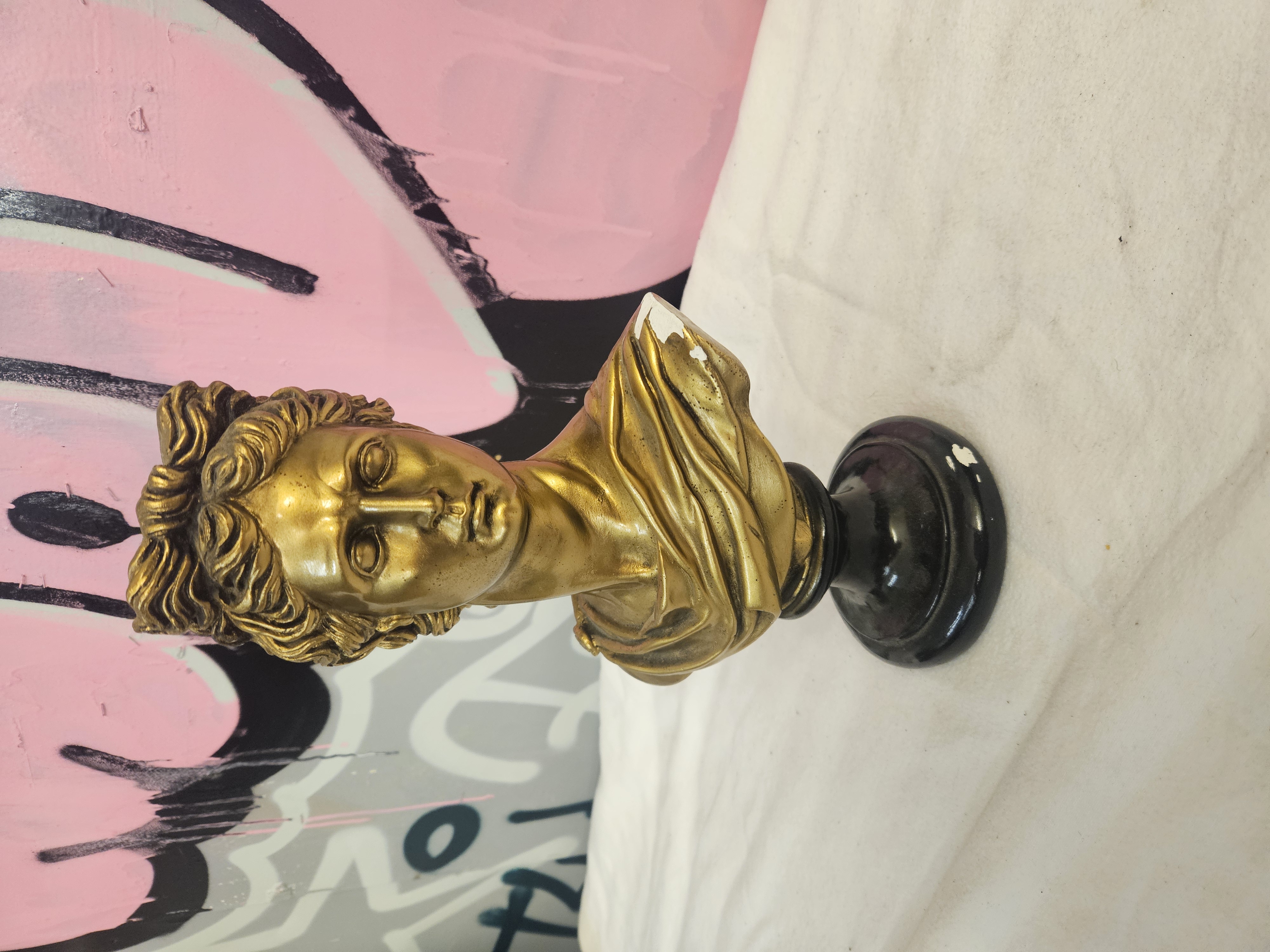 A decorative bust modelled after the classical Apollo Belvedere, presented in a Neoclassical style. The piece is constructed from cast resin or plaster with a gilt-coloured surface finish. The figure is depicted with characteristic wavy hair and a draped garment over one shoulder, mounted upon an integral black-finished turned socle. There are no visible signatures, maker’s marks, or foundry stamps.