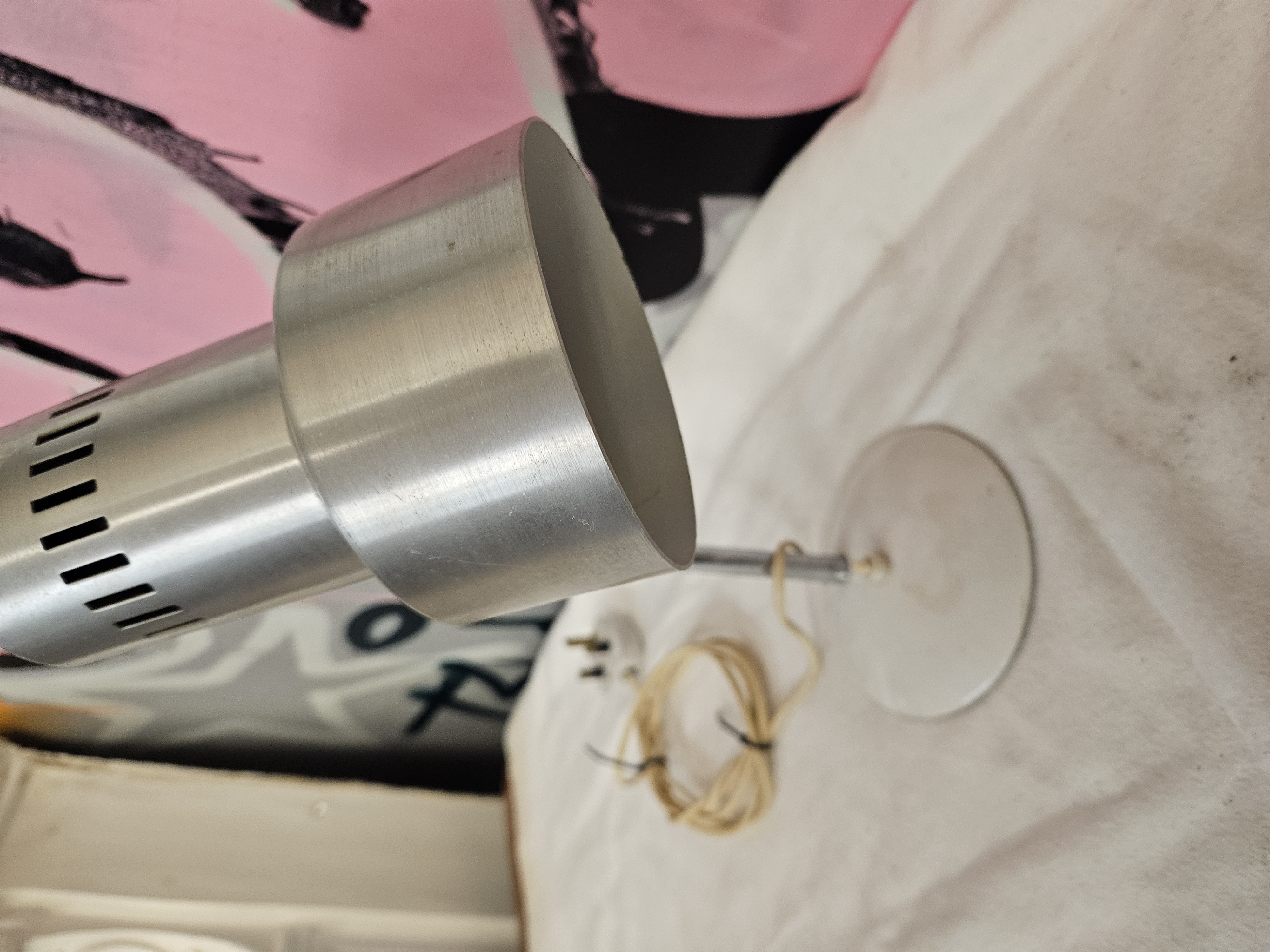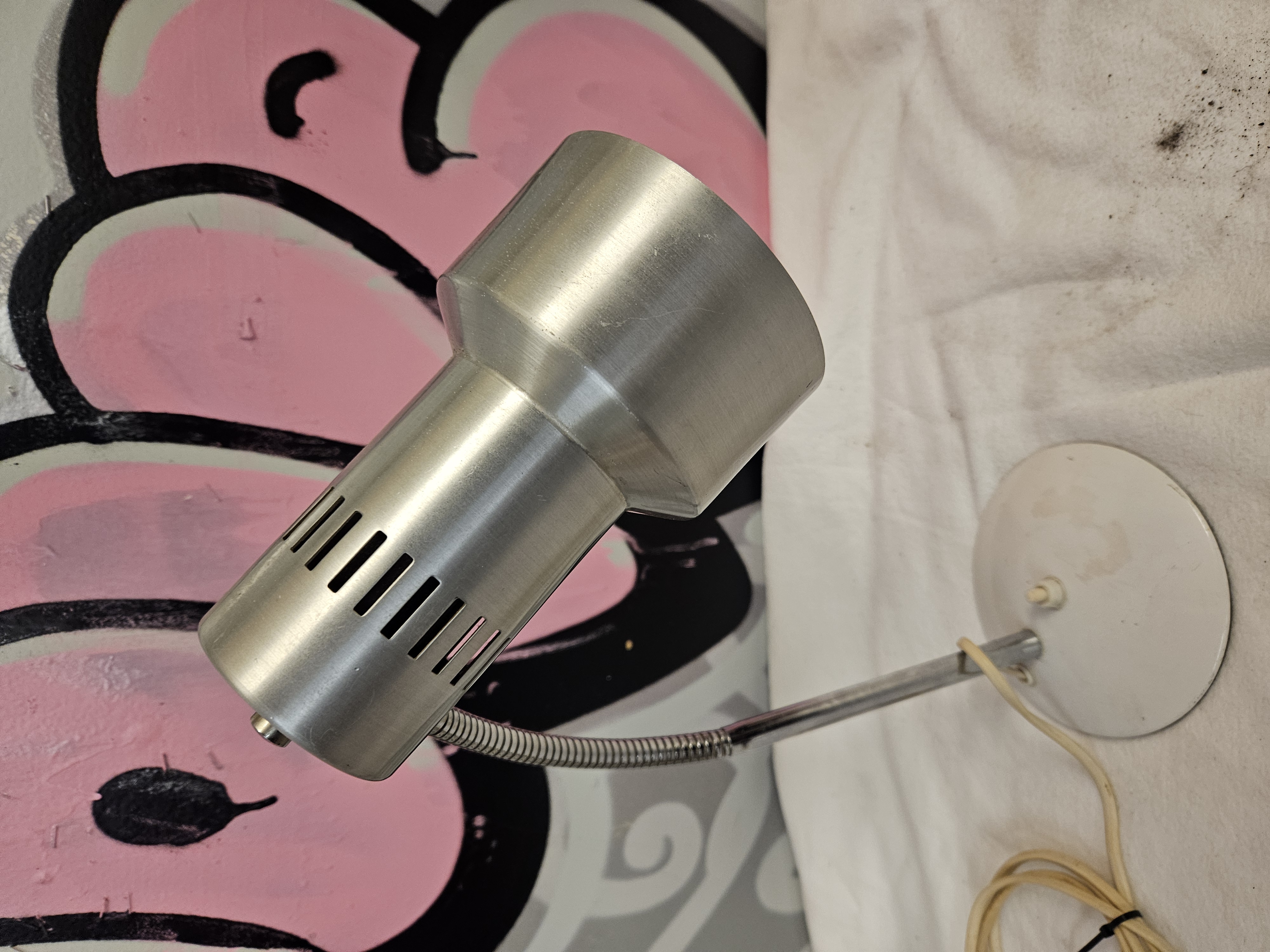 A Mid-Century Modern style gooseneck table or desk lamp of unattributed manufacture. The lamp comprises a stepped cylindrical spotlight shade in brushed aluminium, featuring parallel horizontal cooling vents at the rear. The shade is attached to a flexible chrome-plated gooseneck and fixed stem, which is mounted to a circular white-painted metal base. A white plastic push-button power switch is integrated into the base. The lamp is fitted with a cream-coloured flexible cable and a standard UK three-pin plug. No maker’s marks, characters, or labels are visible on the exterior of the shade or base. The design is characteristic of 1960s and 1970s lighting by manufacturers such as Maclamp or Prova.