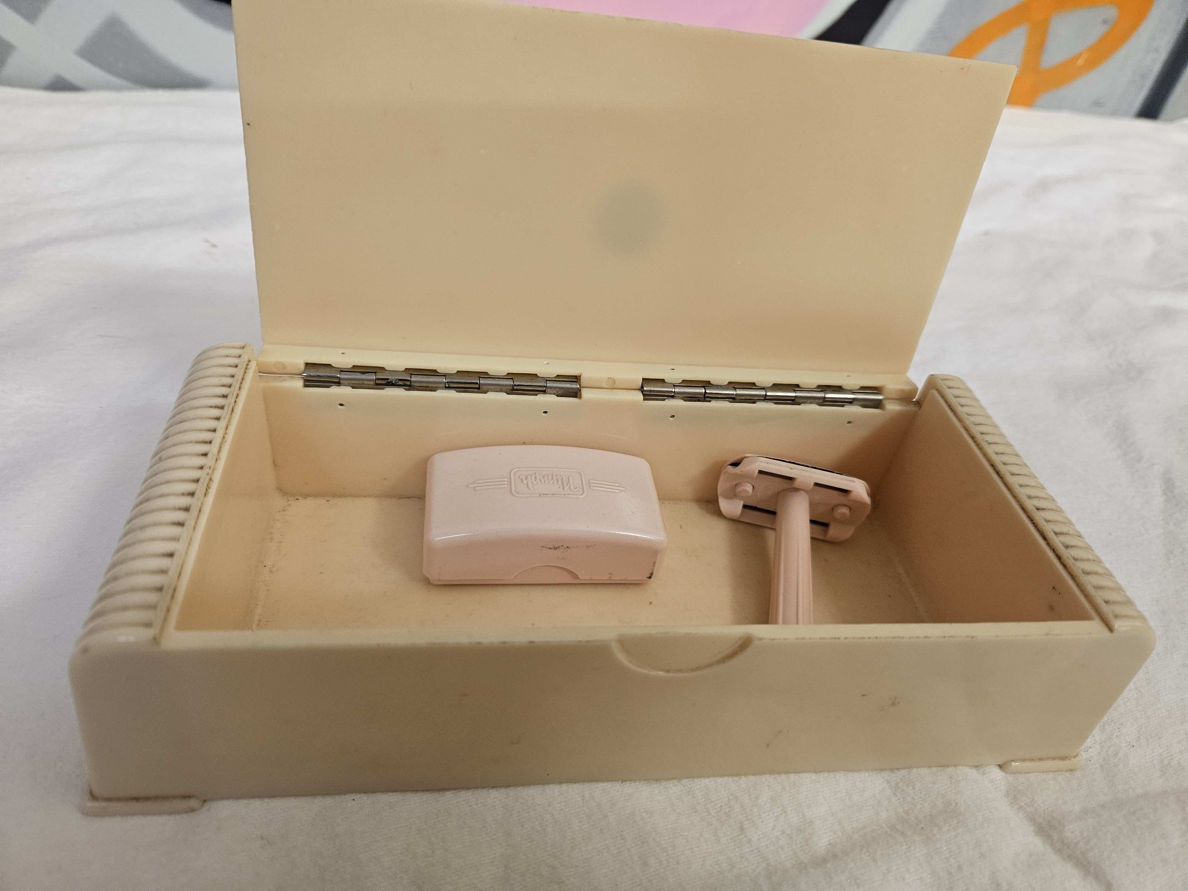 A vintage ladies travel shaving set manufactured by Souplex Ltd of Morecambe, Lancashire. The set is housed in an off-white or cream moulded plastic case featuring Art Deco style ribbed waterfall ends and a metal piano hinge. The interior contains a matching two-piece safety razor in pink moulded plastic and a pink rectangular blade storage container. The lid of the internal pink box features a recessed rectangular area containing the brand name Nymph in stylised script.