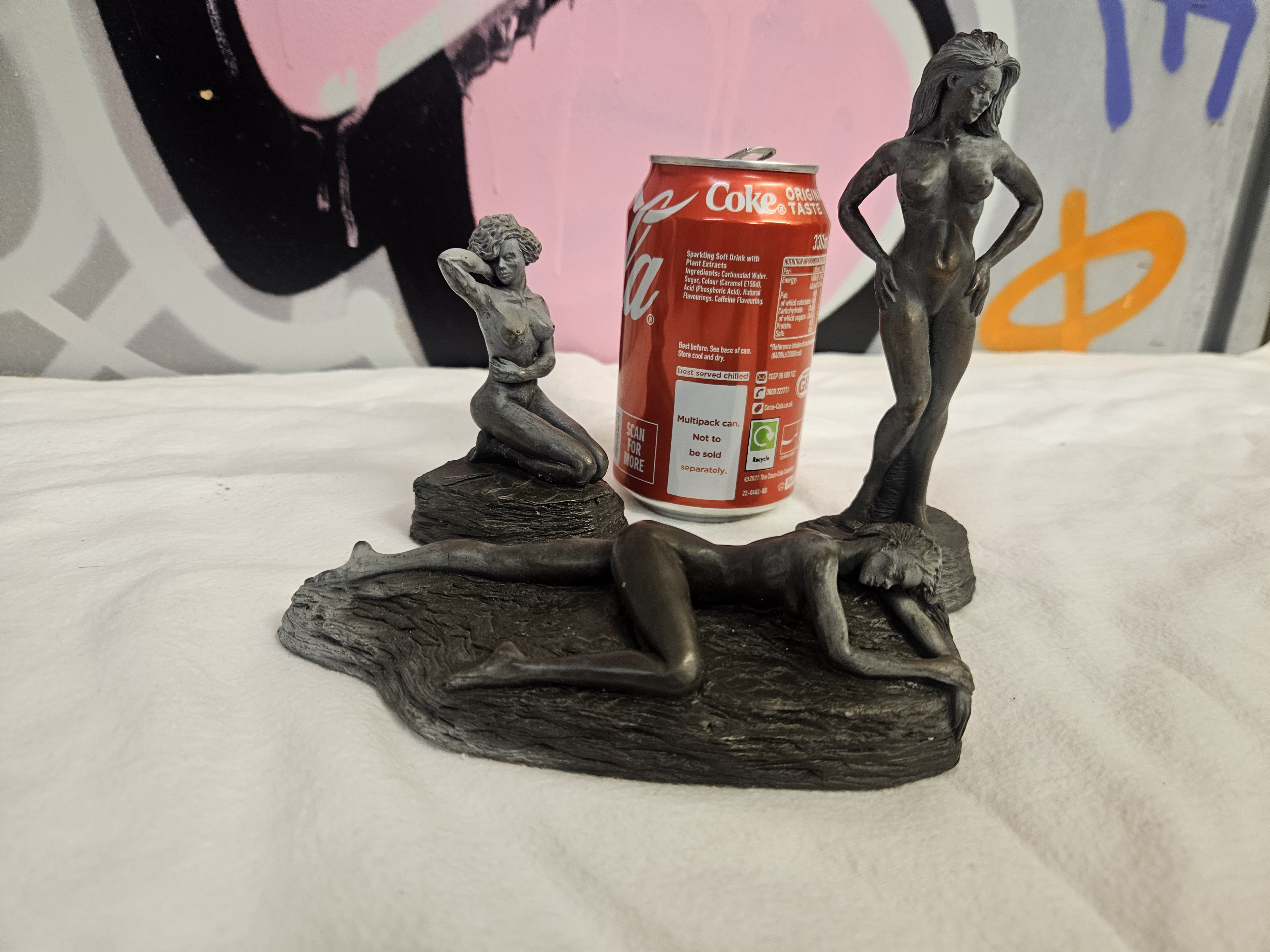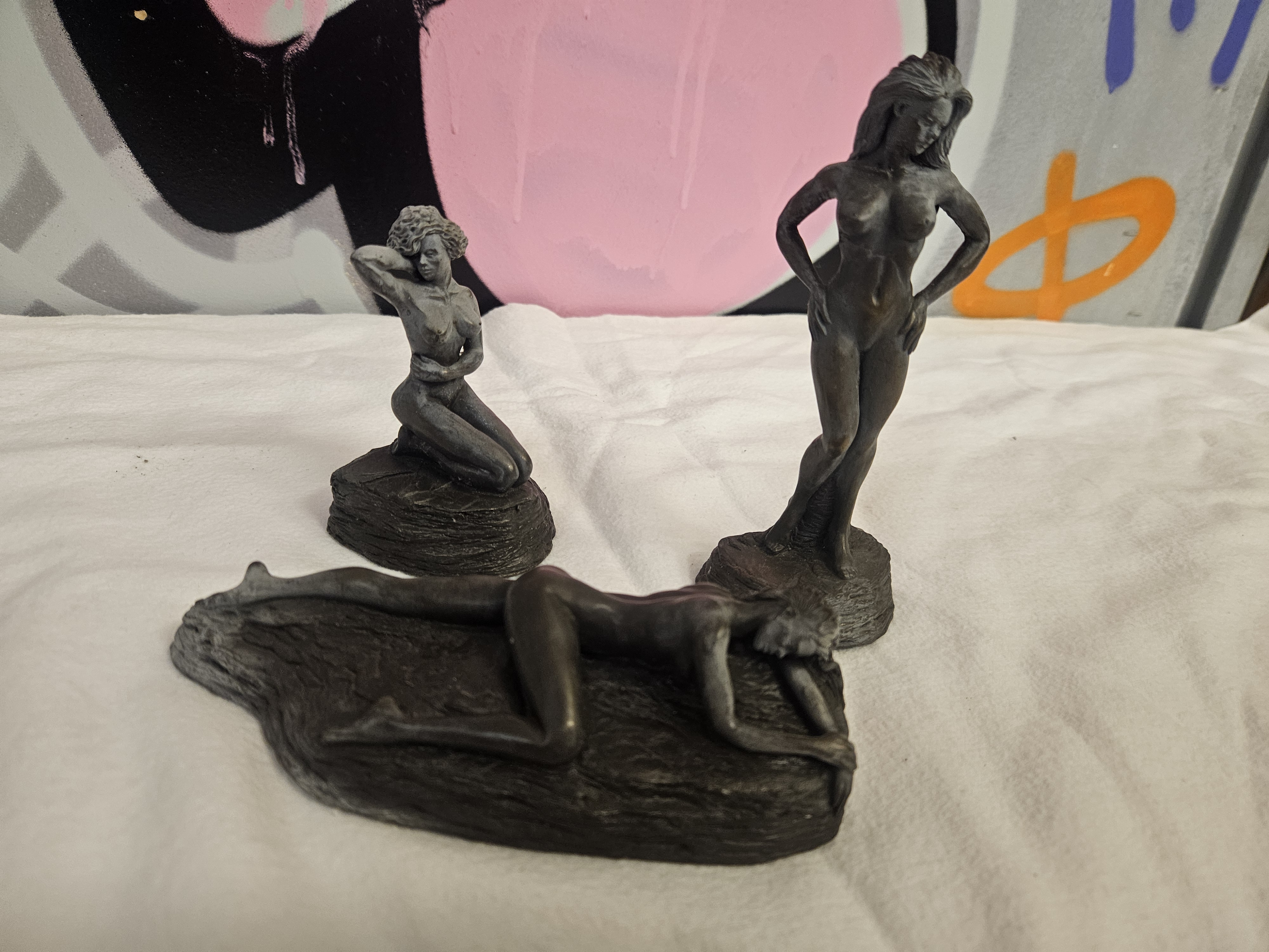 A trio of contemporary figurative sculptures depicting the female nude in three distinct poses. The group consists of one figure standing with hands positioned on the hips, a second figure kneeling with one arm raised behind the head, and a third figure in a reclining prone position. Each sculpture is cast in resin with a dark, cold-cast bronze-effect finish. The figures are integrated into bases with a rough, rock-like texture of the same material and finish. No signatures, foundry marks, or edition numbers are visible on the works.