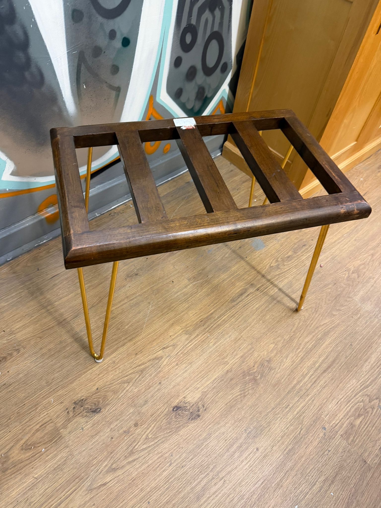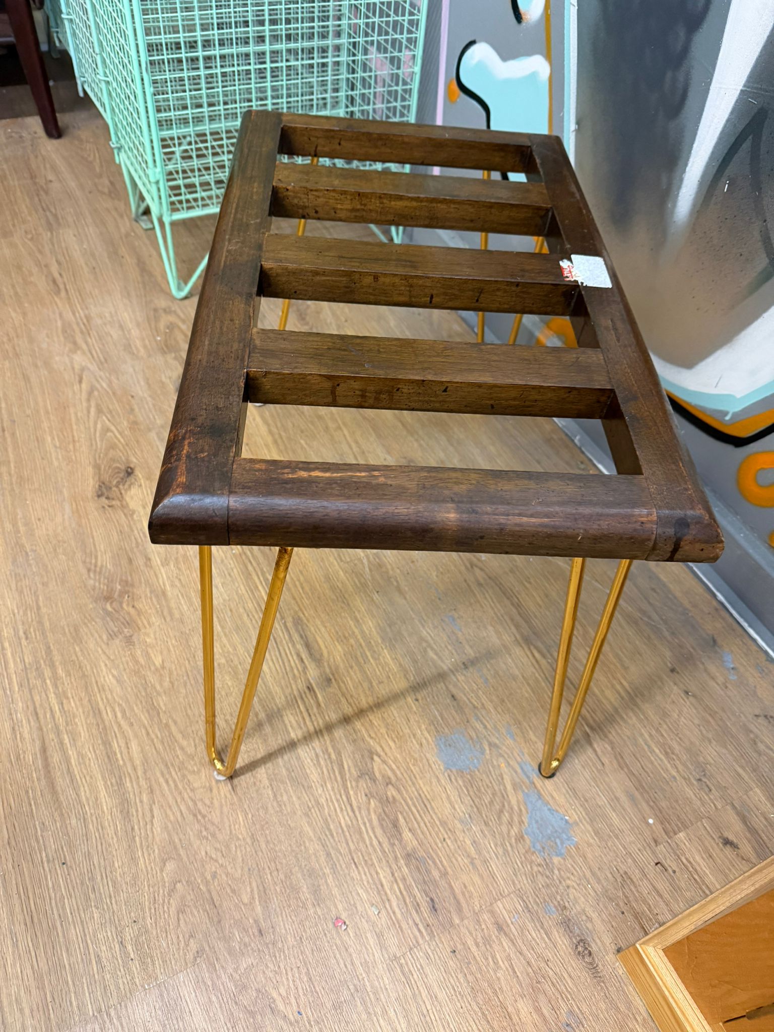 A contemporary side table or plant stand featuring a repurposed dark-stained hardwood top. The rectangular top is constructed with horizontal slats set within a chamfered outer frame. The piece is supported by four modern gold-toned metal hairpin legs. The construction suggests an upcycled design, combining a vintage-style slatted surface with contemporary industrial-style supports. No maker’s marks are present; a modern adhesive inventory sticker is located on one of the top slats.