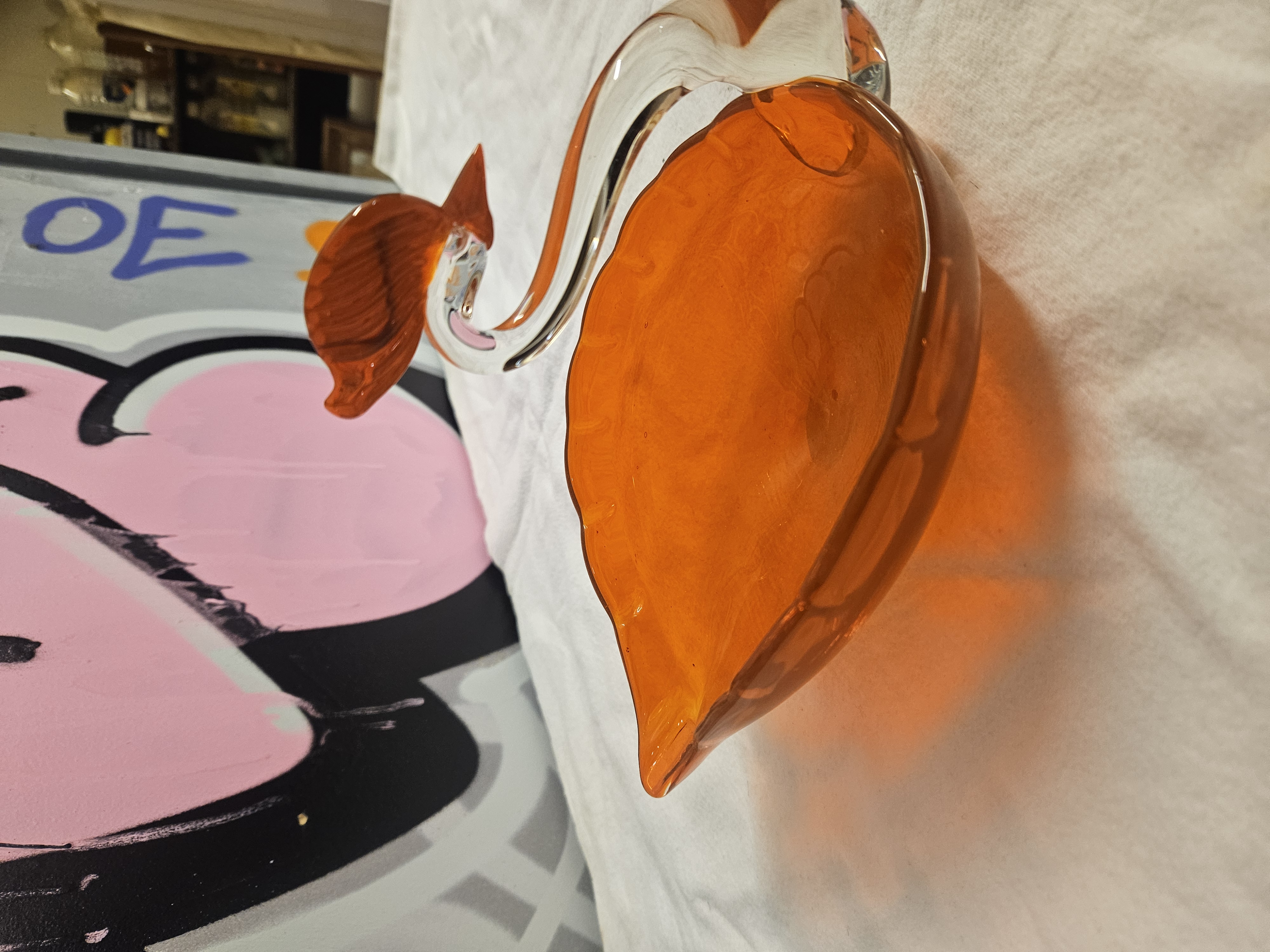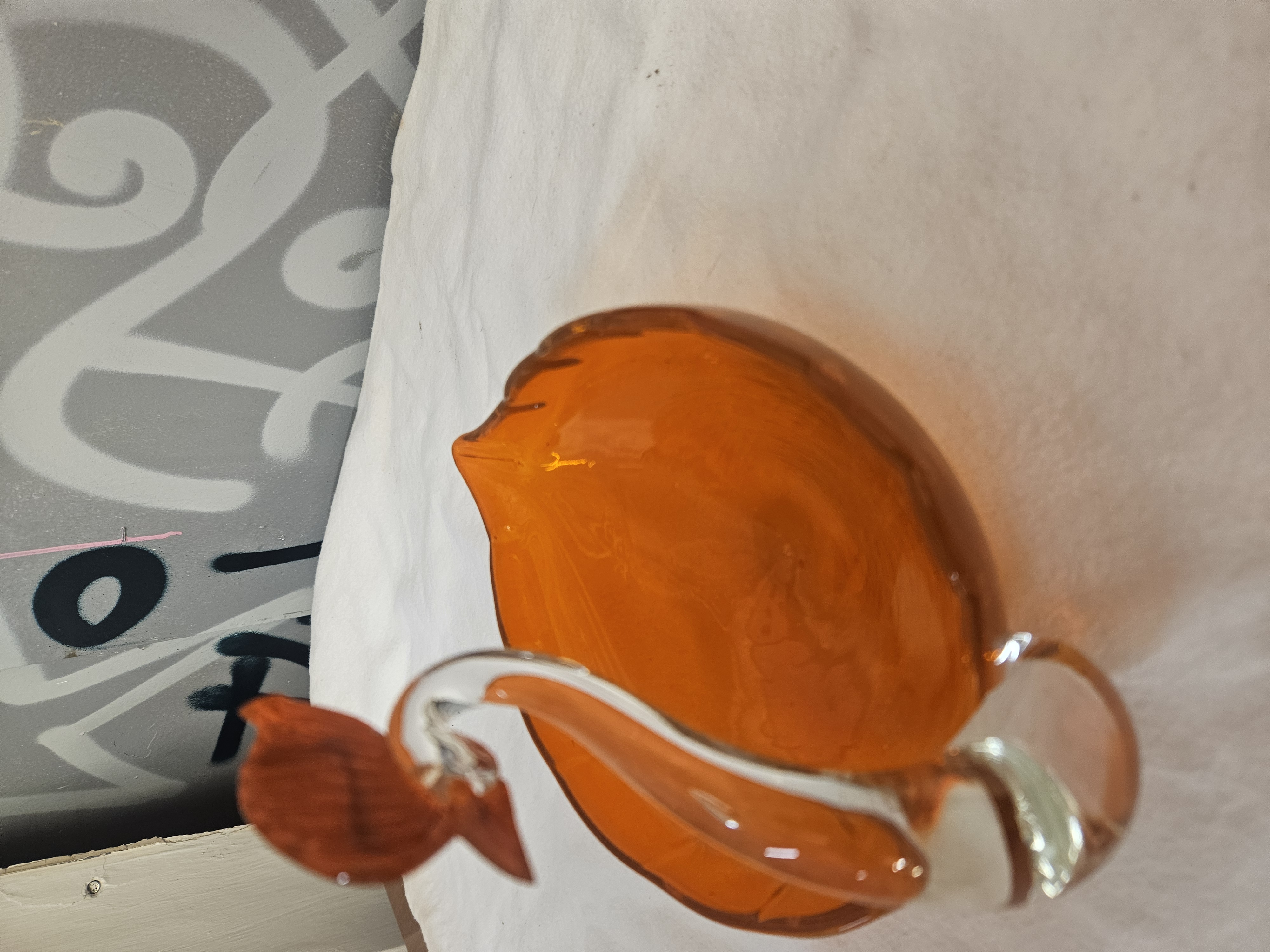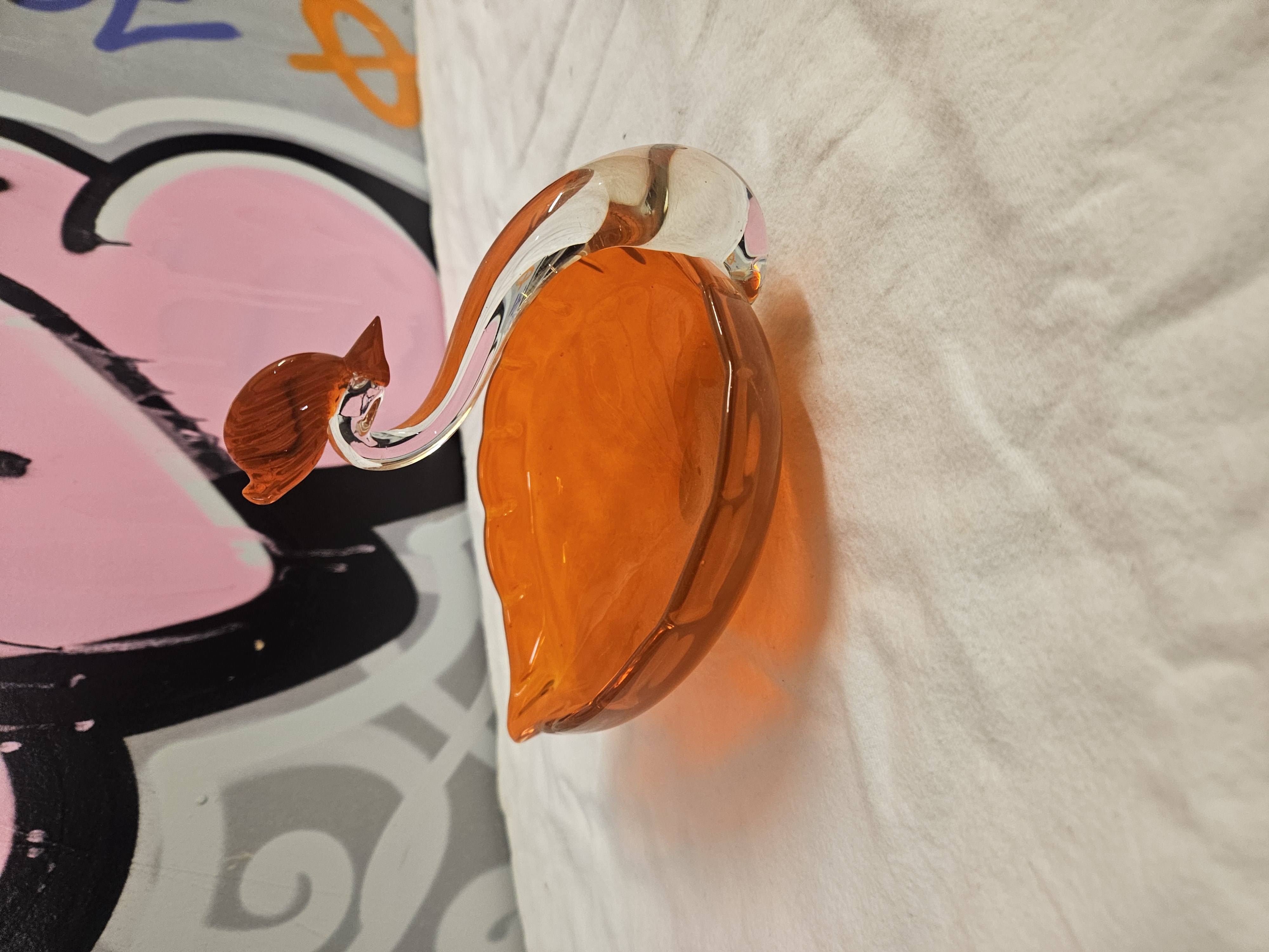 A hand-blown art glass dish formed as a stylised swan. The body is constructed from translucent amber-orange glass, often referred to as persimmon, shaped as a shallow leaf with a serrated or scalloped rim. A curved, clear glass neck is applied to the body, terminating in an amber-coloured crest and beak. The base shows signs of hand-finishing and surface wear. This piece is characteristic of mid-20th-century decorative glass and shares stylistic similarities with works produced by manufacturers such as Altaglass, Sooner Glass, and various Murano workshops. No maker’s marks, signatures, or labels are present on the item.