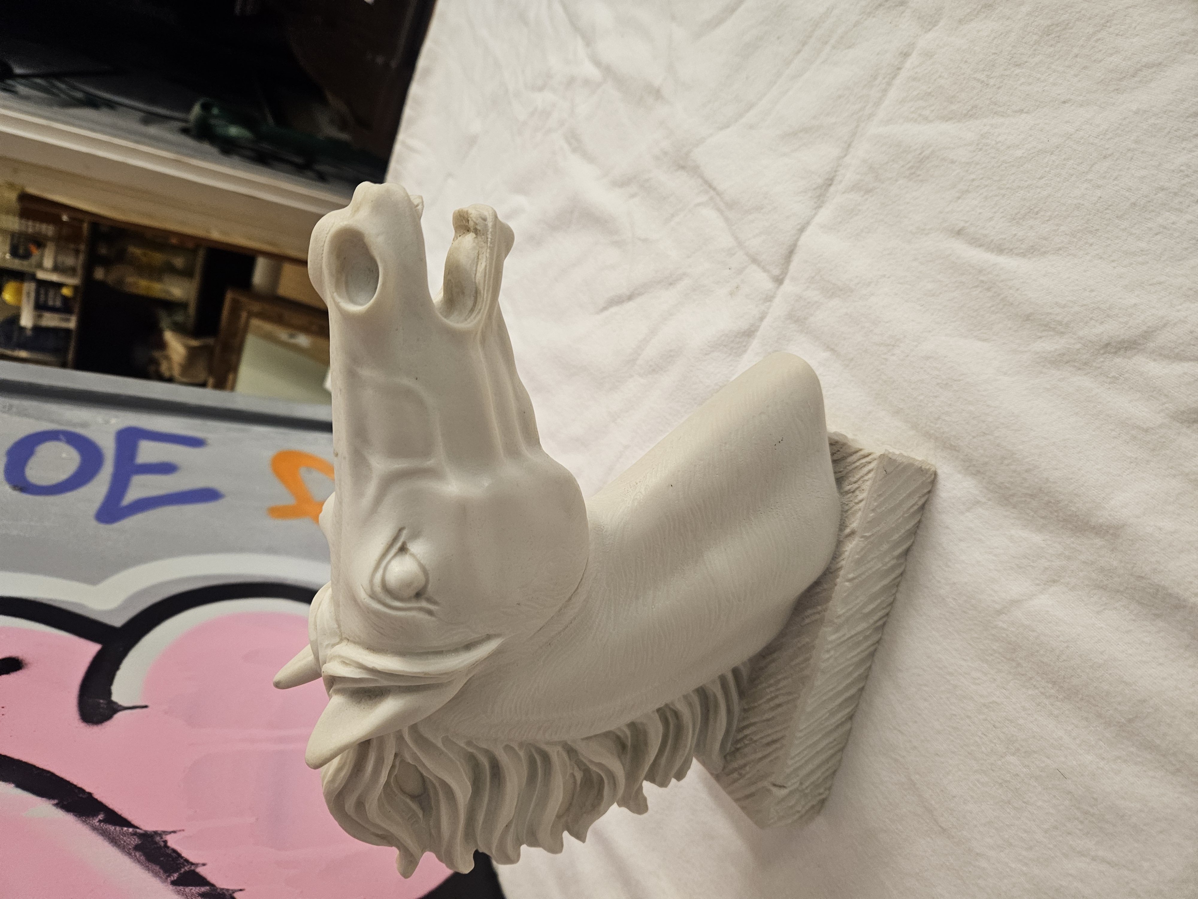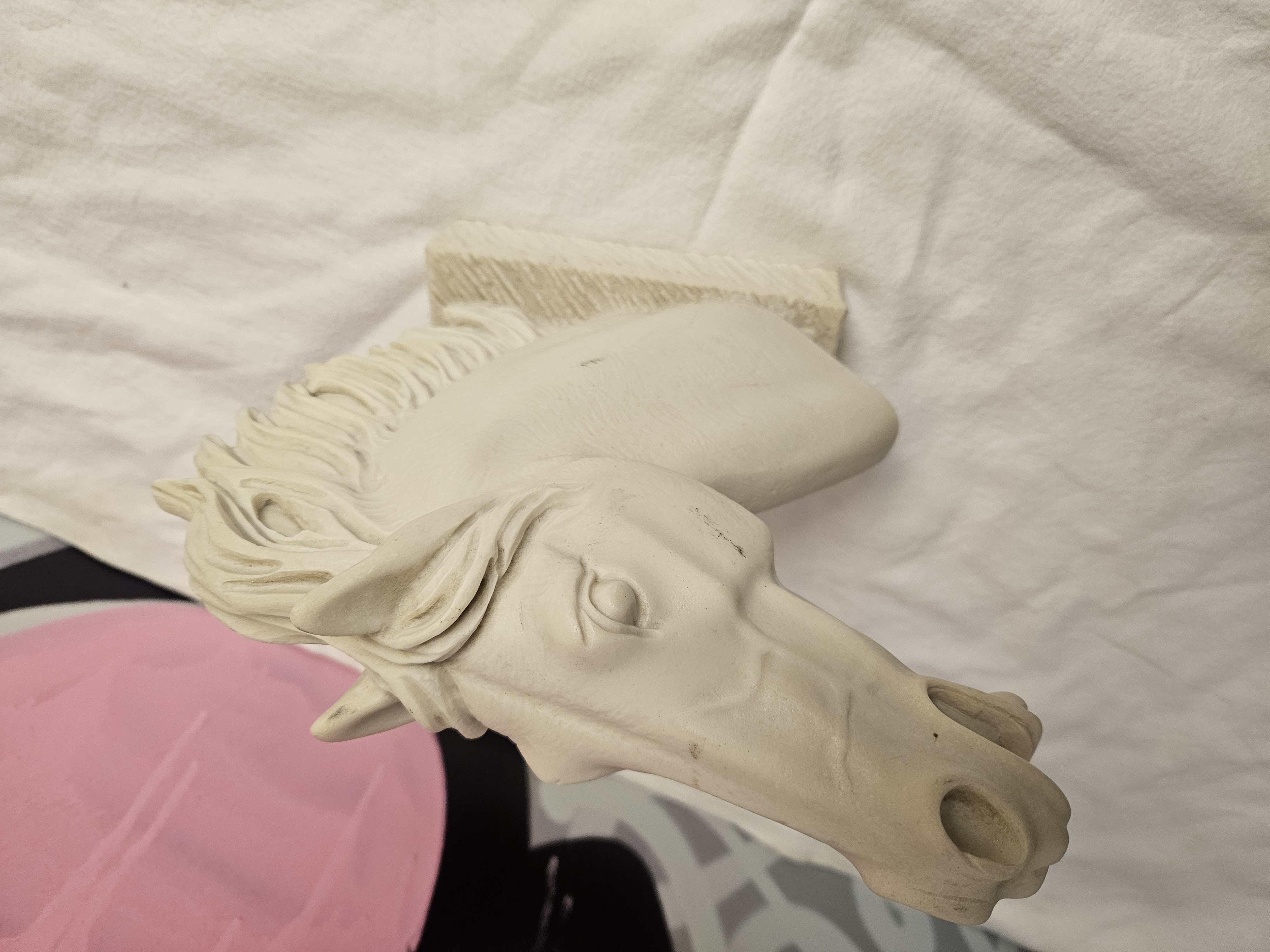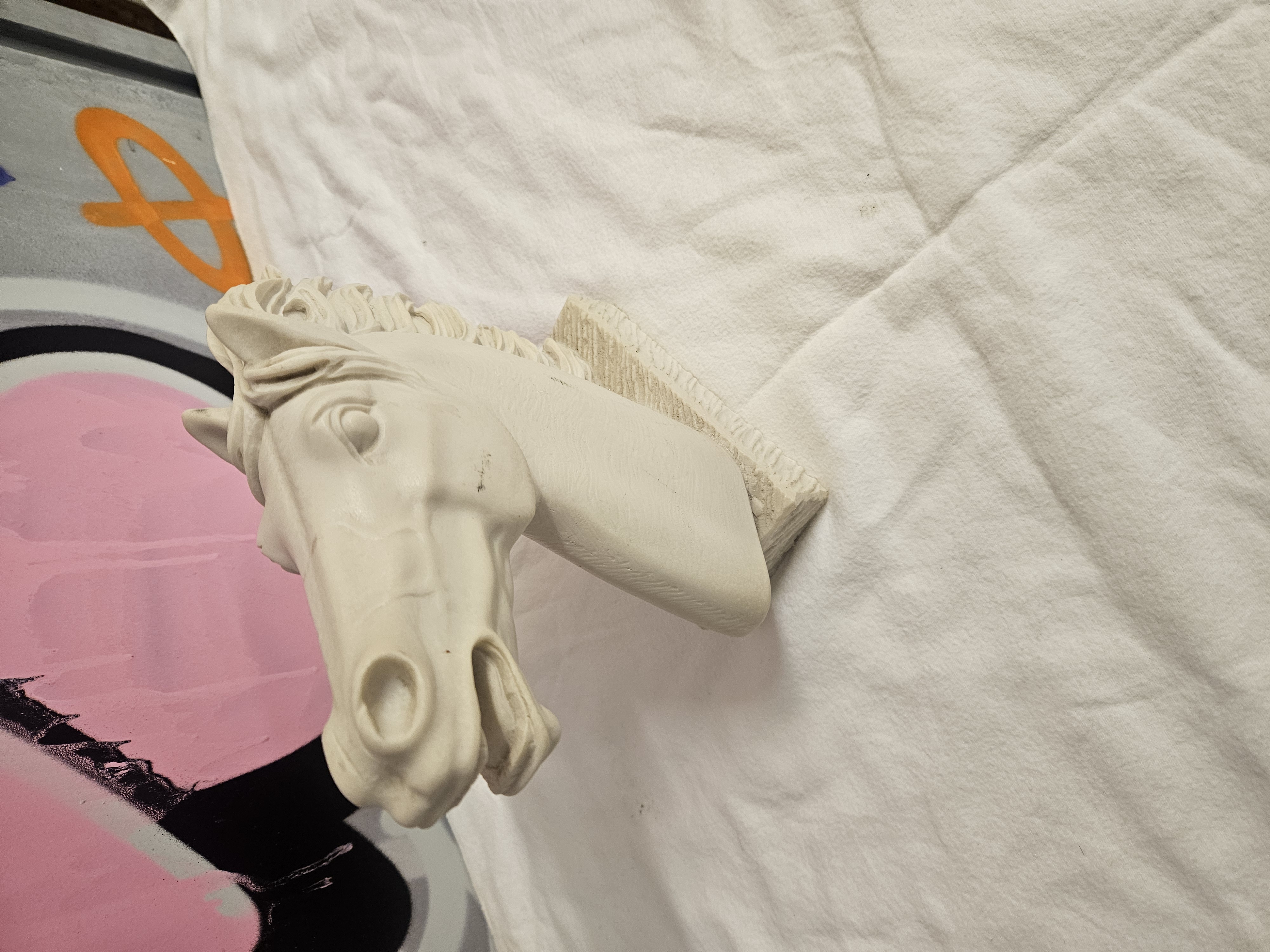 This sculptural reproduction depicts the head of the Horse of Selene, modelled after the original 5th-century BC Ancient Greek marble from the Parthenon. The piece is cast in plaster or a fine composite resin, featuring a matte, off-white finish intended to mimic the appearance of weathered stone. The sculpture is presented on an integrated, roughly-textured rectangular plinth. No maker’s marks, signatures, or edition numbers are visible on the exterior of the casting.